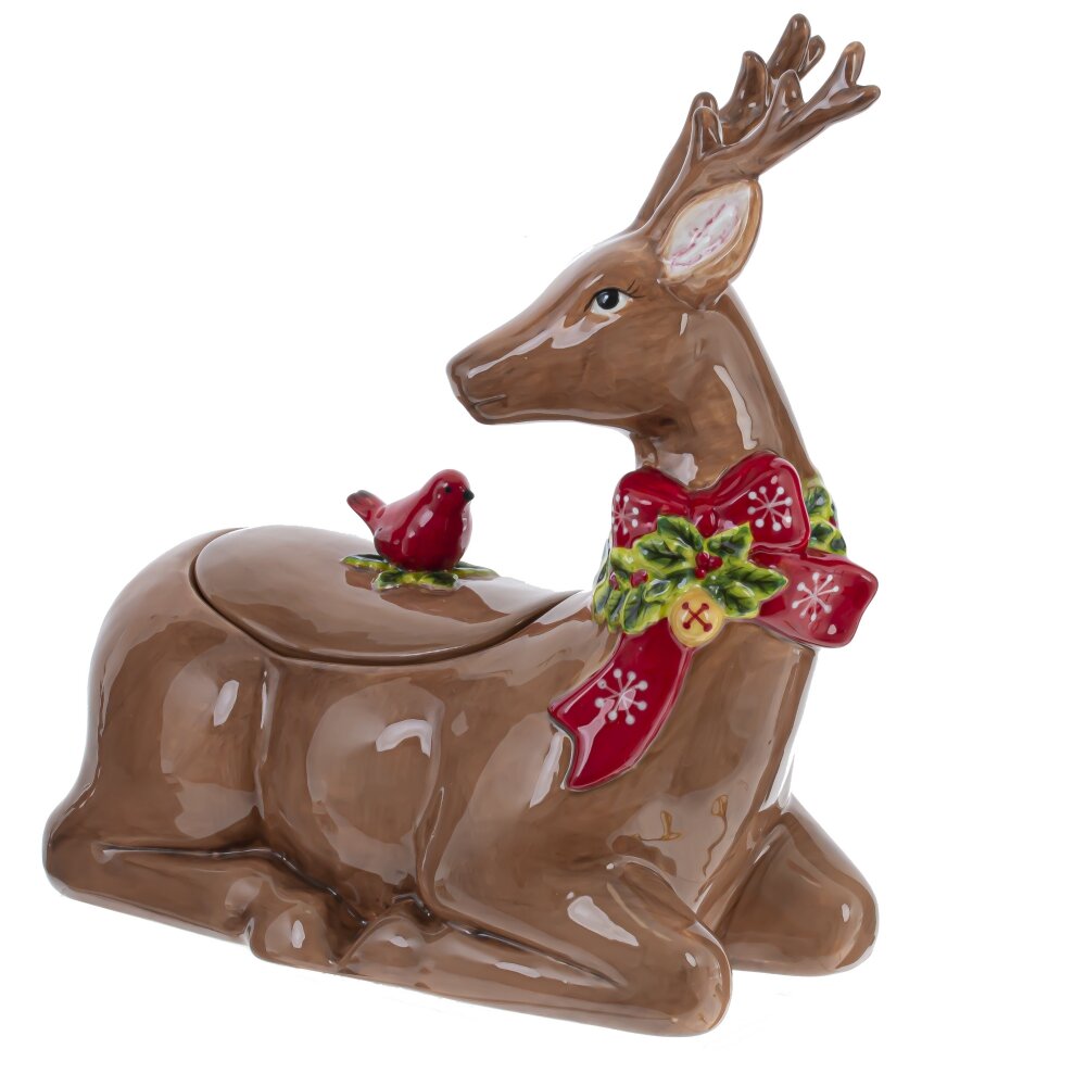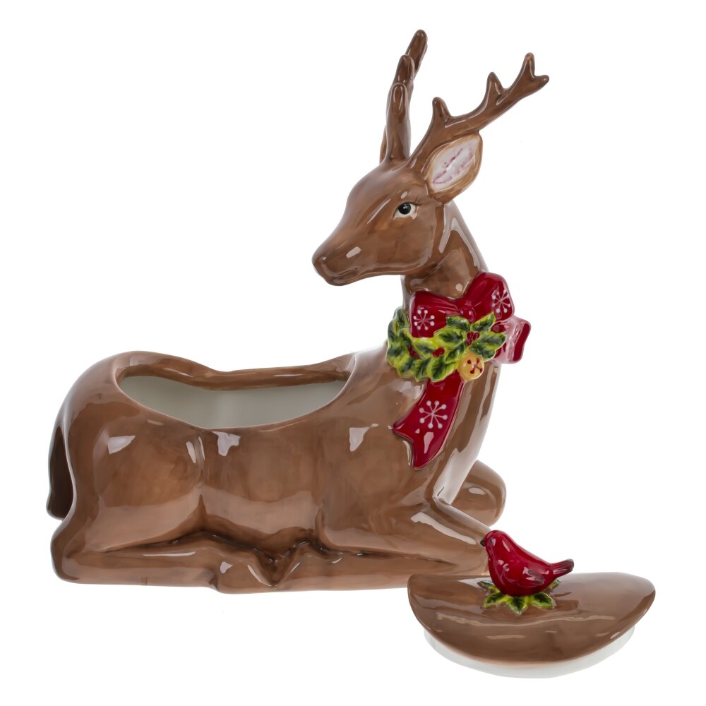 Конфетница "Олень" — изысканный элемент декора, созданный из керамики с глянцевым покрытием. С объемом 1400 мл, она прекрасно вмещает разнообразные сладости. Очаровательный дизайн изображает оленя в спокойной позе, а крышка с ручкой в виде крошечной красной птички на спине оленя добавляет особое очарование. Ярко-красный бант с зелеными акцентами гармонично завершает образ, придавая изделию праздничный вид. Этот аксессуар станет великолепным дополнением новогоднего стола или прекрасным подарком для друзей и близких в период праздников.
