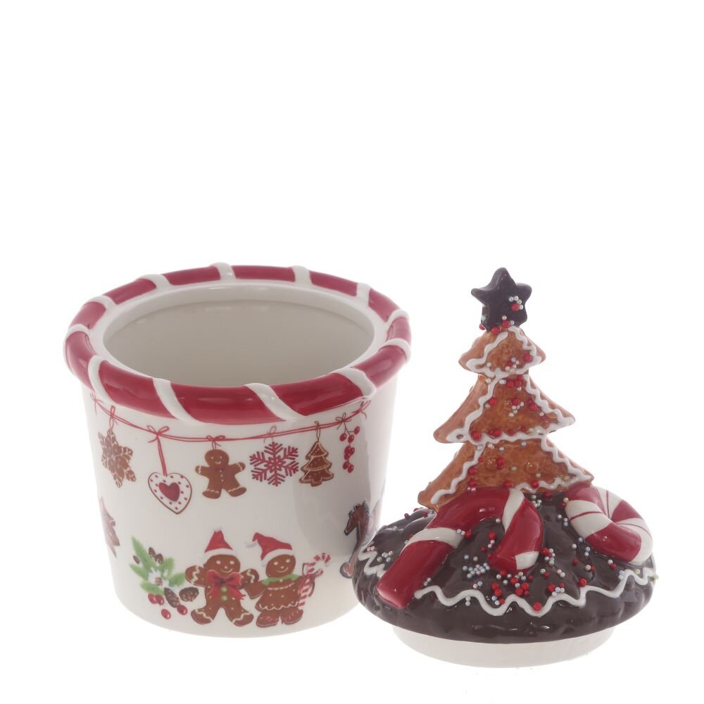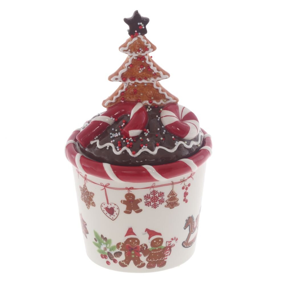Конфетница из серии посуды "Пряничное настроение" с изображением веселых новогодних пряничных человечков. Крышка конфетницы выполнена в форме новогоднего пряника, украшенного елкой и конфетами.