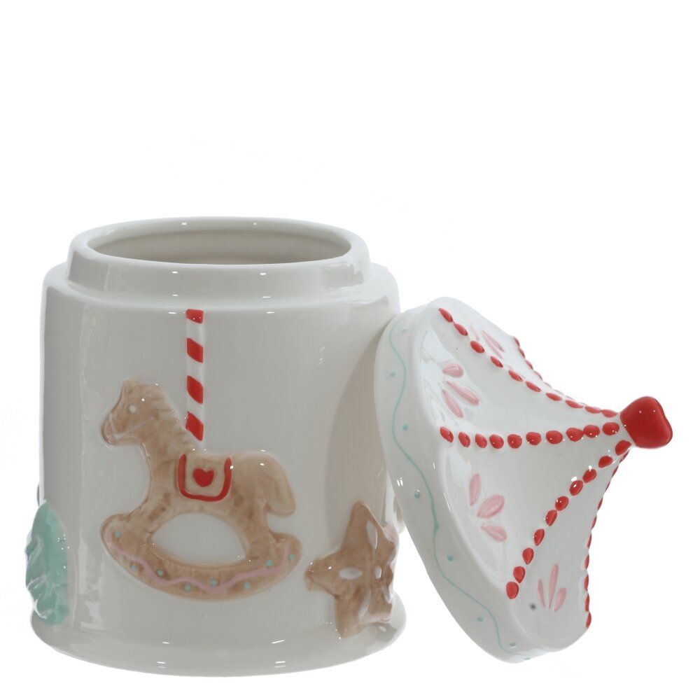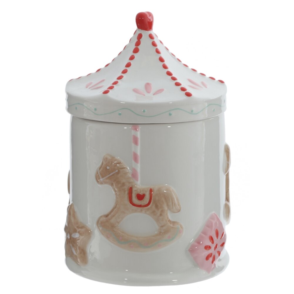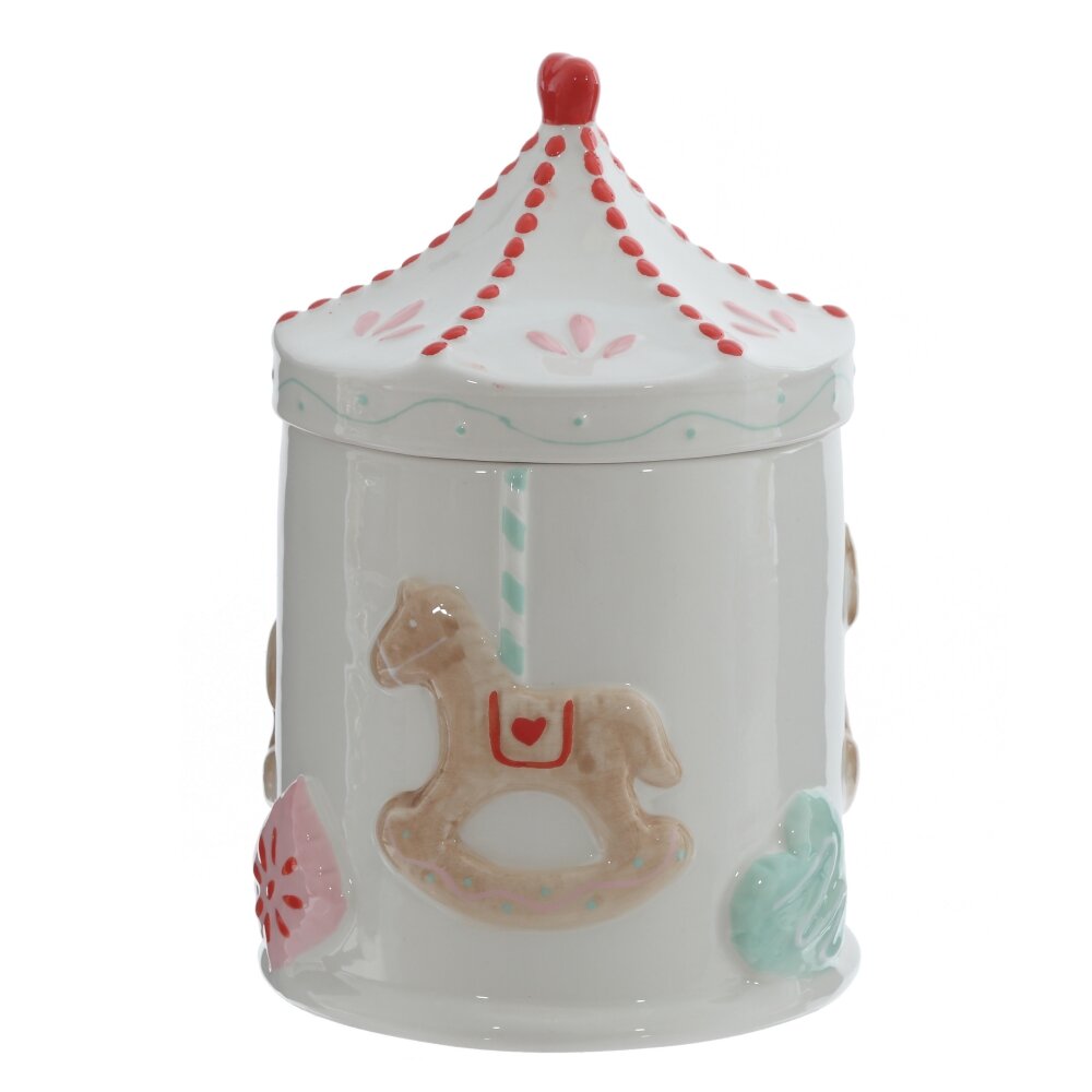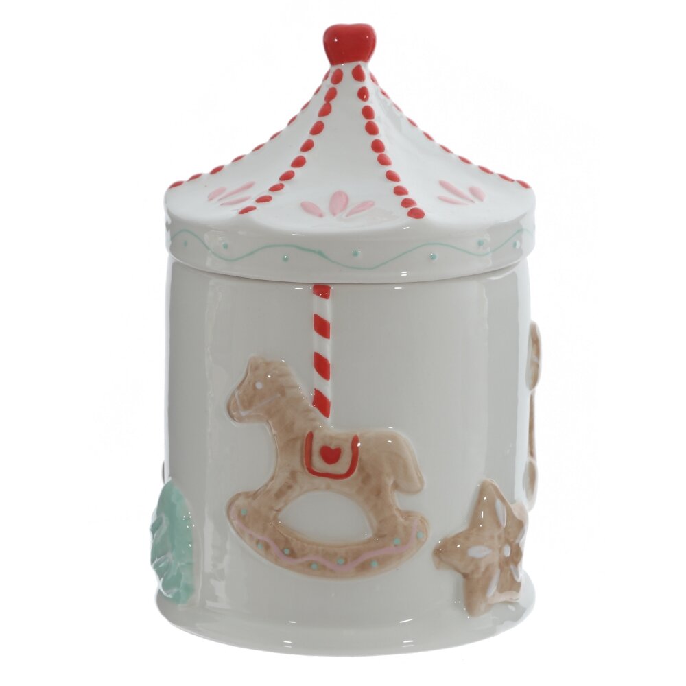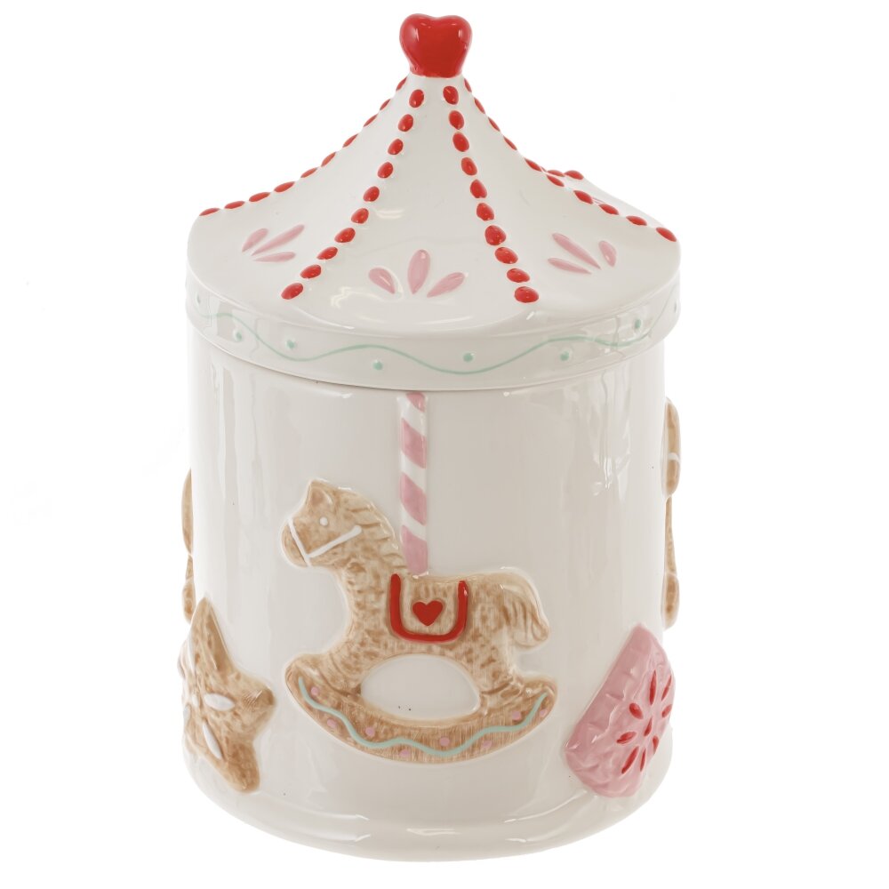 Очаровательная керамическая конфетница «Пряник» объемом 1550 мл выполнена в виде мини?карусели. Крышка напоминает купол с красными точками и сердечком?ручкой, стенки украшены рельефными пряниками: лошадкой?качалкой, звездой и сладостями. Глянцевая белая глазурь с розовыми и мятными акцентами создает праздничное настроение. Подходит для хранения конфет, печенья и пряников, станет милым акцентом на кухне, на новогоднем или детском сладком столе. Прекрасная идея для подарка.