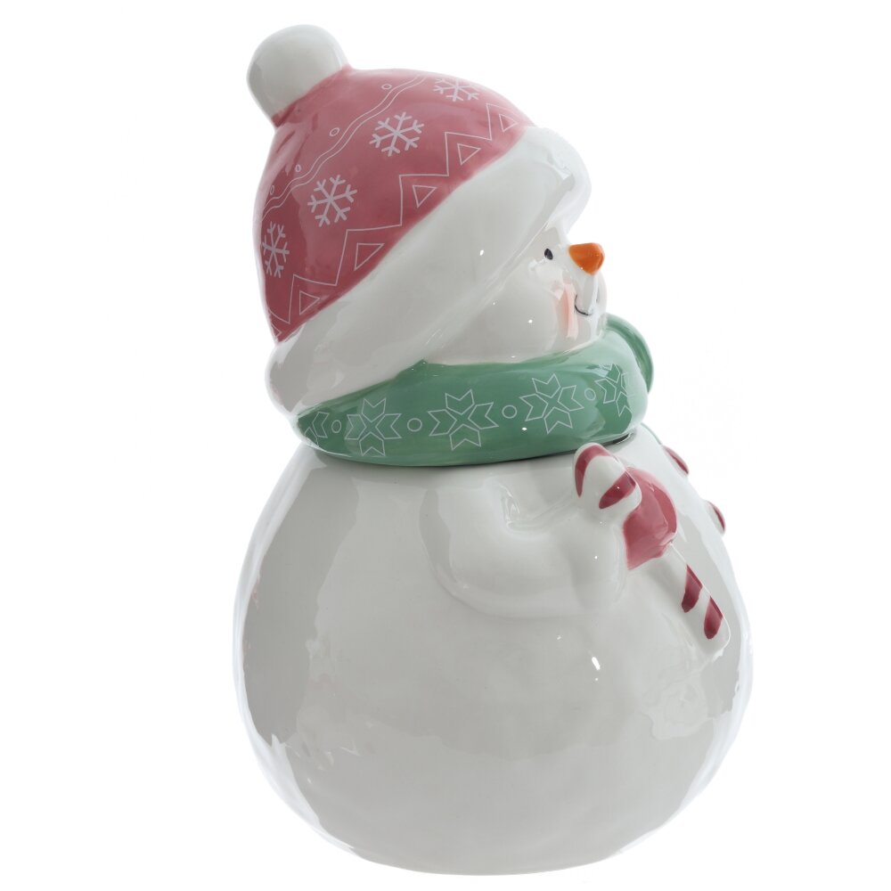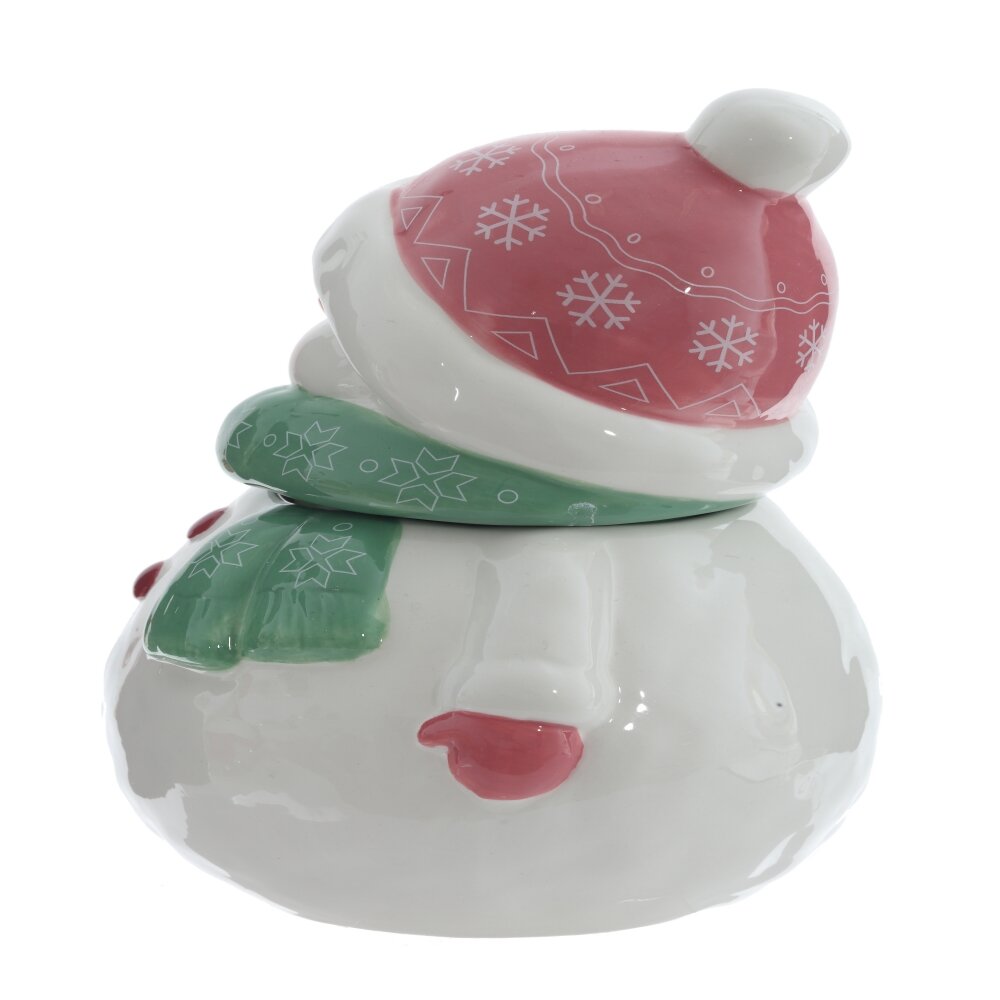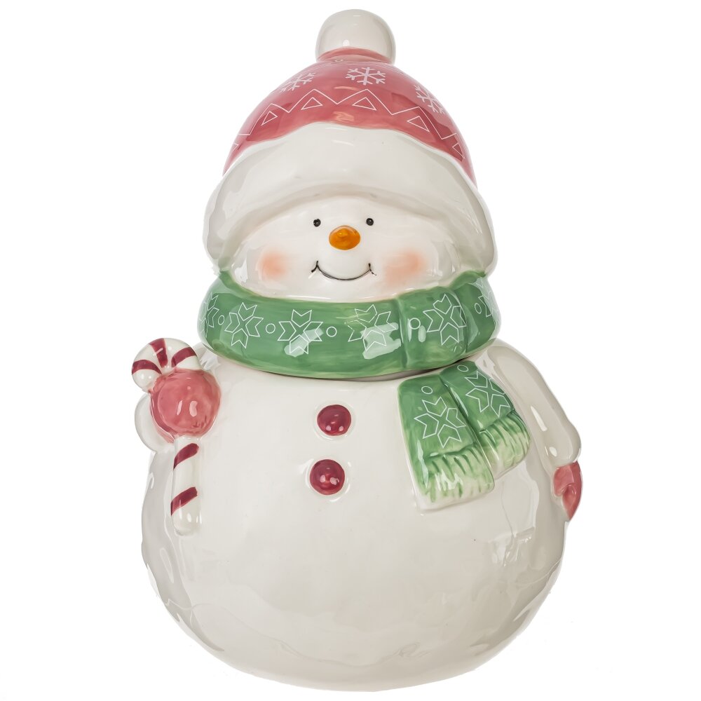 Очаровательная конфетница в виде улыбающегося снеговика, выполненная из керамики с глянцевой глазурью. Объем 900 мл — достаточно для ассорти конфет, печенья или маршмеллоу. Шапка с узором снежинок служит крышкой, зеленый шарф и красные пуговицы добавляют зимнего настроения, а леденец в руке — игривой нотки. Устойчивая форма удобно размещается на столе или полке, гладкая поверхность легко очищается вручную. Идеальна для сервировки праздничного стола, ежедневных чаепитий и в качестве милого новогоднего подарка детям и взрослым. Превратит кухню или офис в уютный уголок и сохранит сладости под рукой.