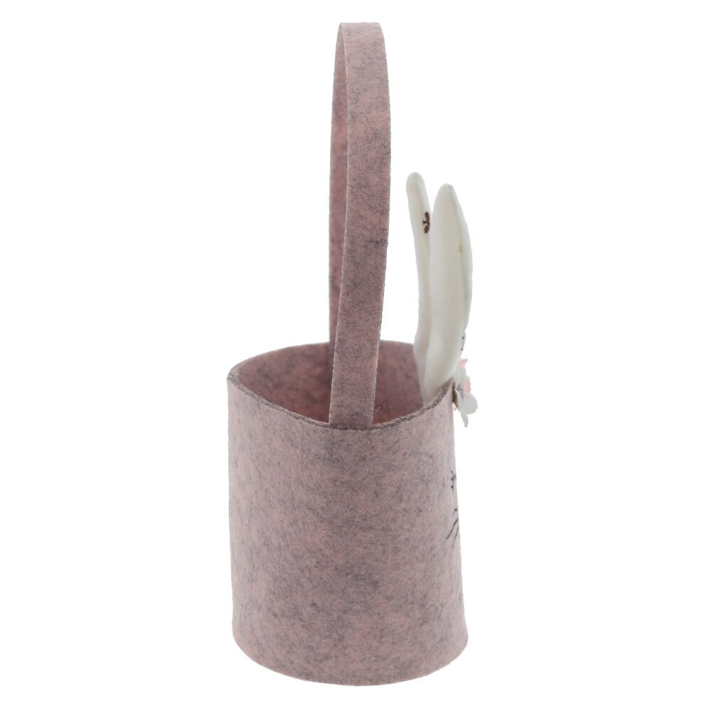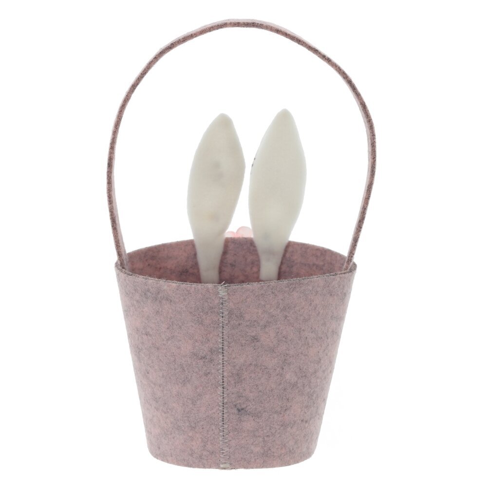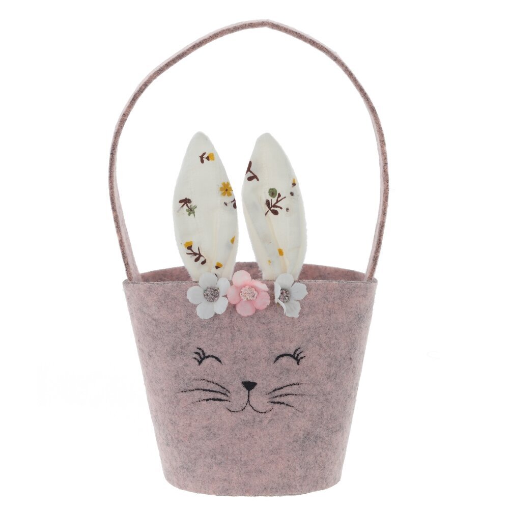 Эта очаровательная пасхальная корзинка выполнена из текстильных материалов и украшена в виде милого кролика. Она изготовлена из мягкого войлока нежного розового оттенка, а на передней части вышито улыбающееся мордочка зайчика. Из верхней части корзинки выглядывают два текстильных ушка с цветочным принтом, что придает аксессуару дополнительную нарядность. Декоративные цветы у основания ушек дополняют композицию, создавая праздничное и весеннее настроение. Удобная ручка позволяет легко переносить корзину. Эта корзинка идеально подойдет для сбора пасхальных яиц, сладостей или подарков, а также станет стильным украшением интерьера на праздник.