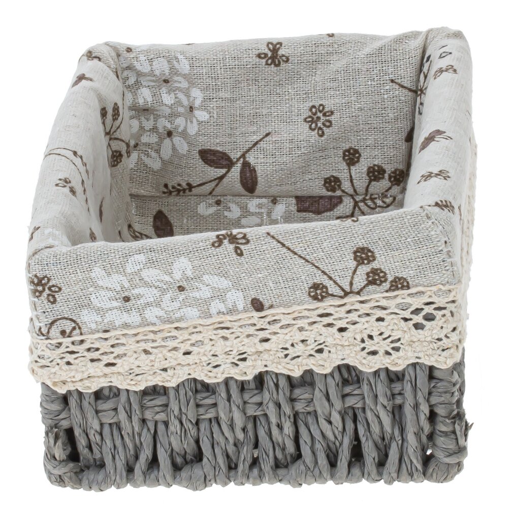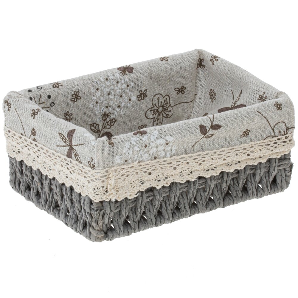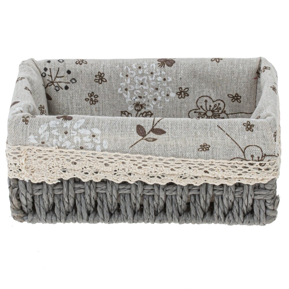Прямоугольная корзина-органайзер. Основание сплетено из натуральных материалов, окрашенных в графитово-серый цвет; плетение плотное, аккуратное. Для жесткости и долговечности внутри предусмотрен тонкий металлический каркас. Внутри — мягкая текстильная вкладка с бежевым фоном и коричневым цветочно-травяным рисунком, верх украшен кремовой кружевной тесьмой. Корзина сочетает натуральное плетение, текстильные материалы и металл, благодаря чему одновременно выглядит уютно и остается прочной. Подходит для хранения белья, косметики, аксессуаров, пряжи или детских вещей, гармонично вписывается в интерьеры в стиле эко, прованс и сканди.