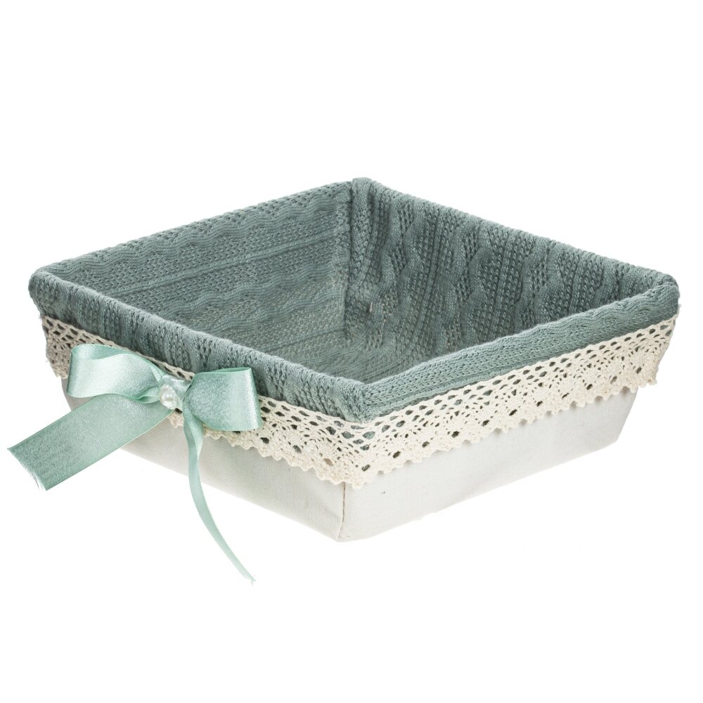 Элегантная пасхальная корзина квадратной формы из полимерных и текстильных материалов станет стильным украшением праздничного стола. Жёсткий каркас из прочного полимера надёжно удерживает форму, а мягкая внутренняя отделка из текстиля с фактурной «вязаной» поверхностью бережно относится к яйцам, куличам и сладостям. Нежное кружево по краю и декоративный бантик пастельного мятного оттенка придают изделию утончённый, по?домашнему тёплый вид. Корзину удобно использовать для сервировки, подарочных наборов и тематического декора к Пасхе, а также для хранения мелочей в интерьере.