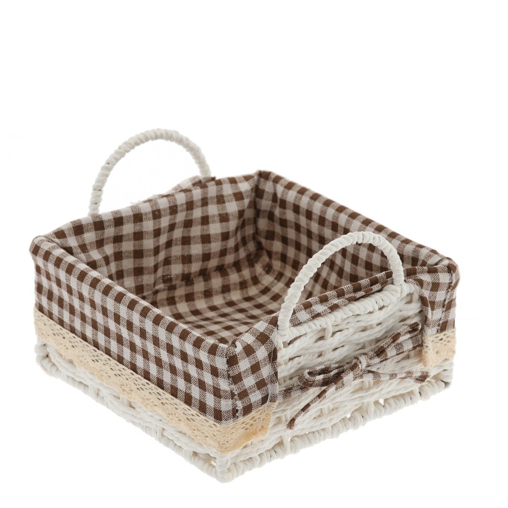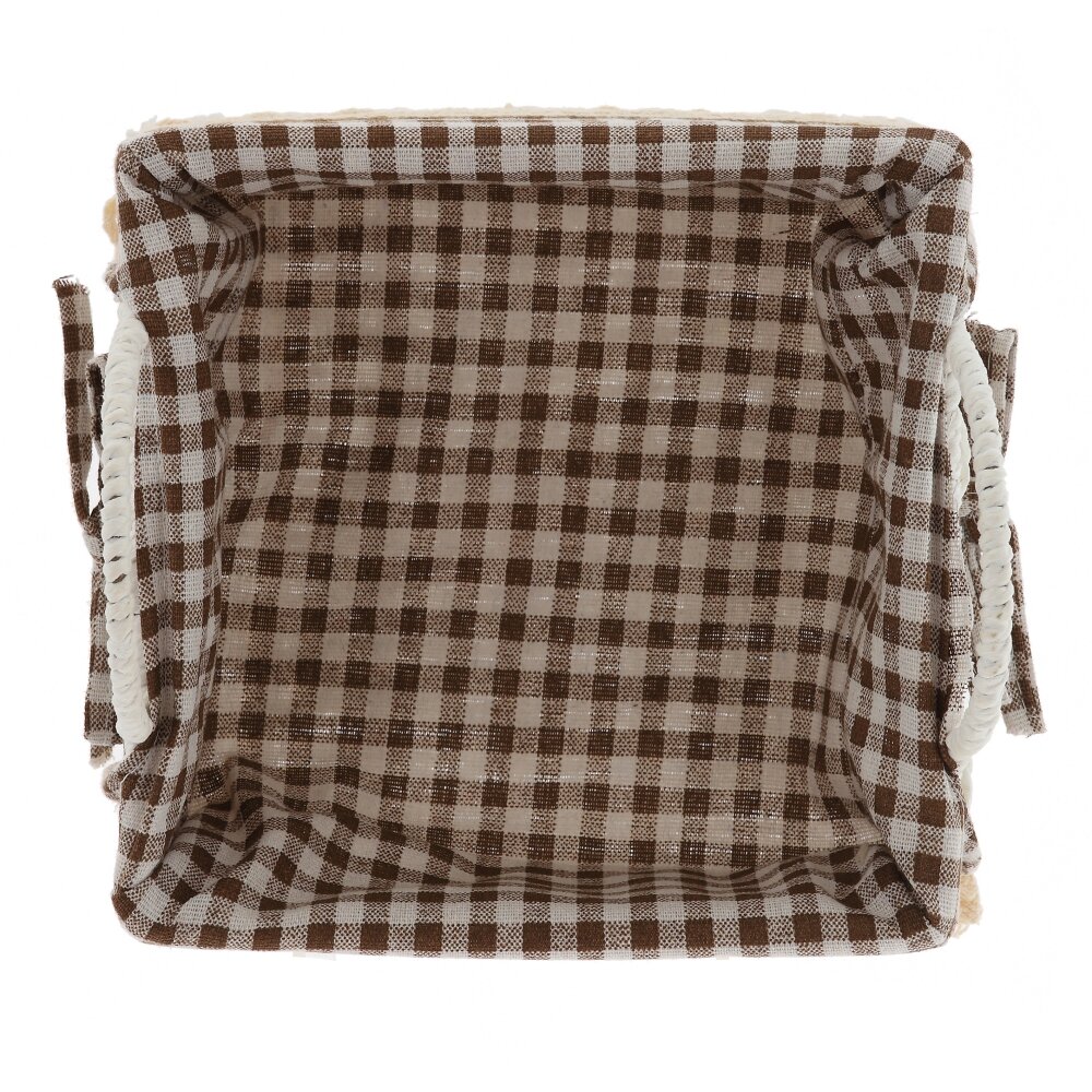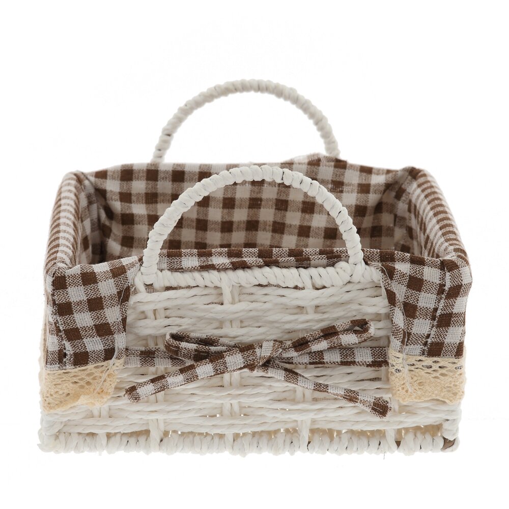 Стильная корзина – практичный и декоративный аксессуар для дома. Основа выполнена из прочного светлого плетения. Внутри – текстильный чехол в коричнево-белую клетку, который легко вынимается и стирается при необходимости. Две удобные ручки позволяют без труда переносить корзину. Изделие идеально подходит для хранения косметики, мелких аксессуаров, рукоделия, чайных пакетиков, сладостей или хлебобулочных изделий на кухне. Корзина компактна, не занимает много места на полке или столе и одновременно служит уютным элементом декора, подчеркивающим атмосферу кухни, гостиной, спальни или дачного домика.