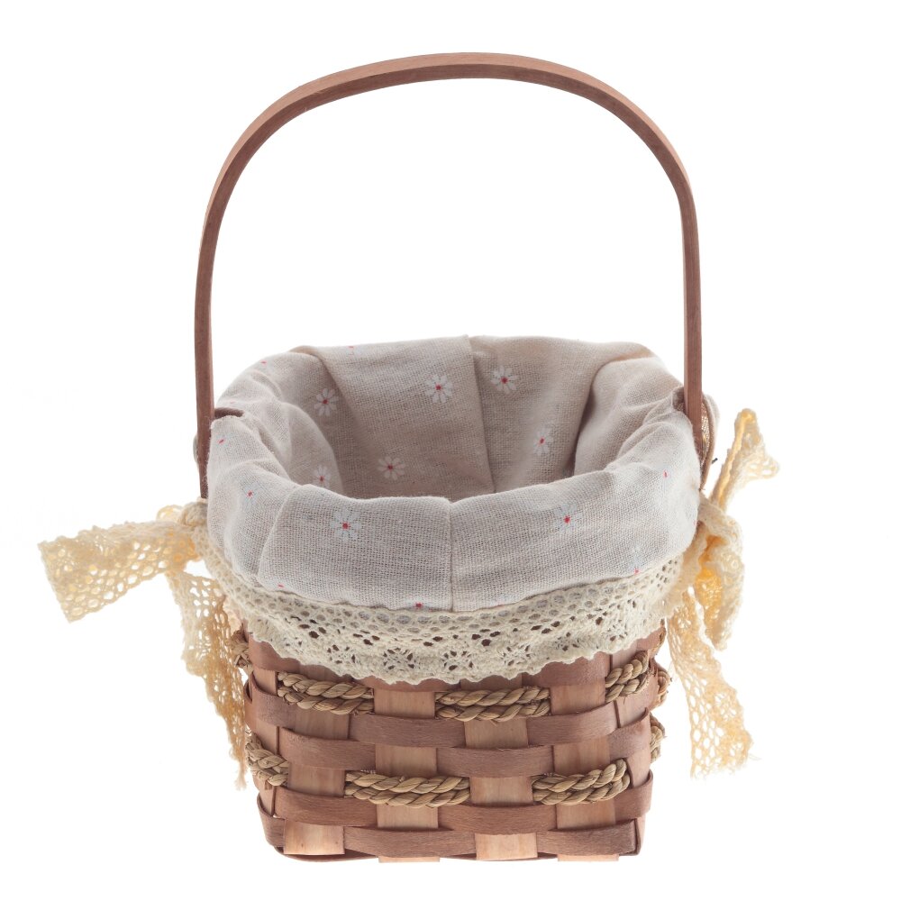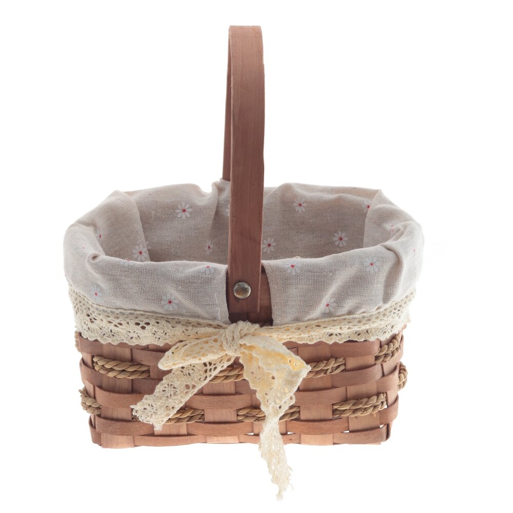 Очаровательная декоративная корзина с плотным плетением. Внутренняя часть оформлена текстильной вставкой из светлой ткани с мелким цветочным узором, что придаёт изделию уютный, деревенский шарм. Вставка украшена кружевной тесьмой и бантом. Удобная деревянная ручка надёжно закреплена прочными металлическими креплениями. Корзина подойдёт для хранения мелочей, косметики, рукодельных принадлежностей или оформления подарков и фотозон. Стильный и практичный аксессуар для дома, дачи или праздников.