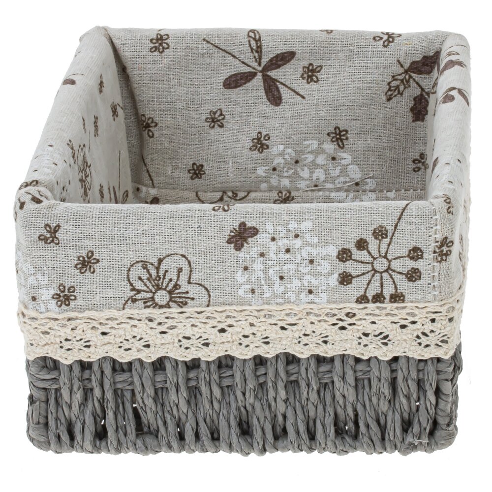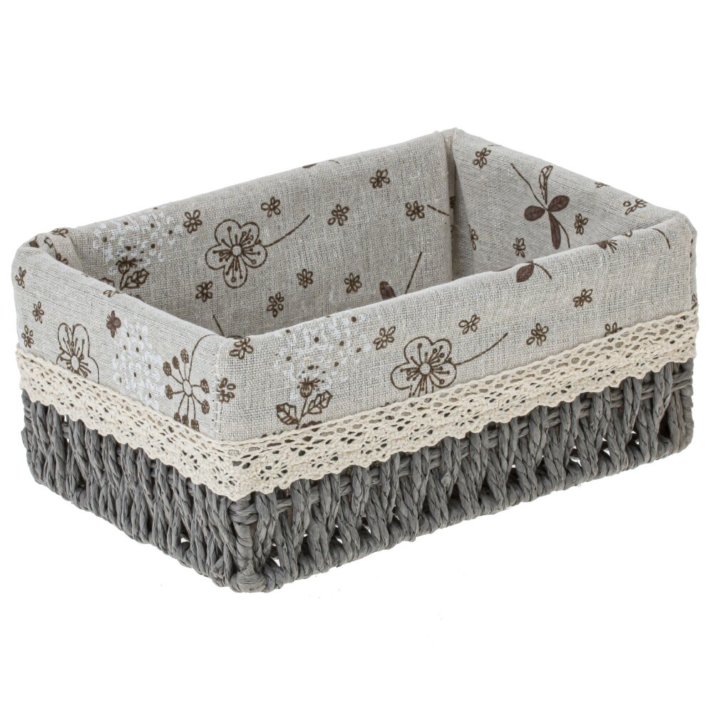 Прямоугольная корзина-органайзер. Основание сплетено из натуральных материалов, окрашенных в графитово-серый цвет; плетение плотное, аккуратное. Для жесткости и долговечности внутри предусмотрен тонкий металлический каркас. Внутри — мягкая текстильная вкладка с бежевым фоном и коричневым цветочно-травяным рисунком, верх украшен кремовой кружевной тесьмой. Корзина сочетает натуральное плетение, текстильные материалы и металл, благодаря чему одновременно выглядит уютно и остается прочной. Подходит для хранения белья, косметики, аксессуаров, пряжи или детских вещей, гармонично вписывается в интерьеры в стиле эко, прованс и сканди.