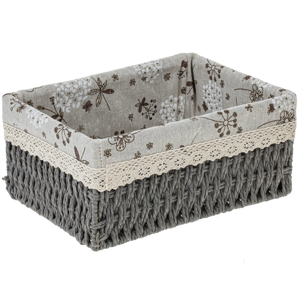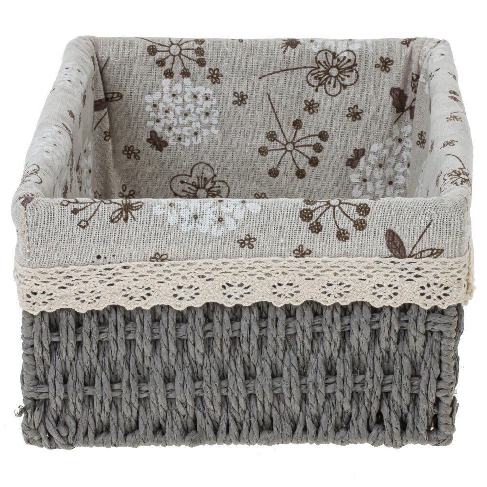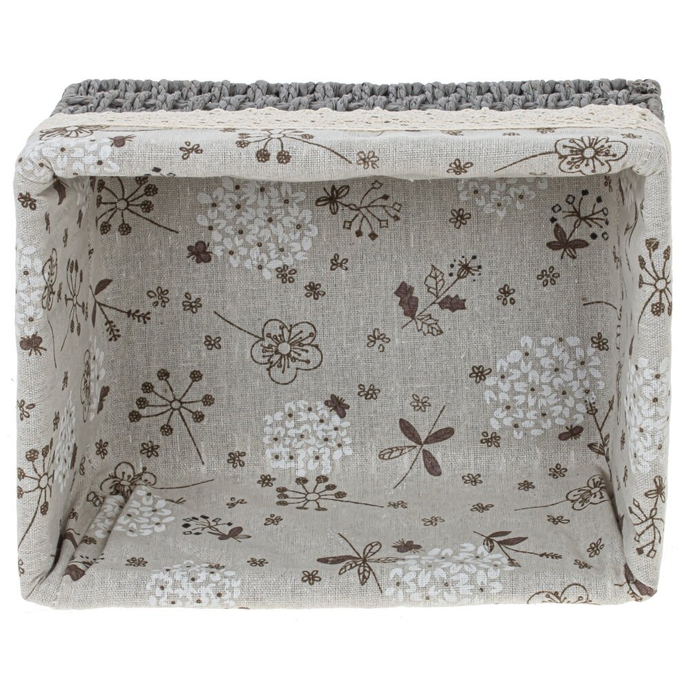 Прямоугольная корзина-органайзер. Основание сплетено из натуральных материалов, окрашенных в графитово?серый цвет; плетение плотное, аккуратное. Для жесткости и долговечности внутри предусмотрен тонкий металлический каркас. Внутри — мягкая текстильная вкладка с бежевым фоном и коричневым цветочно-травяным рисунком, верх украшен кремовой кружевной тесьмой. Корзина сочетает натуральное плетение, текстильные материалы и металл, благодаря чему одновременно выглядит уютно и остается прочной. Подходит для хранения белья, косметики, аксессуаров, пряжи или детских вещей, гармонично вписывается в интерьеры в стиле эко, прованс и сканди.