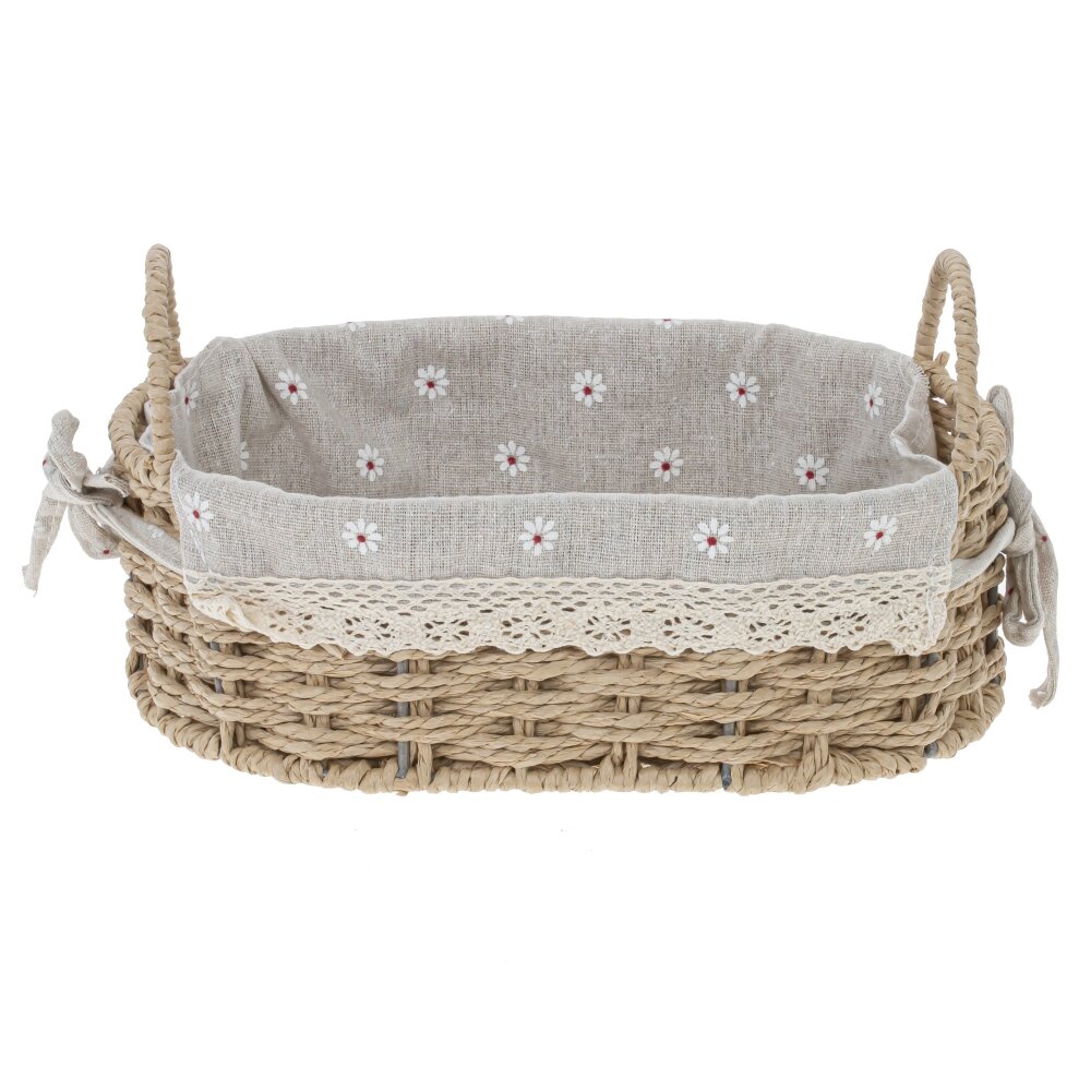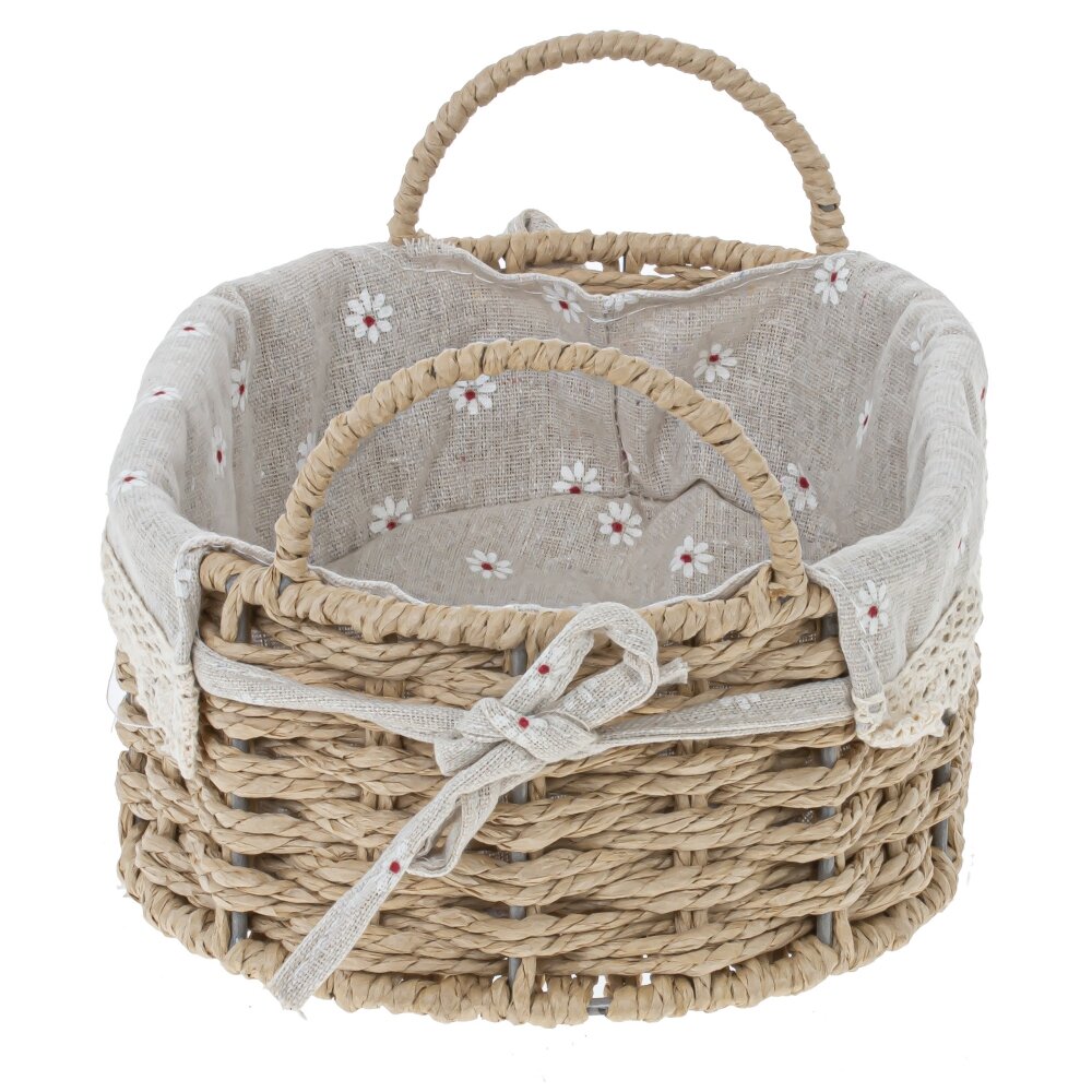 Элегантная корзина из натуральных материалов для уютного дома. Основание выполнено с аккуратным ручным плетением; форму стабилизирует скрытый металлический каркас , благодаря чему корзина не деформируется при нагрузке. Внутри — съемный текстильный чехол с мелким цветочным рисунком и кружевной отделкой; завязки по бокам позволяют надежно фиксировать его и легко снимать для стирки. Две витые ручки удобны для переноса. Подходит для сервировки хлеба и фруктов, хранения полотенец, косметики или аксессуаров в спальне, ванной и на кухне. Нейтральные оттенки и натуральная фактура подчеркнут стиль прованс, эко или кантри.