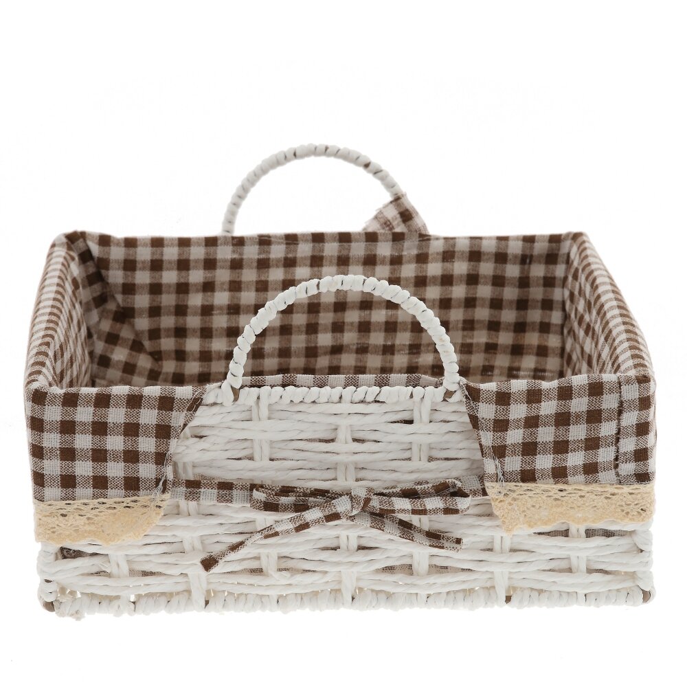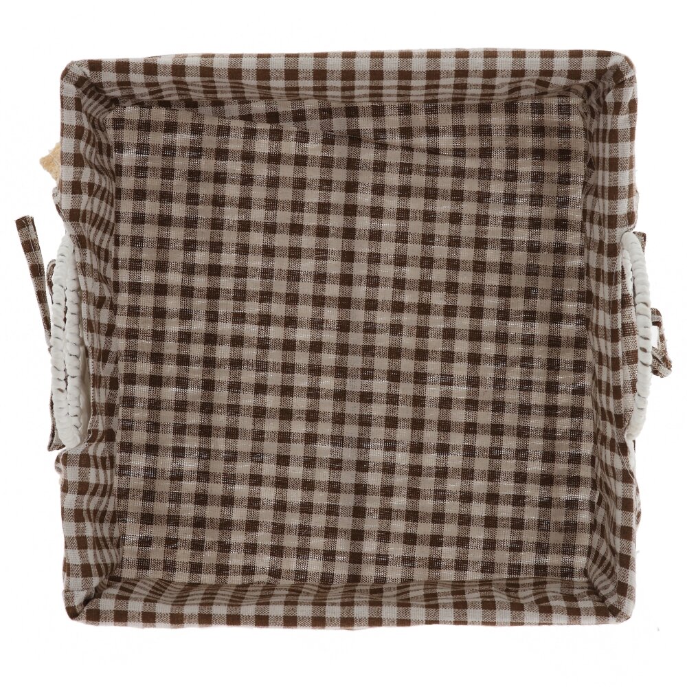 Стильная корзина – практичный и декоративный аксессуар для дома. Основа выполнена из прочного светлого плетения. Внутри – текстильный чехол в коричнево-белую клетку, который легко вынимается и стирается при необходимости. Две удобные ручки позволяют без труда переносить корзину. Изделие идеально подходит для хранения косметики, мелких аксессуаров, рукоделия, чайных пакетиков, сладостей или хлебобулочных изделий на кухне. Корзина компактна, не занимает много места на полке или столе и одновременно служит уютным элементом декора, подчеркивающим атмосферу кухни, гостиной, спальни или дачного домика.
