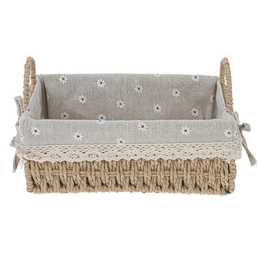 Элегантная корзина из натуральных материалов для уютного дома. Основание выполнено с аккуратным ручным плетением; форму стабилизирует скрытый металлический каркас , благодаря чему корзина не деформируется при нагрузке. Внутри — съемный текстильный чехол с мелким цветочным рисунком и кружевной отделкой; завязки по бокам позволяют надежно фиксировать его и легко снимать для стирки. Две витые ручки удобны для переноса. Подходит для сервировки хлеба и фруктов, хранения полотенец, косметики или аксессуаров в спальне, ванной и на кухне. Нейтральные оттенки и натуральная фактура подчеркнут стиль прованс, эко или кантри.