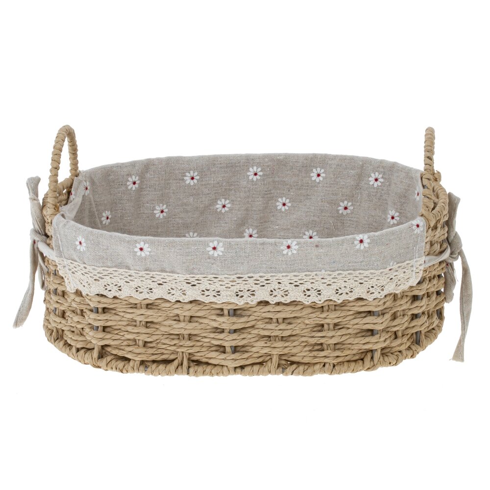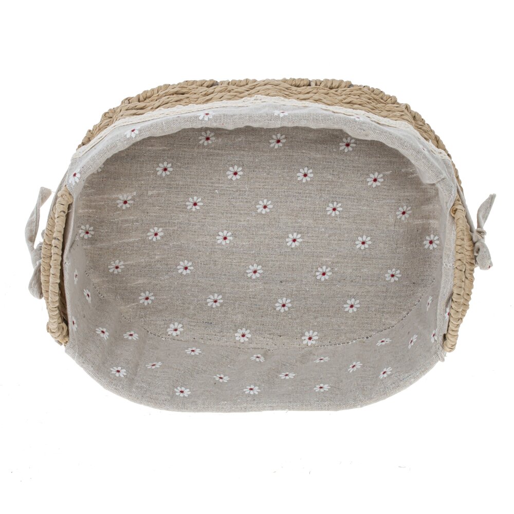 Элегантная корзина из натуральных материалов для уютного дома. Основание выполнено с аккуратным ручным плетением; форму стабилизирует скрытый металлический каркас , благодаря чему корзина не деформируется при нагрузке. Внутри — съемный текстильный чехол с мелким цветочным рисунком и кружевной отделкой; завязки по бокам позволяют надежно фиксировать его и легко снимать для стирки. Две витые ручки удобны для переноса. Подходит для сервировки хлеба и фруктов, хранения полотенец, косметики или аксессуаров в спальне, ванной и на кухне. Нейтральные оттенки и натуральная фактура подчеркнут стиль прованс, эко или кантри.