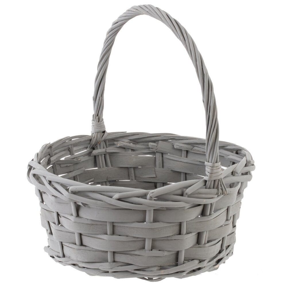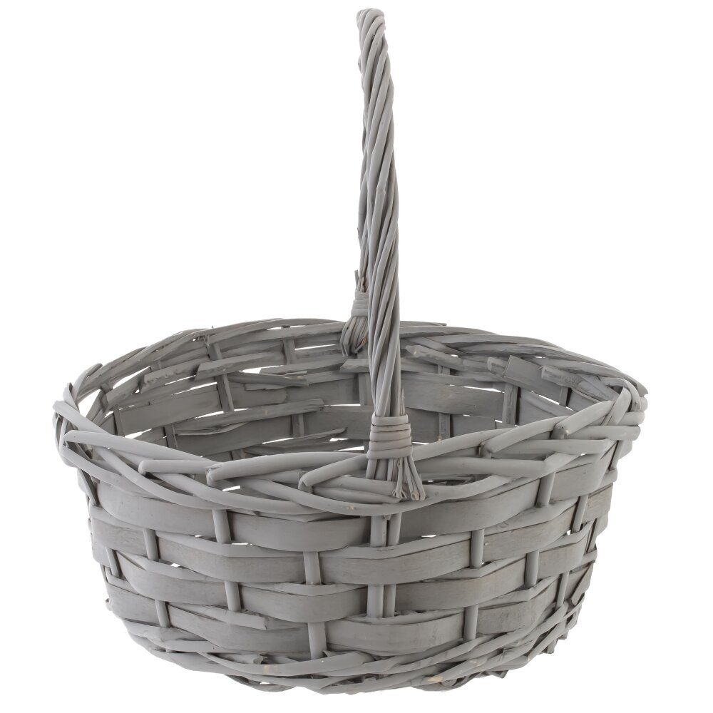 Классическая плетёная корзина серого цвета. Она изготовлена из натуральных материалов - лозы , ивовых прутьев, что придаёт ей особую прочность и лёгкость одновременно. Корзина имеет округлую форму и снабжена удобной ручкой, также выполненной из плетёных прутьев, что облегчает переноску. Такие корзины традиционно используются для сбора фруктов, овощей, ягод, а также для пикников или хранения различных домашних вещей. Благодаря своему натуральному и лаконичному дизайну она хорошо вписывается в интерьер дачи или загородного дома. Корзины подобного типа часто используются и в декоративных целях – для создания цветочных композиций, подарочных наборов, тематических фотосессий. Плетёные корзины высоко ценятся за экологичность, долговечность и эстетичный внешний вид, а также за то, что они создают атмосферу уюта и тепла в любом доме.