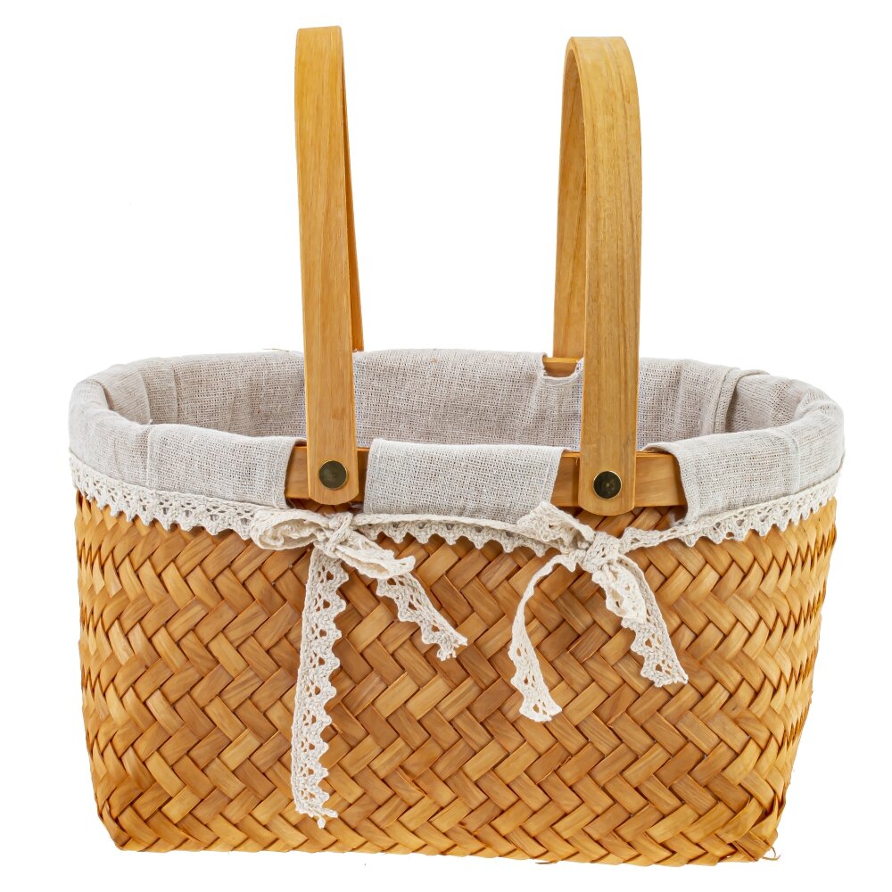 Очаровательная декоративная корзина с плотным плетением. Внутренняя часть оформлена текстильной вставкой из светлой ткани с мелким цветочным узором, что придаёт изделию уютный, деревенский шарм. Вставка украшена кружевной тесьмой и бантом. Удобные деревянные ручки надёжно закреплены прочными металлическими креплениями. Корзина подойдёт для хранения мелочей, косметики, рукодельных принадлежностей или оформления подарков и фотозон. Стильный и практичный аксессуар для дома, дачи или праздников.