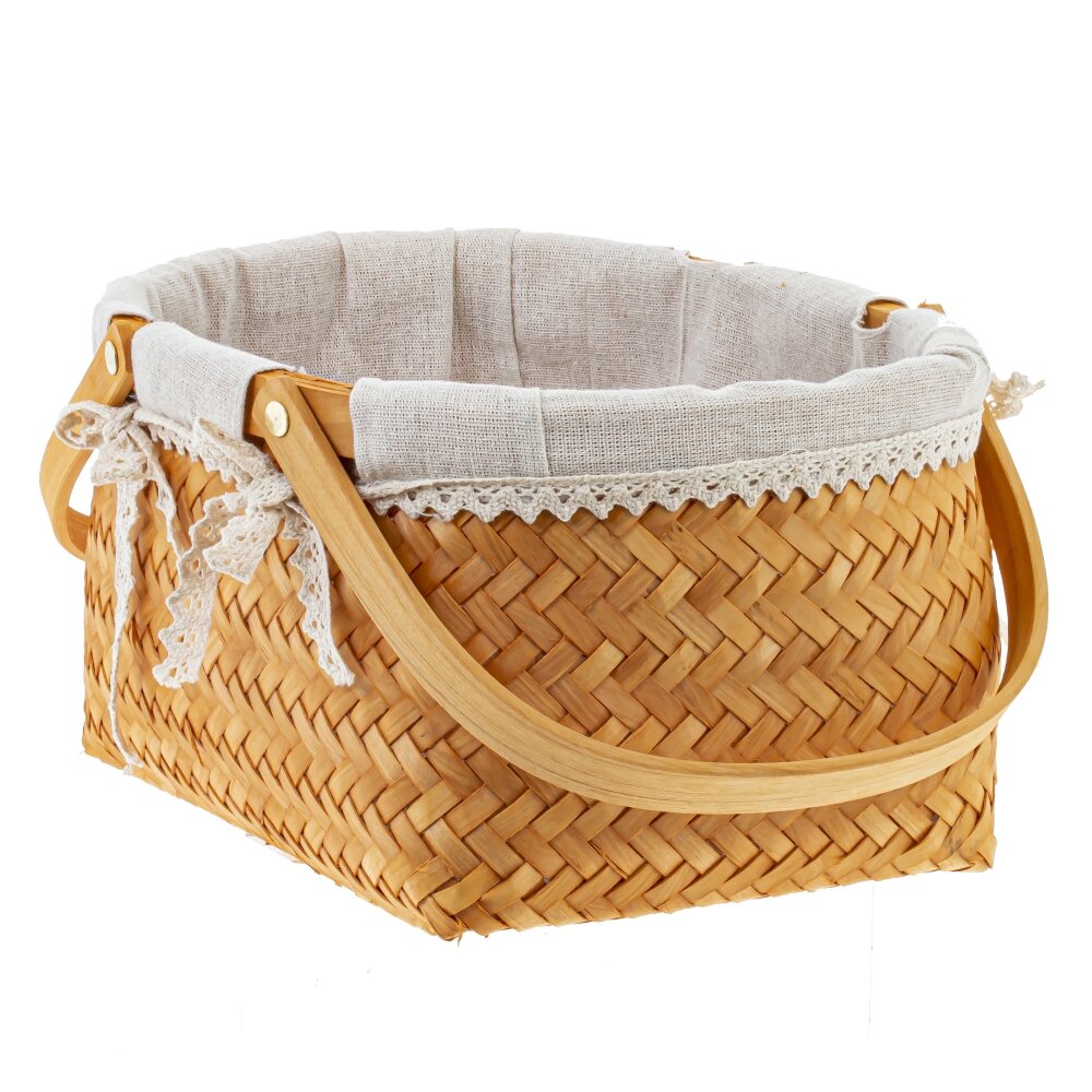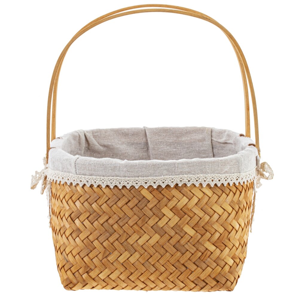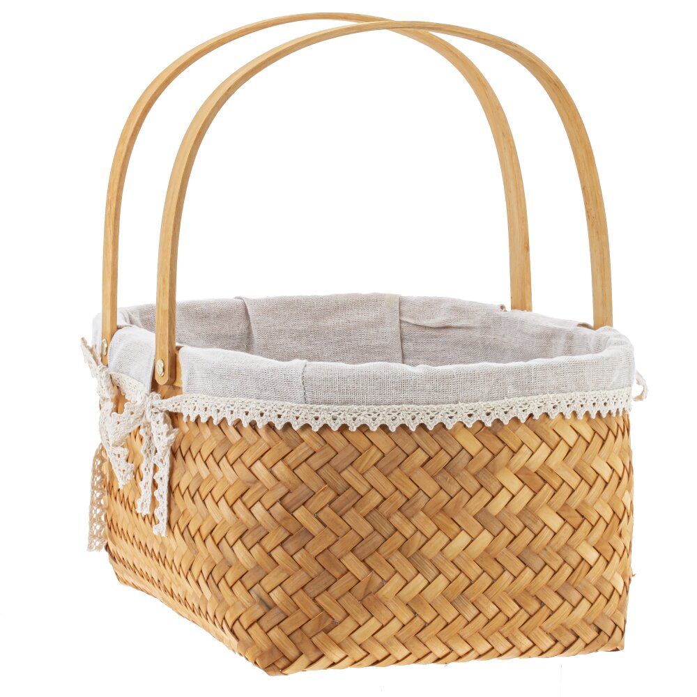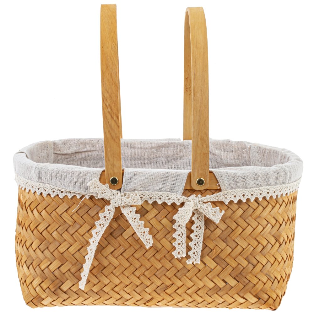 Очаровательная декоративная корзина с плотным плетением. Внутренняя часть оформлена текстильной вставкой из светлой ткани с мелким цветочным узором, что придаёт изделию уютный, деревенский шарм. Вставка украшена кружевной тесьмой и бантом. Удобные деревянные ручки надёжно закреплены прочными металлическими креплениями. Корзина подойдёт для хранения мелочей, косметики, рукодельных принадлежностей или оформления подарков и фотозон. Стильный и практичный аксессуар для дома, дачи или праздников.