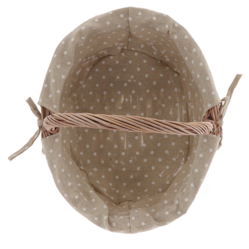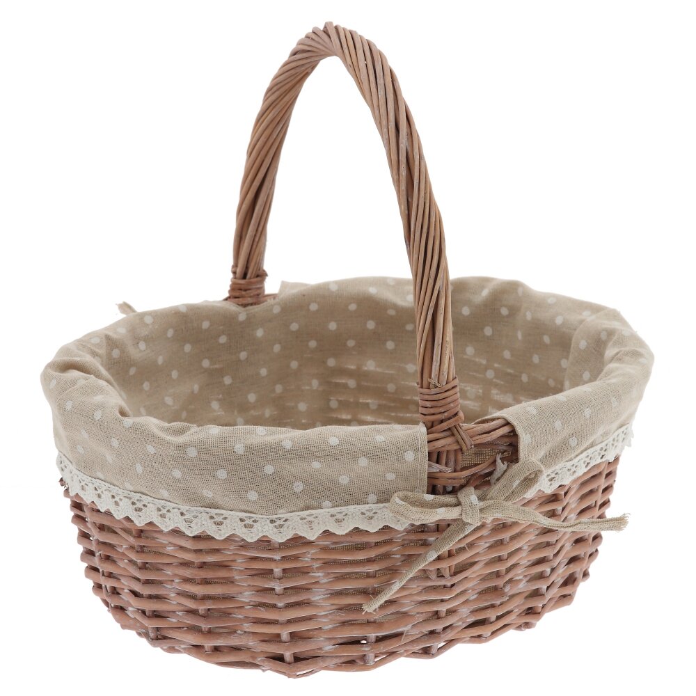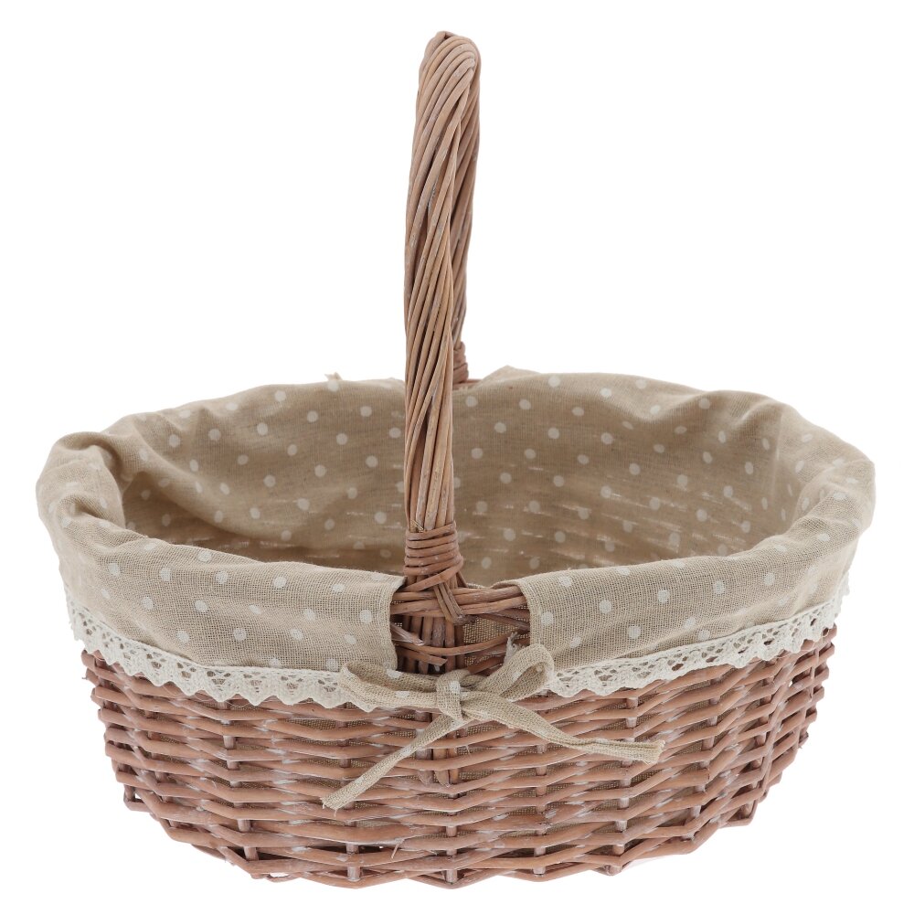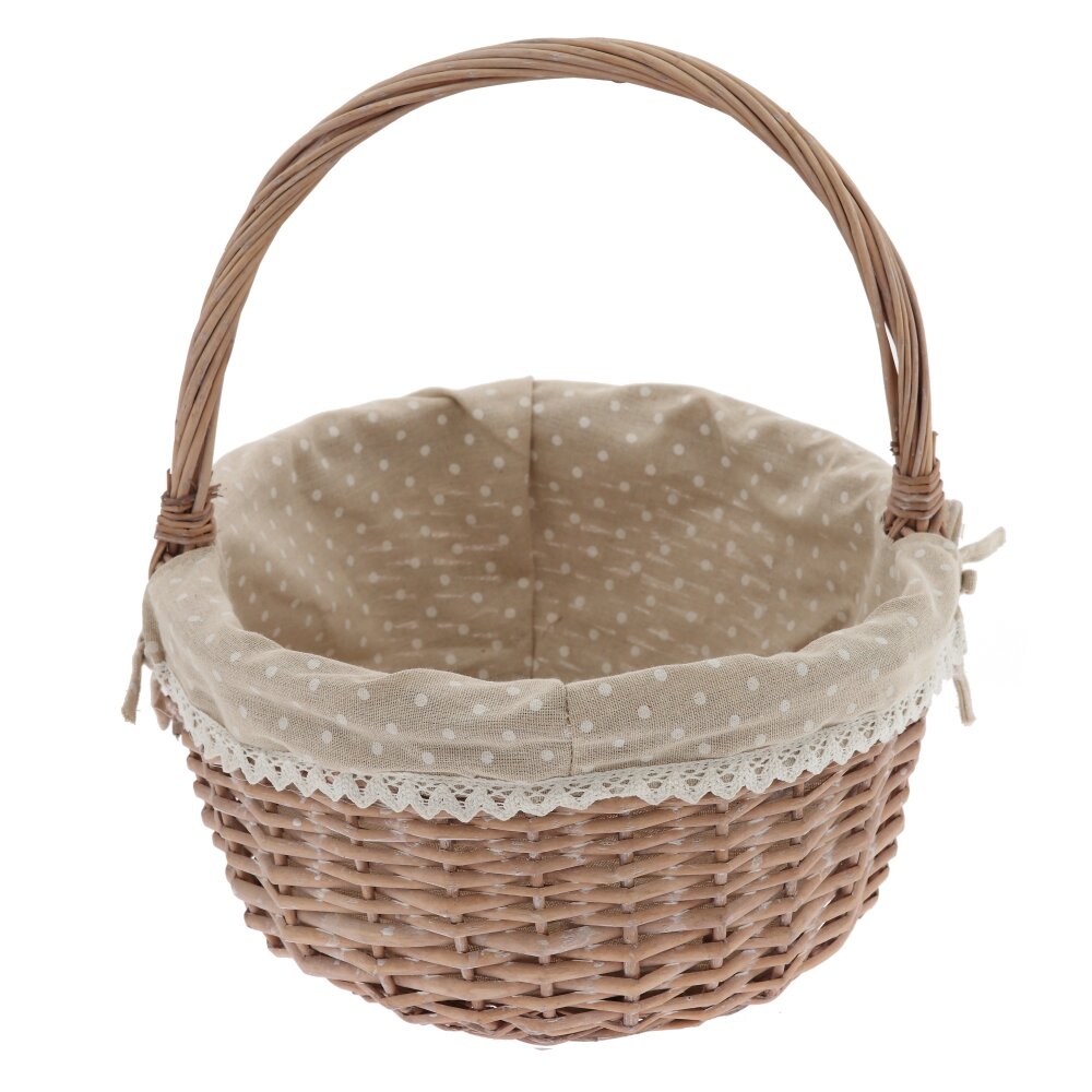 Плетёная корзина с ручкой и текстильной вставкой – стильный и практичный аксессуар для дома и дачи. Основа выполнена из прочной лозы натурального оттенка, аккуратно и плотно сплетённой для надёжности и долговечности. Внутри корзина оформлена съёмным бежевым чехлом из ткани в белый горошек, по краю украшенным ажурным кружевом и бантиком. Такой декор придаёт изделию уютный, деревенский шарм и позволяет использовать корзину не только для хранения мелочей, рукоделия или косметики, но и как красивый элемент сервировки стола, подарочную упаковку или пасхальную корзинку. Лёгкая, удобная и компактная, она гармонично впишется в любой интерьер.