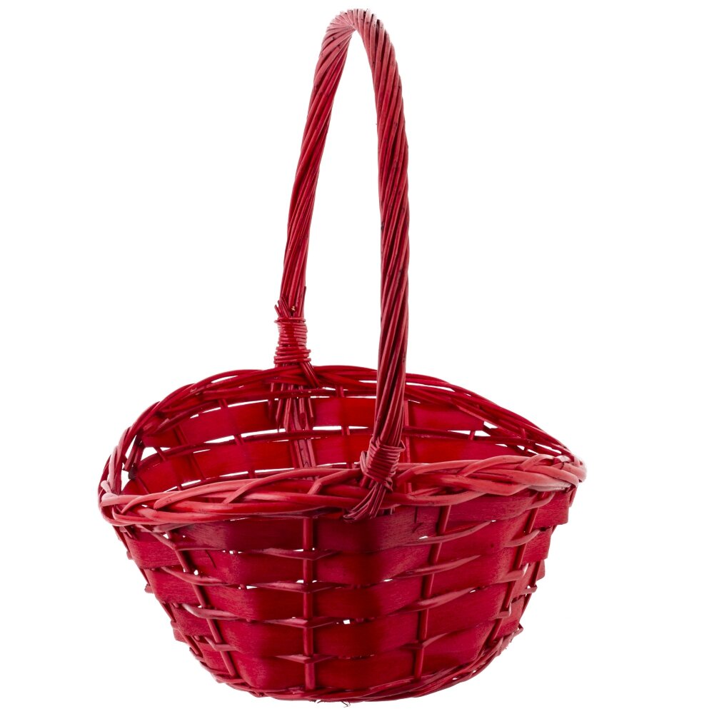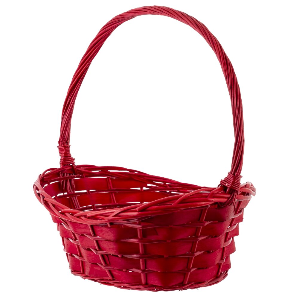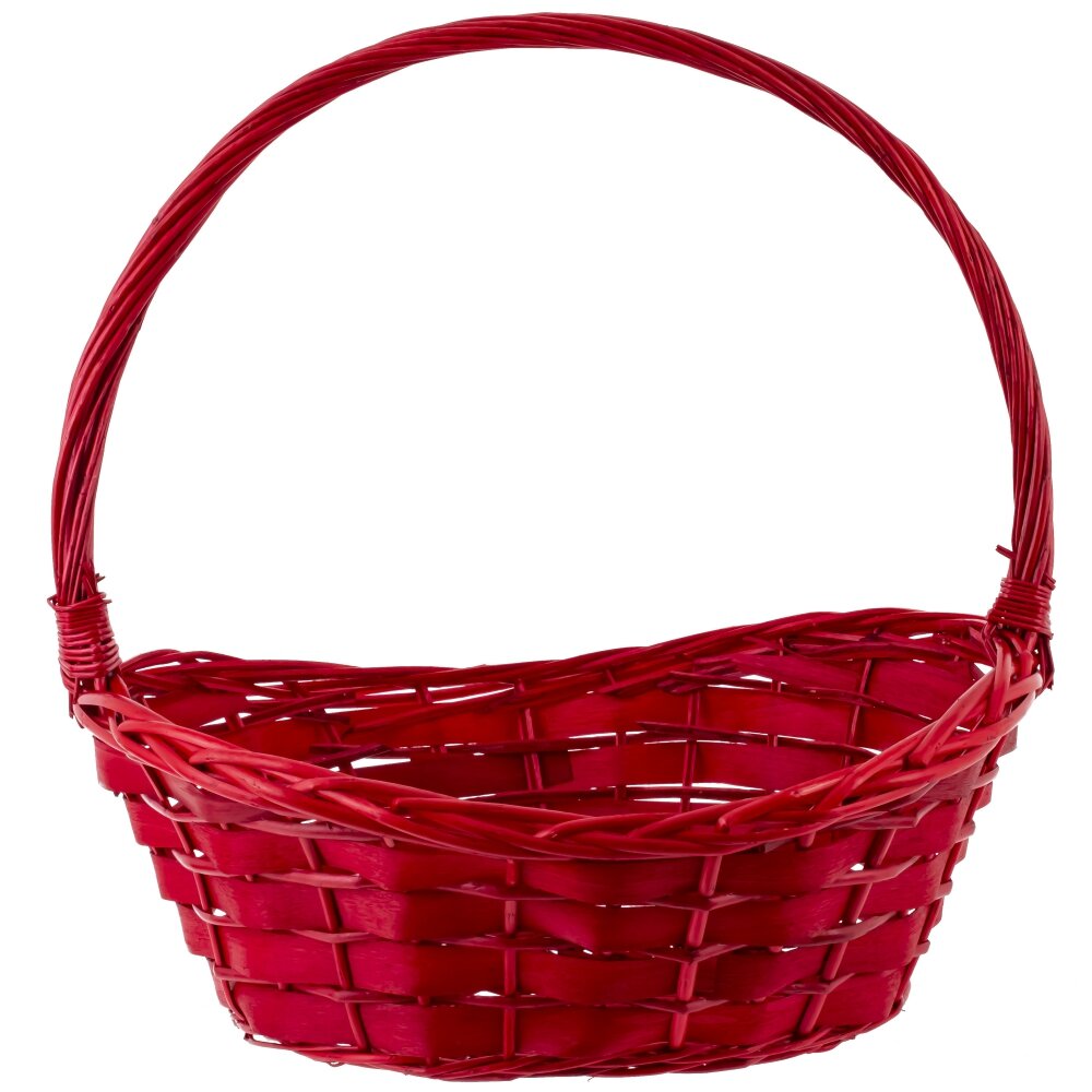 Плетёная корзина ярко-красного цвета. Корзина выполнена из натуральных материалов и имеет аккуратную овальную форму. Её ручка также плотно сплетена и крепко зафиксирована с обеих сторон, что обеспечивает удобство переноски и устойчивость конструкции. Такая корзина может использоваться для множества целей: сбора фруктов и овощей, хранения домашних мелочей, подарочных композиций, а также для декора интерьера. Яркий красный цвет придаёт этому простому предмету нарядный и праздничный вид, делая корзину особенно привлекательной для праздничных мероприятий и тематических фотосессий. Благодаря универсальности и прочности, эта корзина прослужит долгое время, сохраняя свой эстетичный внешний вид.