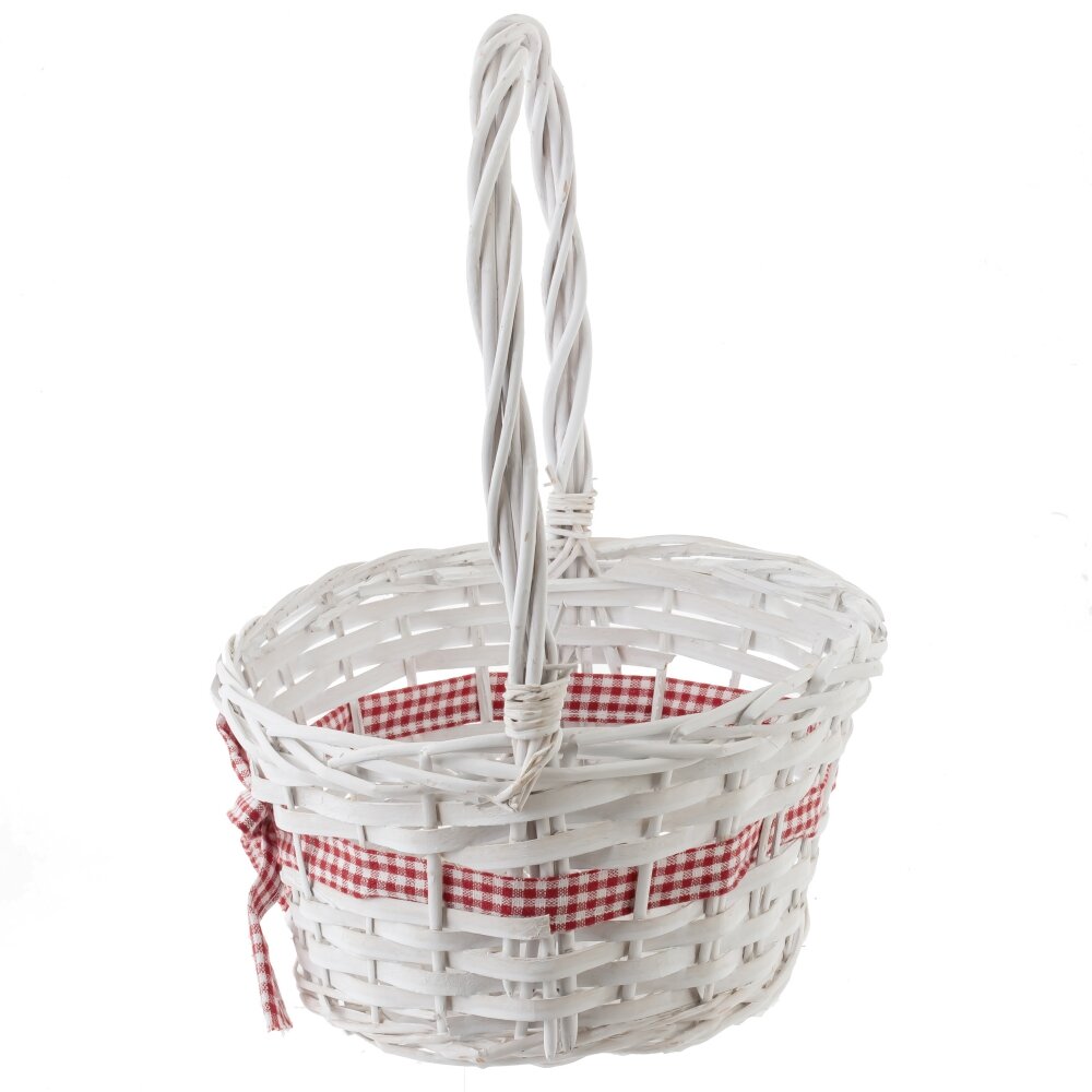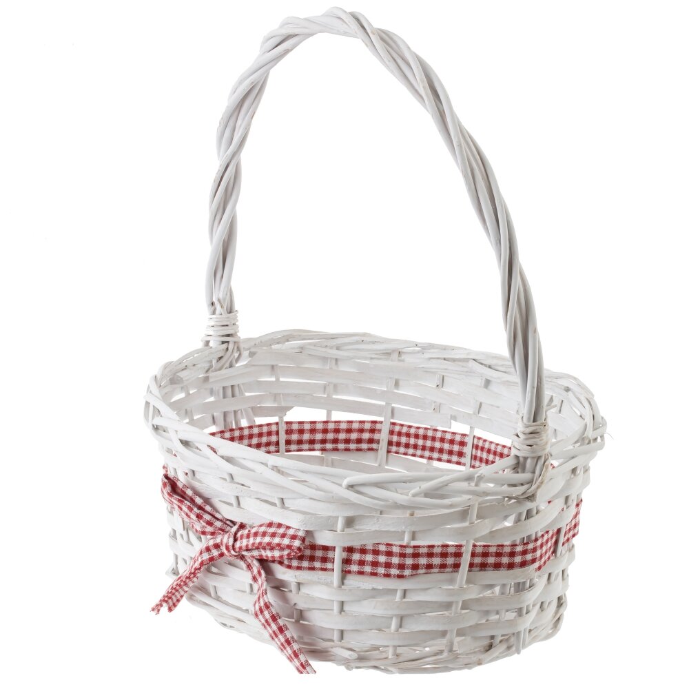 На изображении представлена плетёная корзина, выполненная из лозы и лыка, окрашенная в белый цвет. Корзина имеет овальную форму и высокую удобную ручку. Основной декоративный элемент корзины — красная текстильная лента в белую клетку, аккуратно перевязанная бантом по боковой части. Лента гармонично дополняет общий внешний вид изделия, придавая ему уютный и домашний характер. Такая корзина может быть использована для сбора фруктов, овощей, ягод, а также как декоративный элемент интерьера или упаковка для подарков. Текстильные детали делают изделие особенно привлекательным и добавляют ему нотку уюта и тепла.