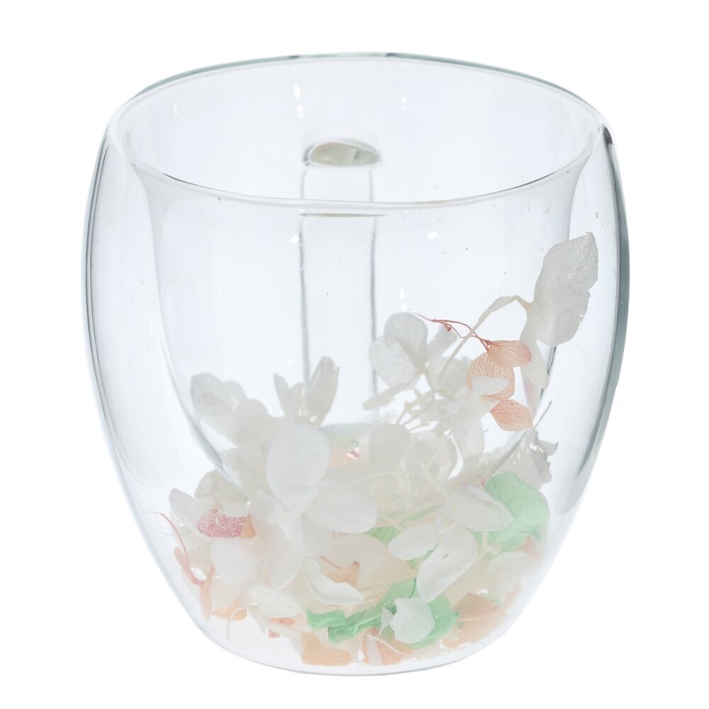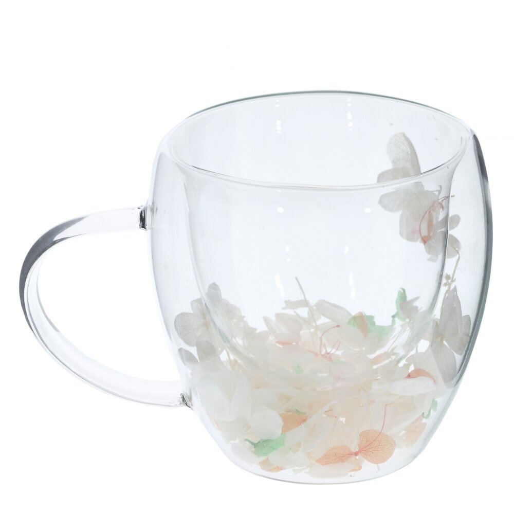 Элегантная стеклянная кружка объёмом 150 мл с двойными стенками — эффектный акцент для дома и офиса. Между стенками размещены цветы нежных оттенков: они не контактируют с напитком, но создают ощущение лёгкости и весеннего настроения. Двойные стенки помогают дольше сохранять тепло чая или кофе, а наружная поверхность остаётся комфортной для рук и практически не запотевает при холодных напитках. Удобная прозрачная ручка подчёркивает воздушный дизайн. Отличный подарок для любителей утончённых деталей. Рекомендуется бережная ручная мойка; не нагревать в микроволновке и не использовать в посудомоечной машине из?за декоративной вставки.