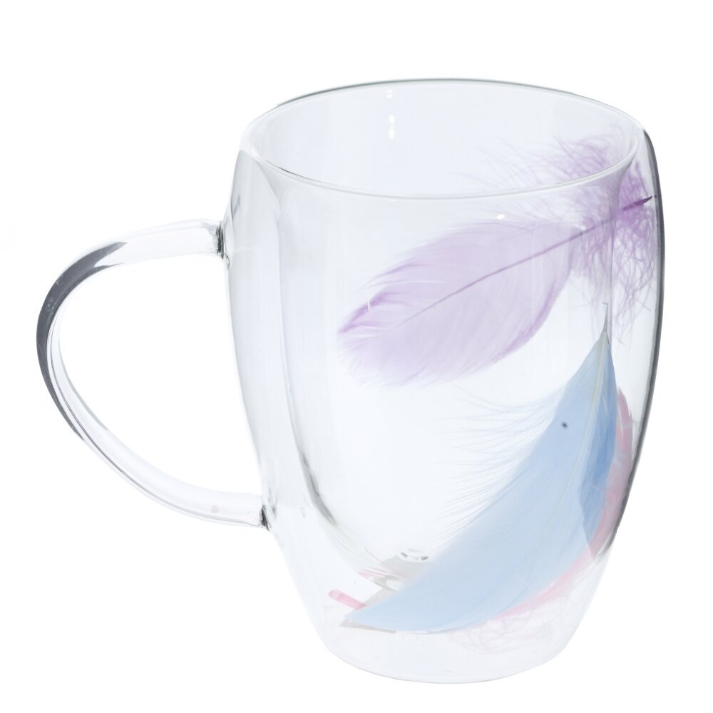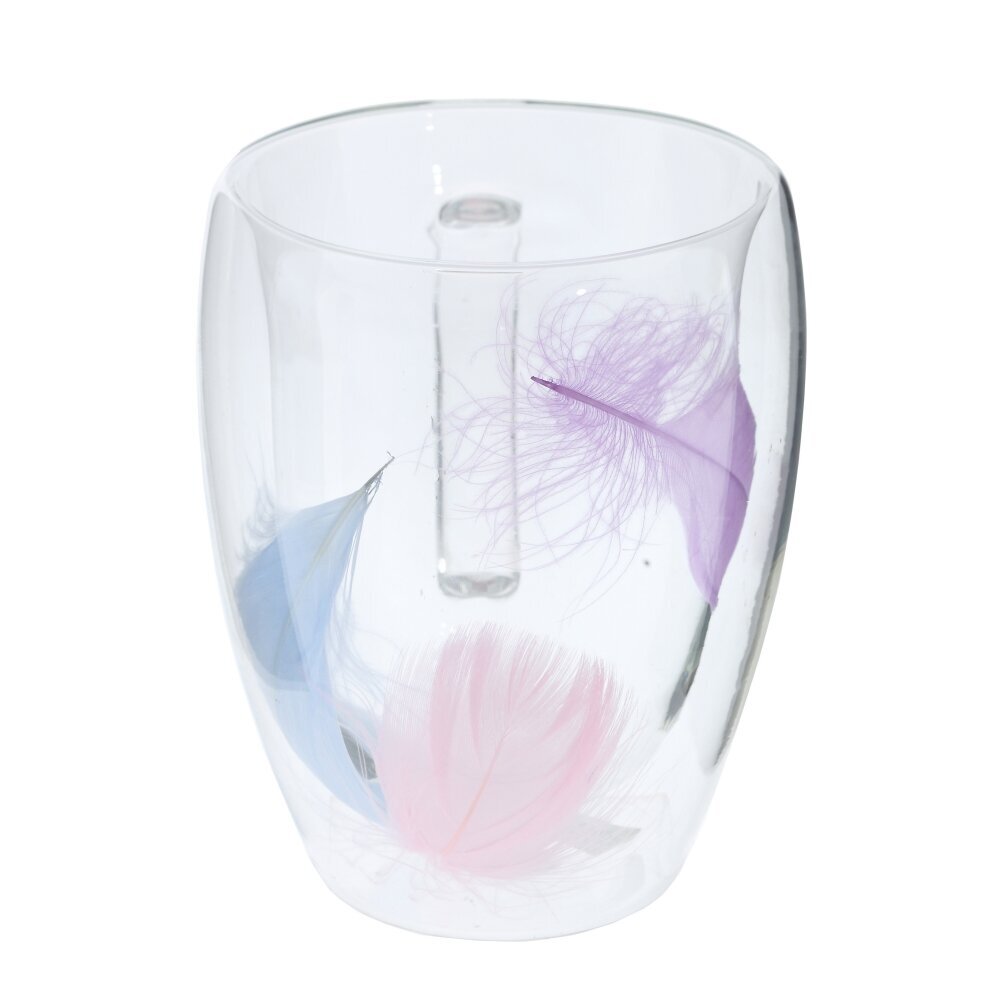 Прозрачная кружка объёмом 300 мл из прочного стекла с двойными стенками. Внутри между ними заключены легкие цветные перья нежных лиловых, голубых и розовых оттенков — они словно парят в воздухе, создавая утончённый декор. Двойные стенки помогают дольше сохранять температуру напитка, не обжигают руки и предотвращают конденсат снаружи. Удобная эргономичная ручка, гладкий край, подходит для чая, кофе, какао и холодных напитков. Лёгкая, изящная и атмосферная — станет эффектным акцентом на кухне или необычным подарком. Для сохранения вида рекомендована бережная ручная мойка без абразивов.