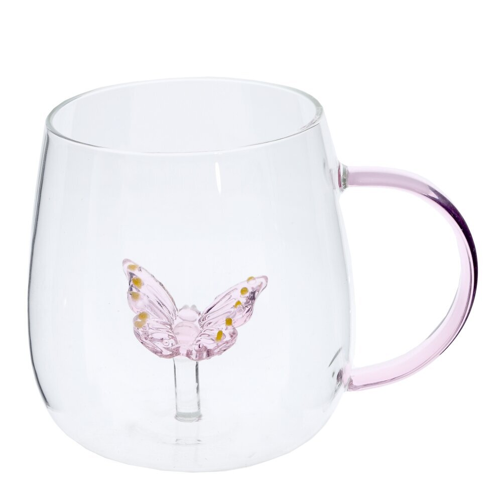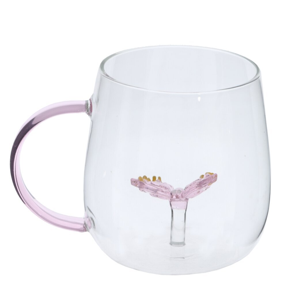 Стеклянная кружка объемом 380 мл для стильной повседневной сервировки. Прозрачные стенки демонстрируют цвет напитка, а внутри, на тонкой стеклянной ножке, расположена миниатюрная розовая 3D-бабочка с золотистыми акцентами — кажется, будто она парит в чашке. Плавно расширяющаяся форма и гладкий край обеспечивают комфорт при питье, полупрозрачная розово-лиловая ручка удобна для захвата. Кружка подходит для горячих и холодных напитков: чая, кофе, какао, травяных настоев, сока или лимонада. Эстетичный акцент для домашней кухни или офиса, прекрасная идея подарка. Для сохранения декора рекомендуется бережное мытье без абразивов.