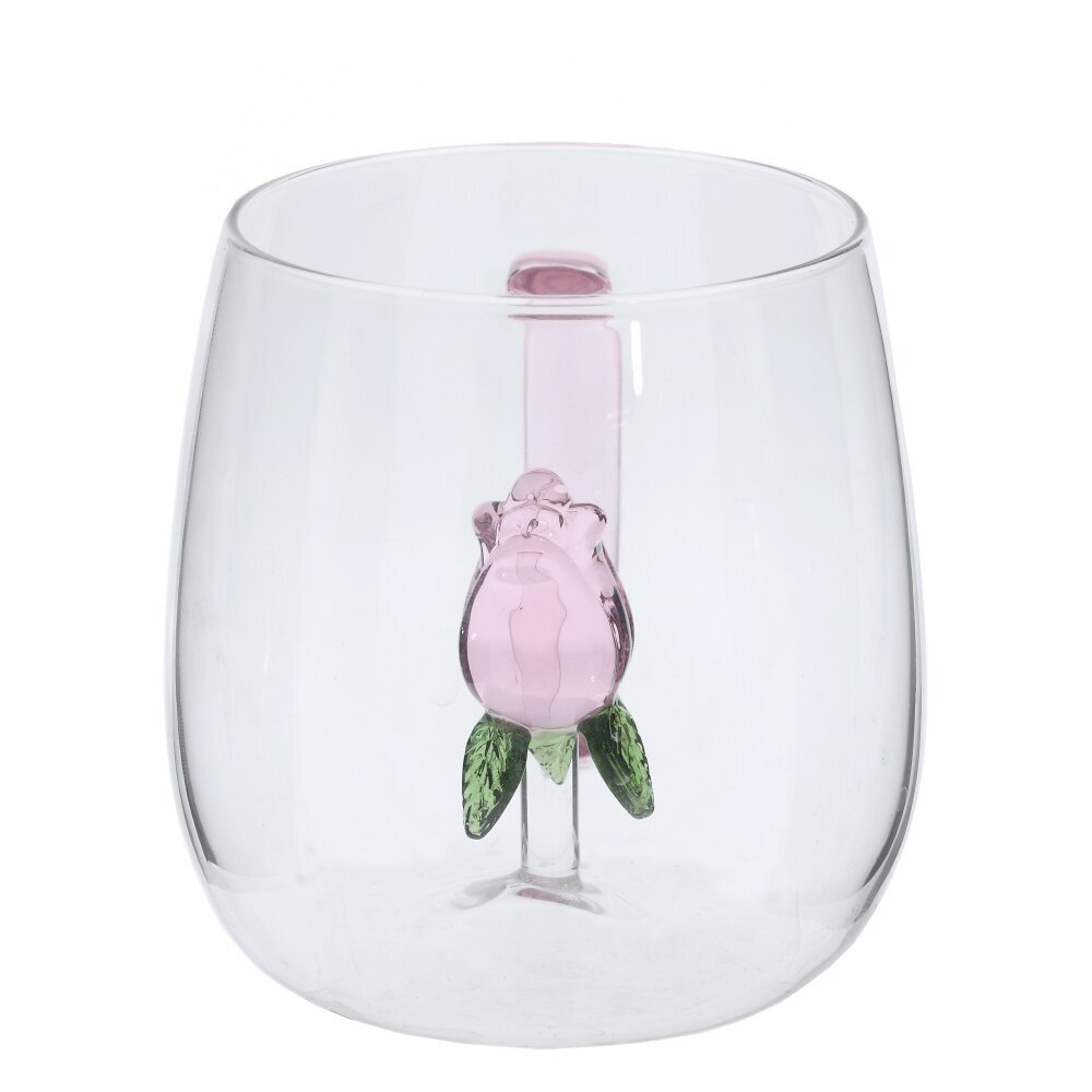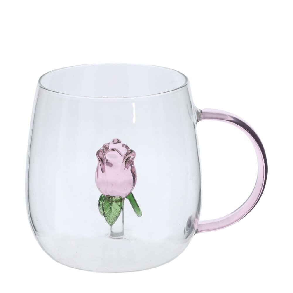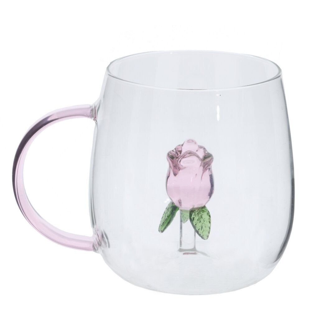 Стеклянная кружка объемом 380 мл для стильной повседневной сервировки. Прозрачные стенки демонстрируют цвет напитка, а внутри, на тонкой стеклянной ножке, расположена миниатюрная роза — кажется, будто она парит в чашке. Плавно расширяющаяся форма и гладкий край обеспечивают комфорт при питье, полупрозрачная розово-лиловая ручка удобна для захвата. Кружка подходит для горячих и холодных напитков: чая, кофе, какао, травяных настоев, сока или лимонада. Эстетичный акцент для домашней кухни или офиса, прекрасная идея подарка. Для сохранения декора рекомендуется бережное мытье без абразивов.