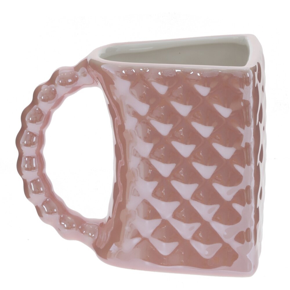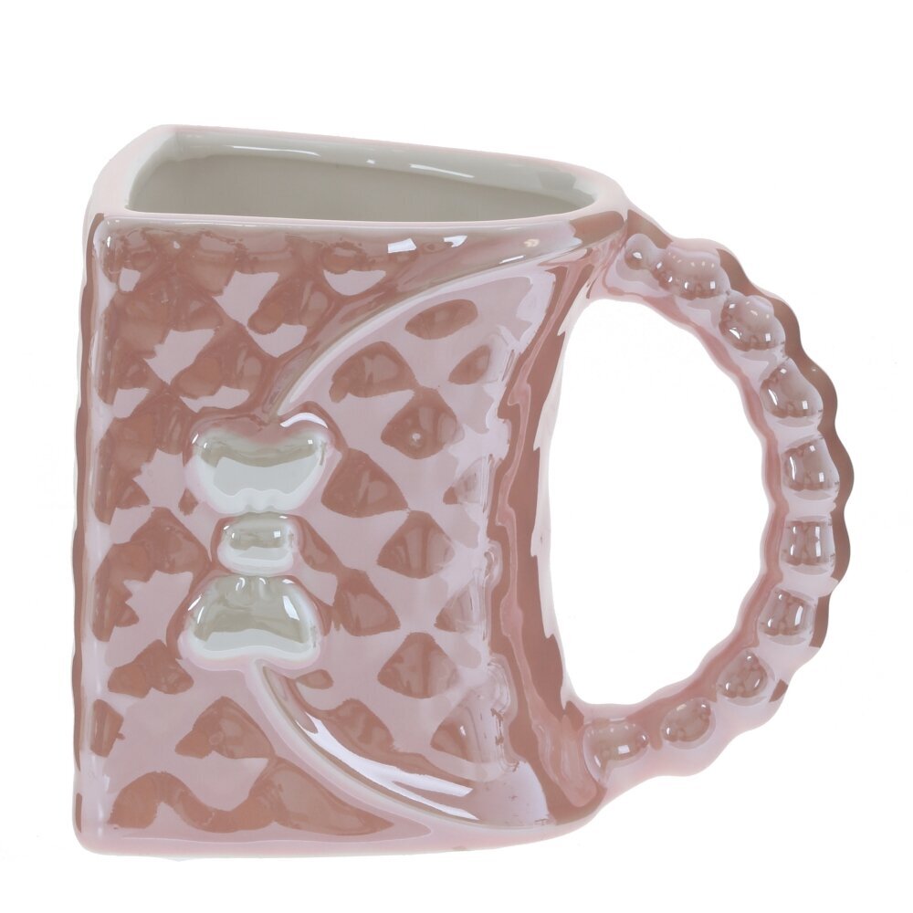 Оригинальная кружка из высококачественного фарфора объёмом 400 мл станет ярким акцентом на вашем столе. Необычная квадратная форма и рельефный узор придают изделию стильный и слегка игрушечный вид. Нежный розовый цвет с глянцевой глазурью выгодно подчёркивается контрастной белой внутренней поверхностью и декоративными «бантиками» на корпусе. Фигурная ручка с объёмными элементами удобно лежит в руке и не скользит. Кружка подойдёт для чая, кофе, какао и других горячих напитков, станет милым подарком и украшением любой кухни или рабочего стола.