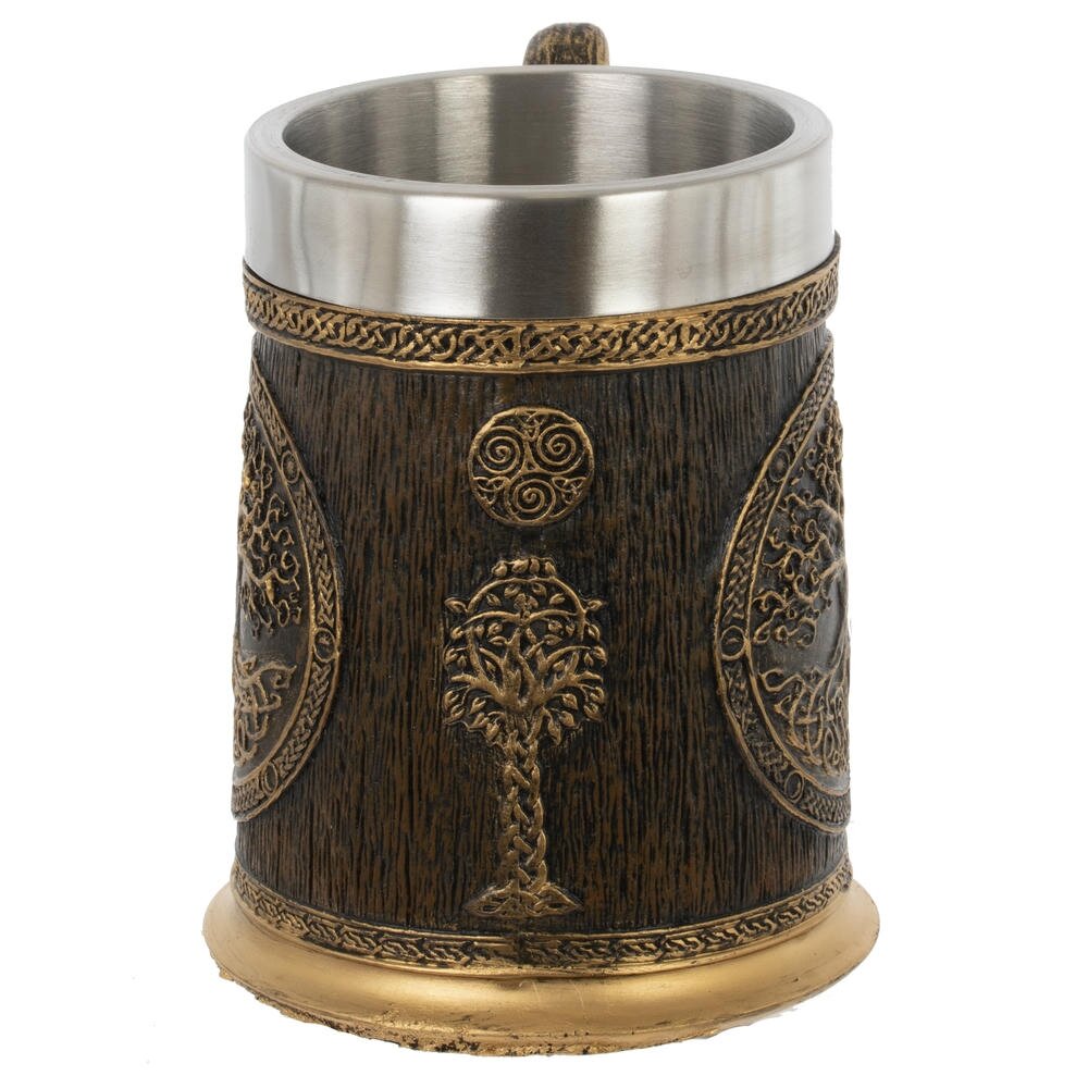 Оригинальная кружка объёмом 550 мл в стиле средневекового кубка станет ярким акцентом на вашем столе. Внутренняя часть выполнена из нержавеющей стали, что позволяет долго сохранять температуру напитка и облегчает уход. Снаружи кружка декорирована фактурой под тёмное дерево и объёмным барельефом с изображением Древа жизни, обрамлённым кельтским орнаментом. Фигурная ручка с благородным «под старую бронзу» покрытием удобно ложится в руку и подчёркивает атмосферу фэнтези или викинг-стиля. Подходит для пива, кваса, чая и других напитков, станет отличным подарком коллекционерам и любителям необычной посуды.