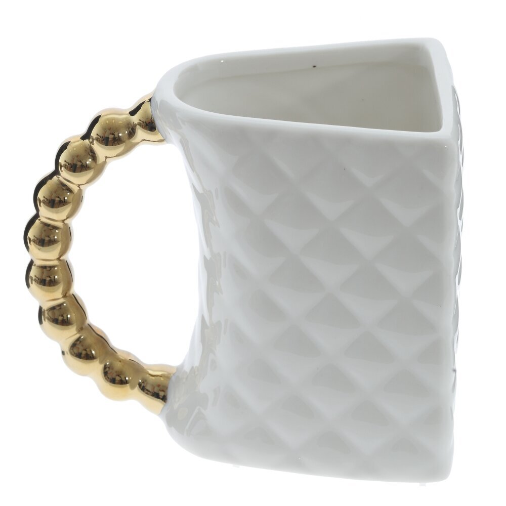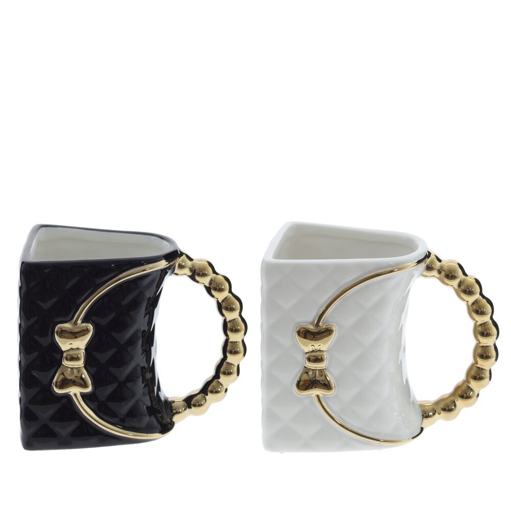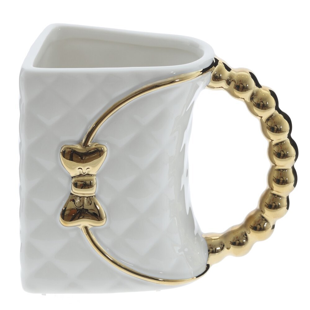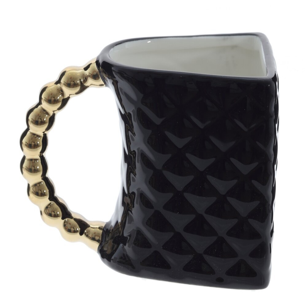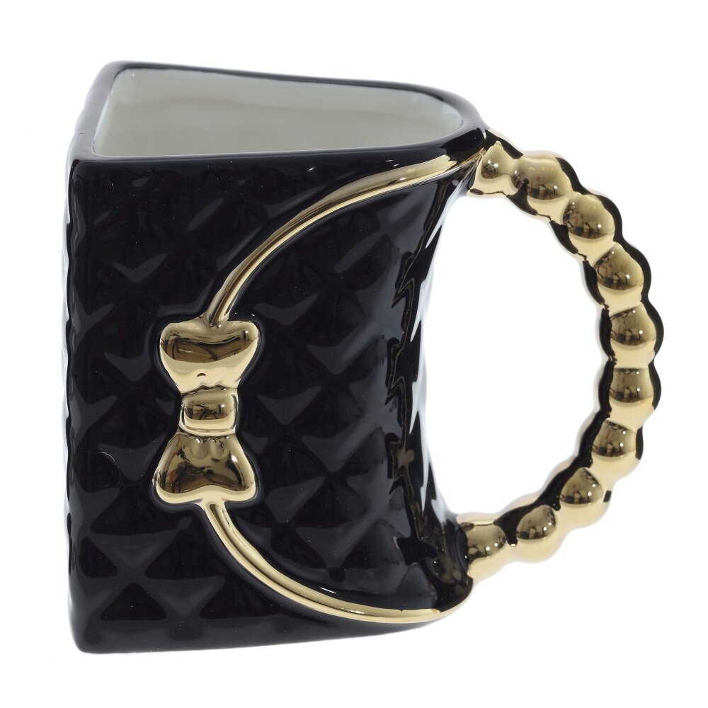 Стильная кружка объемом 320 мл из гладкого фарфора, представлена в двух вариантах: глубокий черный и классический белый. Корпус в виде дамской сумочки с мягко скругленными углами и фактурой «стеганый ромб» смотрится эффектно и современно. Главный акцент — золотистая ручка из бусин и изящные декоративные элементы в виде банта . Глянцевая глазурь подчеркивает насыщенность цвета, кружка удобно лежит в руке и устойчиво стоит на столе. Идеальна для кофе, чая или какао дома и в офисе, станет запоминающимся подарком и красивым дополнением сервировки.