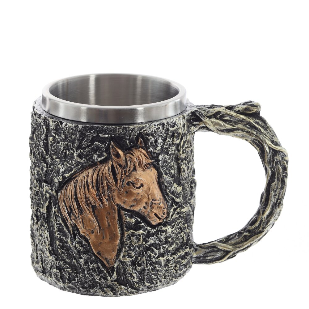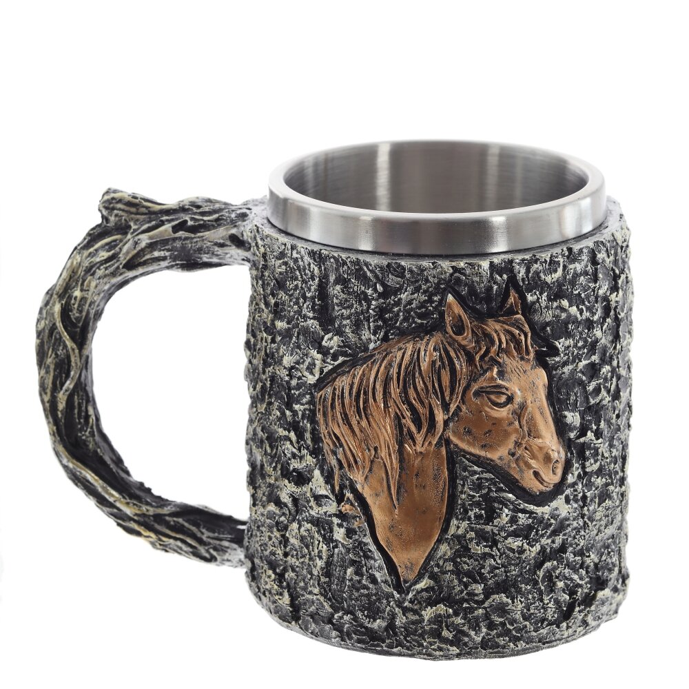 Оригинальная кружка «Лошадь» объемом 445 мл. Внутренняя колба выполнена из коррозионностойкой стали, внешняя оболочка — из прочных полимерных материалов. Фактура напоминает кору дерева, а на стенке расположен рельефный барельеф головы лошади. Кружка не окисляется, не впитывает запахи и легко очищается. Широкая рукоять в виде переплетённых ветвей удобна и надежно лежит в руке, утолщенное дно придаёт устойчивость. Подходит для чая, кофе, какао и прохладных напитков дома, на даче или в походе. Яркий тематический подарок для ценителей природы и любителей лошадей.