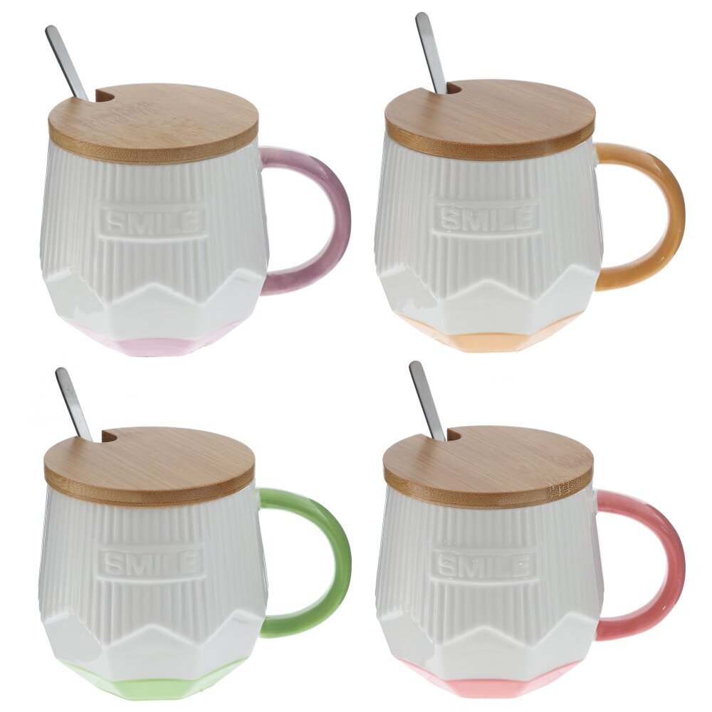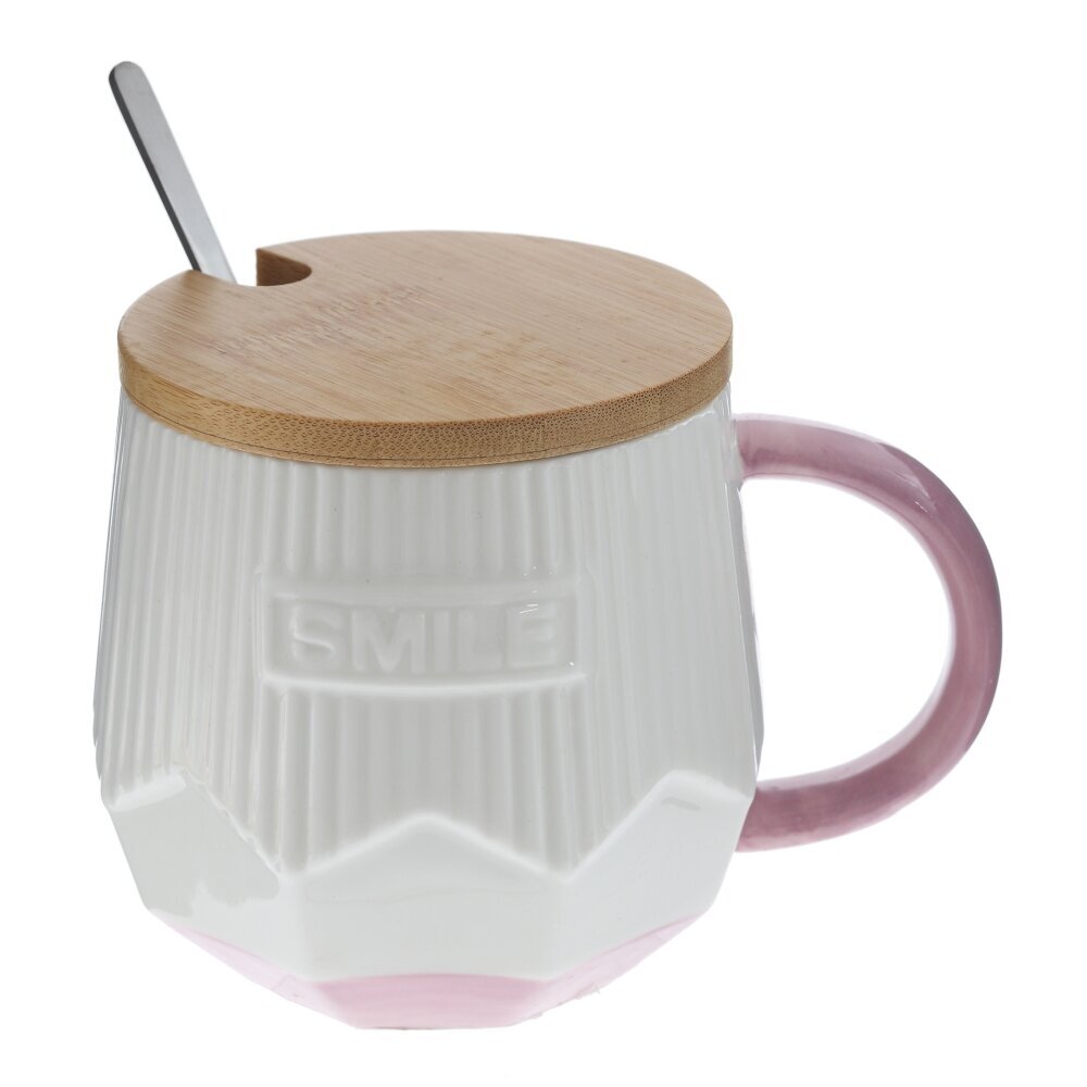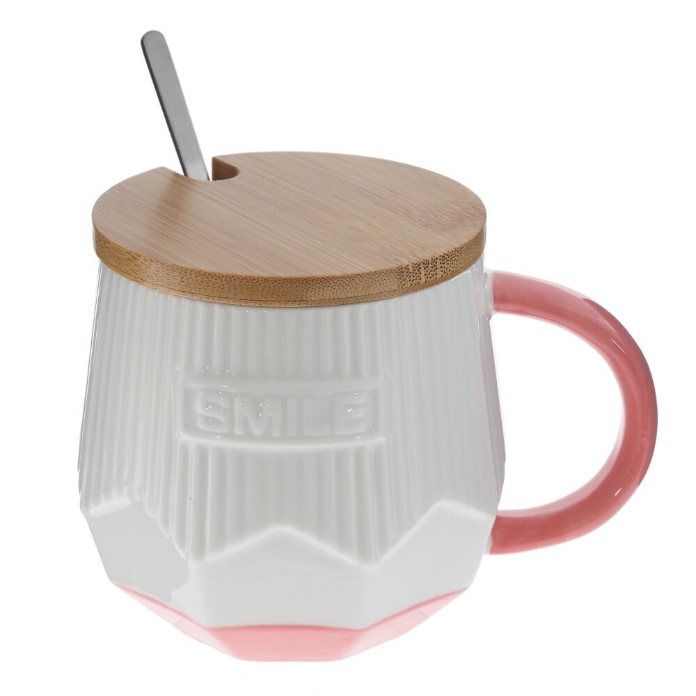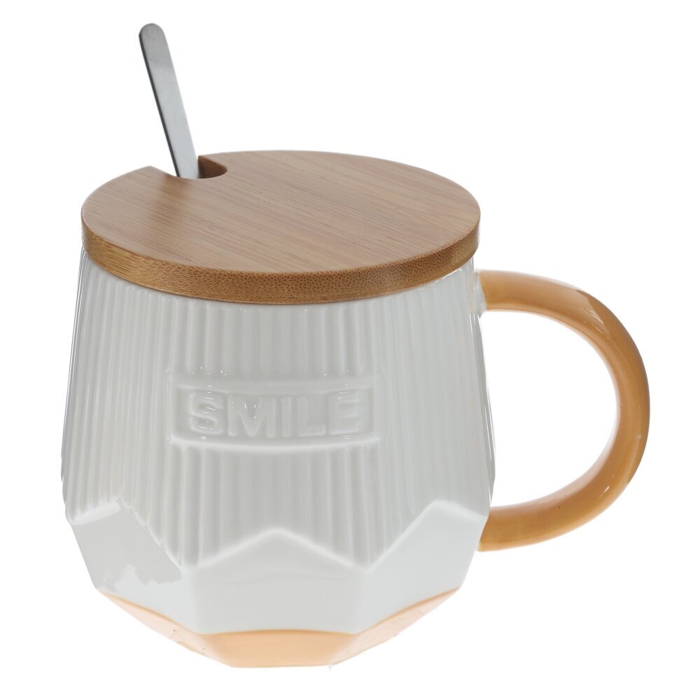 Стильная кружка объёмом 320 мл сочетает три материала: прочный фарфор, тёплое дерево и практичный металл. Корпус из белого фарфора имеет рельефные вертикальные грани и аккуратную надпись SMILE, а дно и широкая округлая ручка окрашены в нежный цвет. Плоская бамбуковая крышка с выемкой надёжно удерживает тепло и защищает напиток от пыли; в комплекте — металлическая ложка, удобно размещающаяся в прорези. Кружка устойчива, приятно лежит в руке и подходит для чая, кофе, какао. Отличный вариант для дома и офиса, а также приятный подарок. Представлено в четырех вриантах.