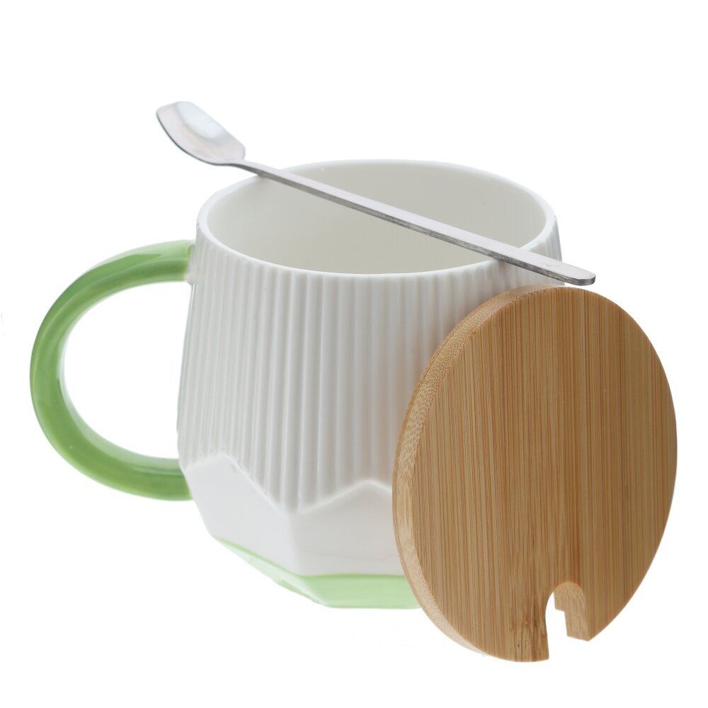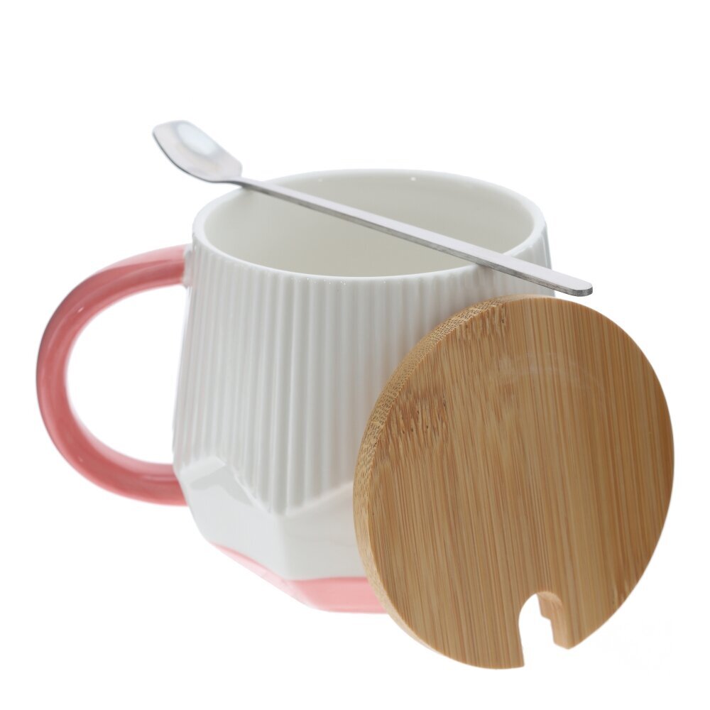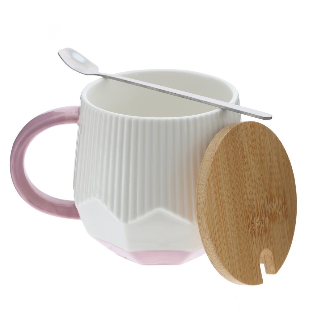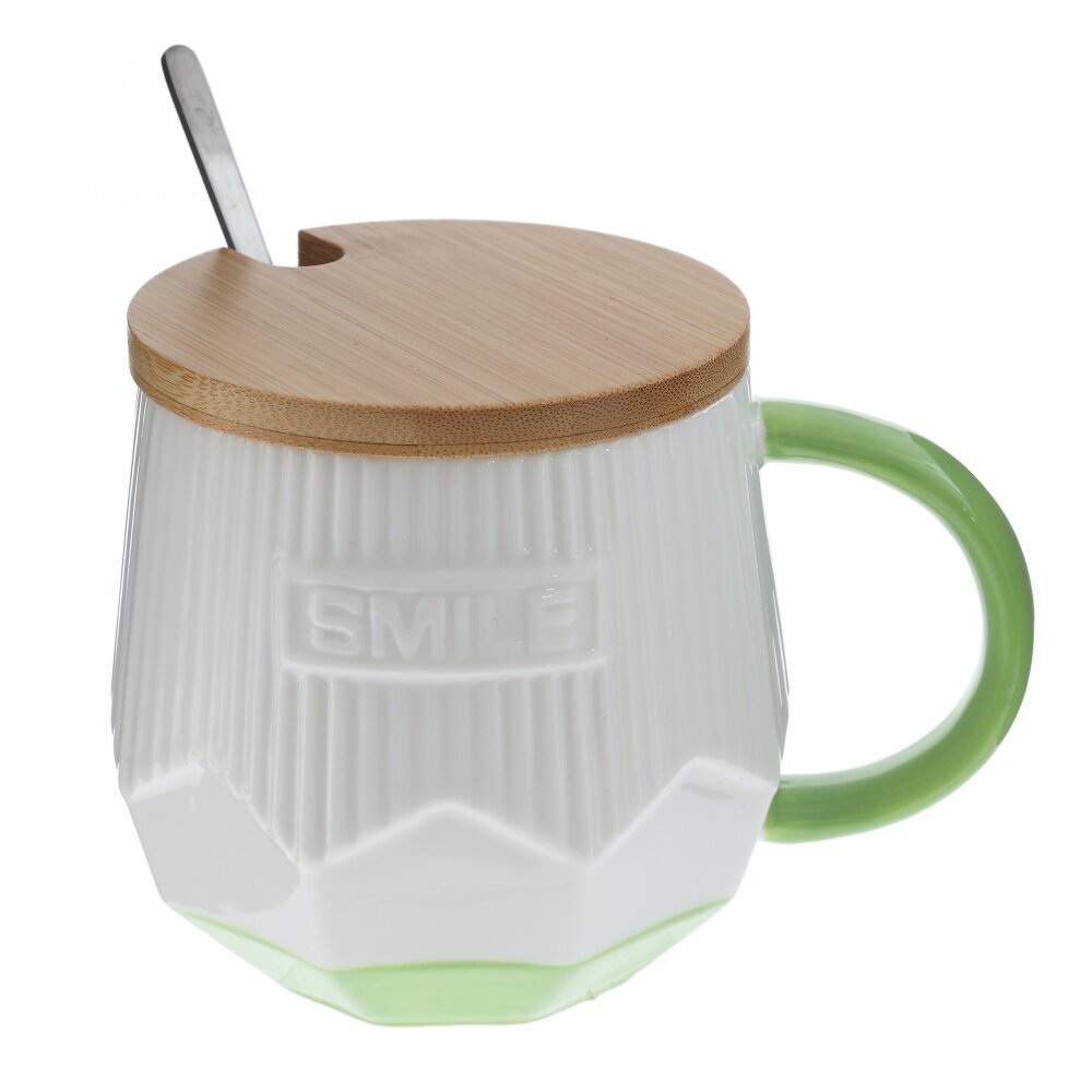 Стильная кружка объёмом 320 мл сочетает три материала: прочный фарфор, тёплое дерево и практичный металл. Корпус из белого фарфора имеет рельефные вертикальные грани и аккуратную надпись SMILE, а дно и широкая округлая ручка окрашены в нежный цвет. Плоская бамбуковая крышка с выемкой надёжно удерживает тепло и защищает напиток от пыли; в комплекте — металлическая ложка, удобно размещающаяся в прорези. Кружка устойчива, приятно лежит в руке и подходит для чая, кофе, какао. Отличный вариант для дома и офиса, а также приятный подарок. Представлено в четырех вриантах.