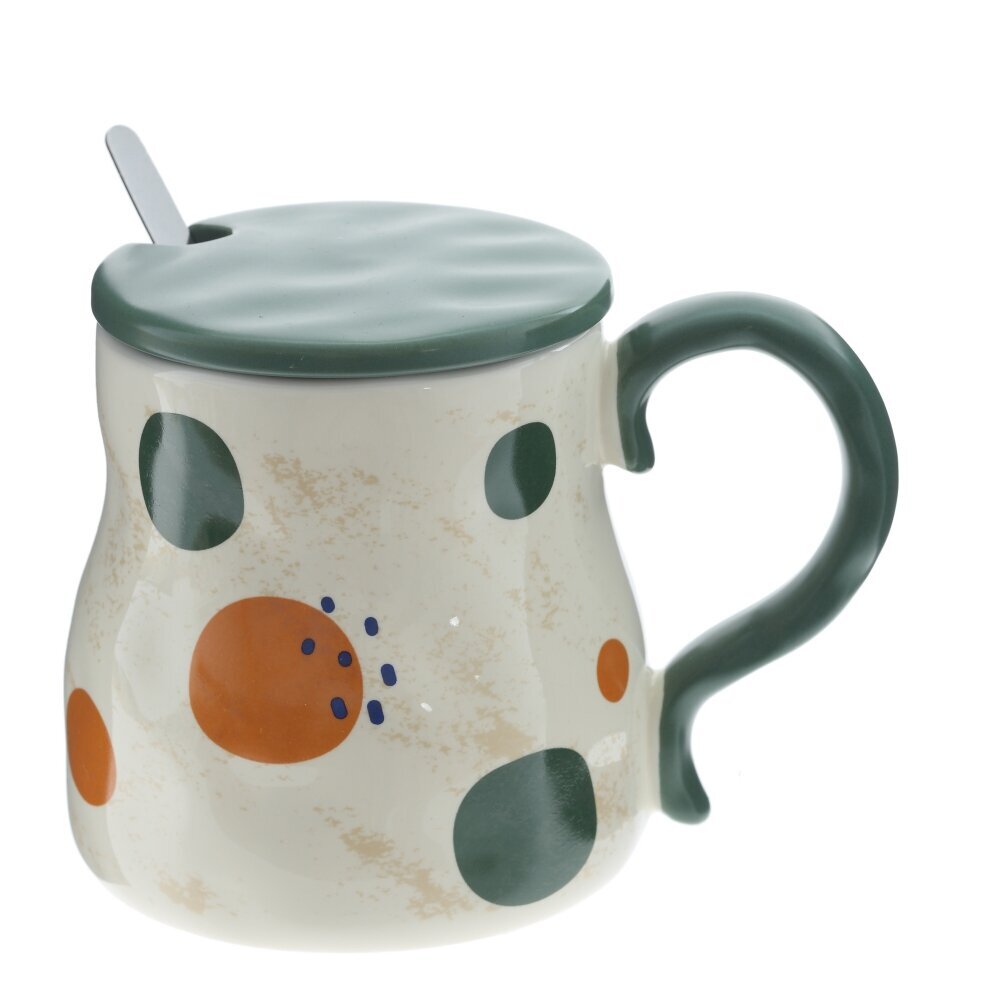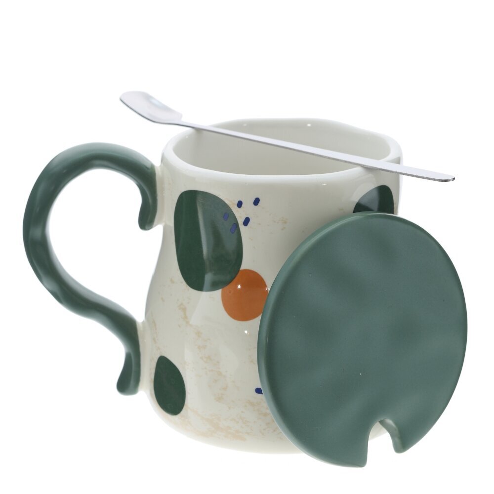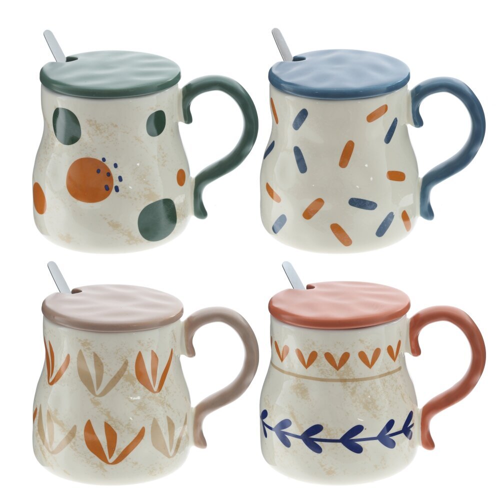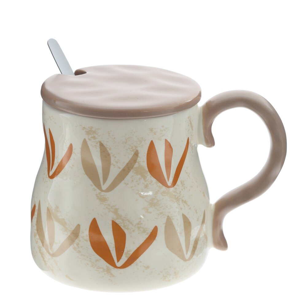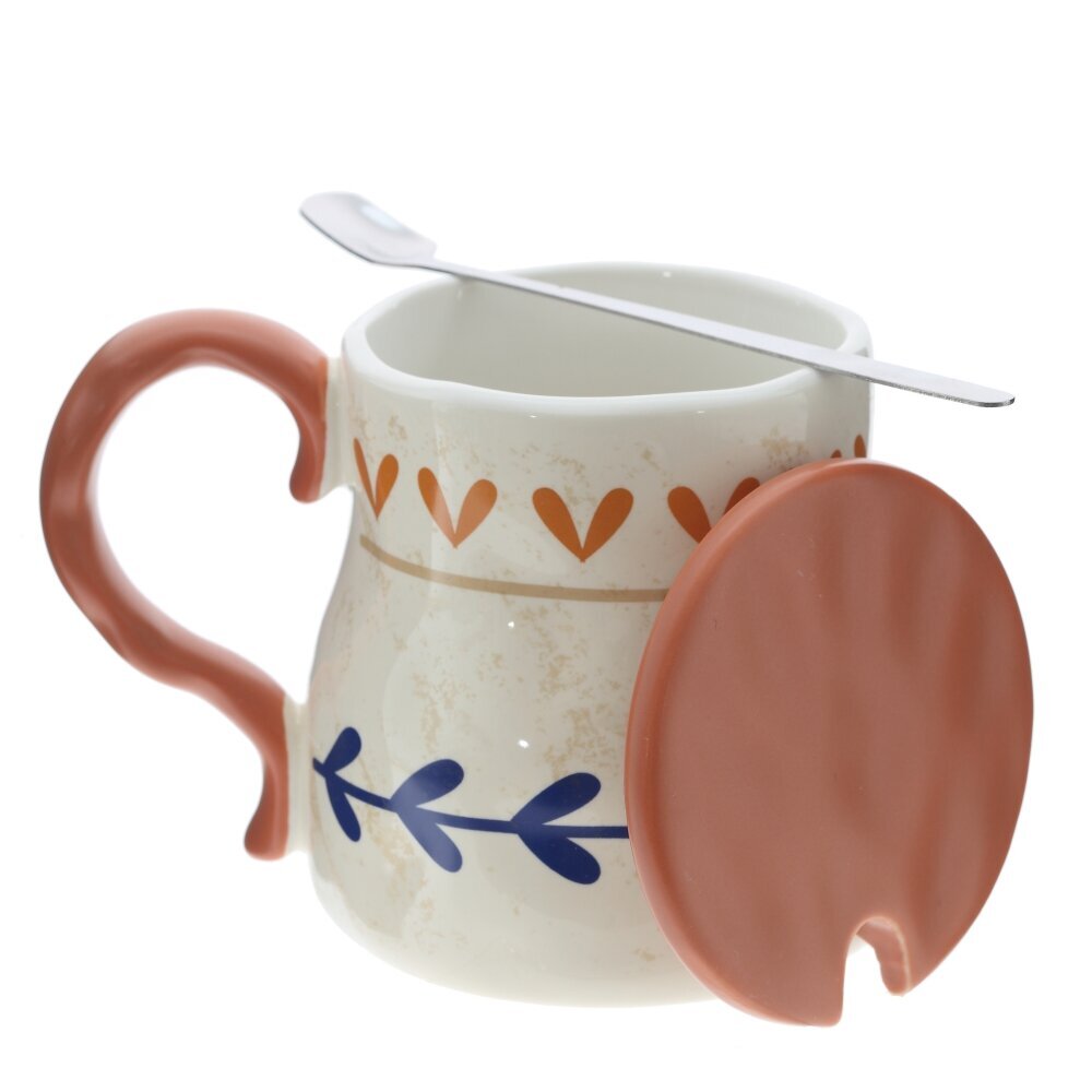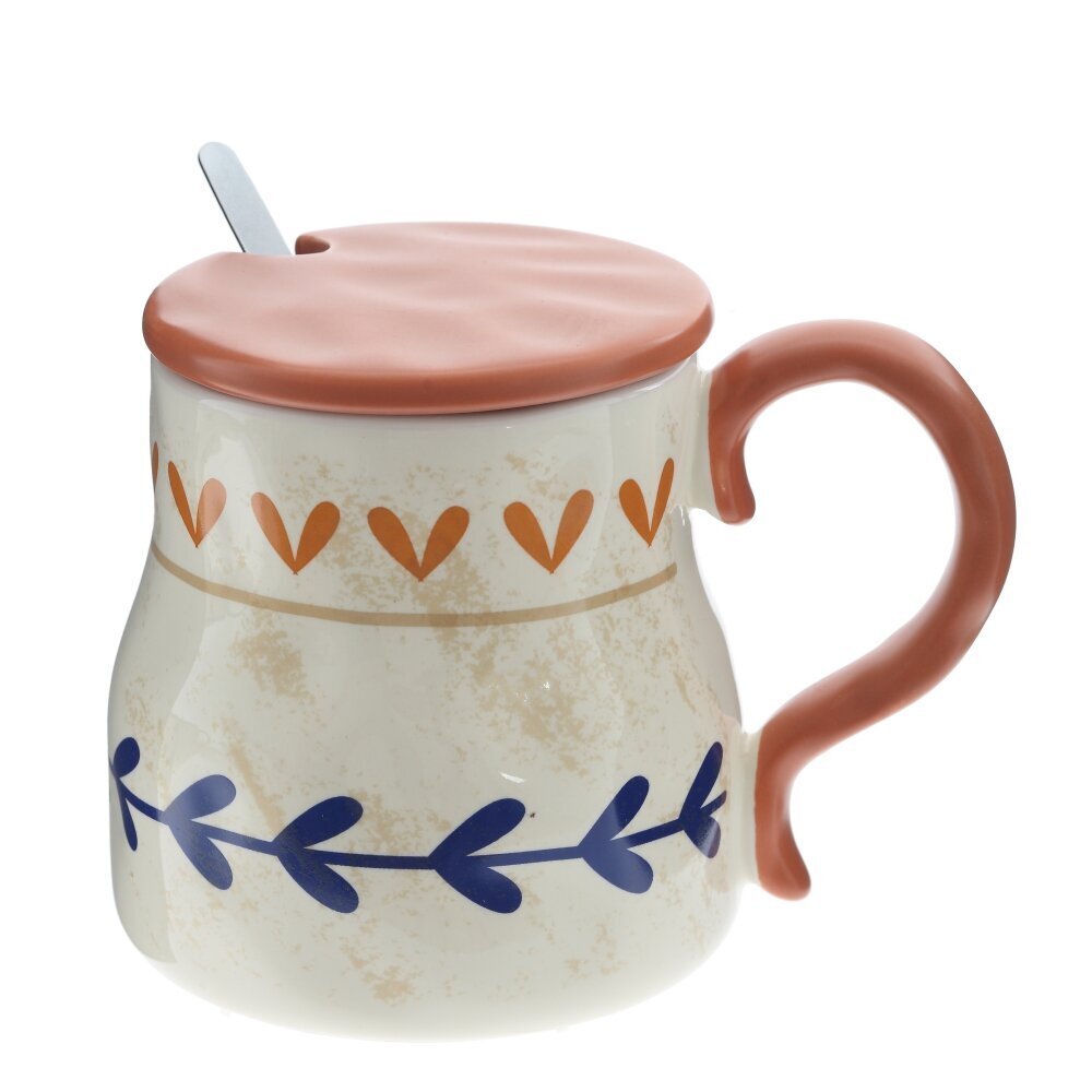 Стильная кружка с крышкой и ложкой, объем 400 мл. Выполнена из прочного фарфора, ложка — из металла. Корпус молочно—бежевого оттенка с мягкими крапинами украшен полосой из терракотовых сердечек и синей «веточкой». Плавно расширяющаяся к низу форма устойчиво стоит на столе, а широкая эргономичная ручка удобно лежит в руке. Матовая крышка терракотового цвета имеет аккуратный вырез для ложки, что помогает заваривать чай, размешивать сахар или мед, удерживая напиток теплым и защищая его от пыли. Кружка подойдет для чая, кофе, какао и завтраков, уместна дома, в офисе и на даче. Теплый, слегка деревенский дизайн создает уют и делает изделие отличной идеей для подарка. Представлено в четырех вариантах.