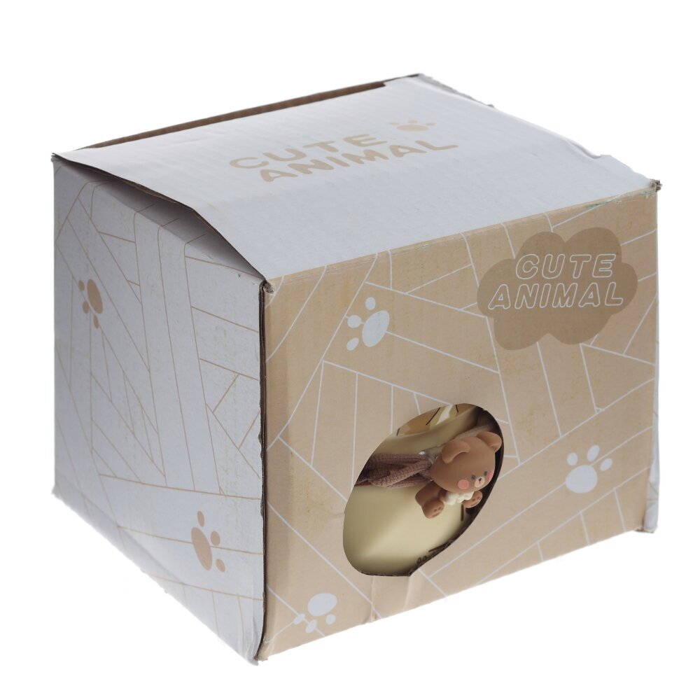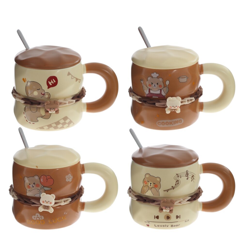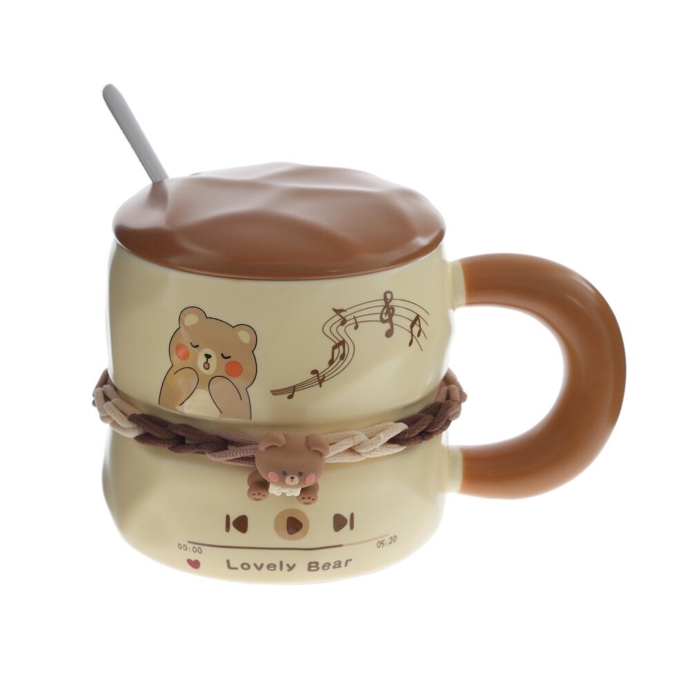 Очаровательная кружка объемом 300 мл с крышкой и металлической ложечкой. Выполнена из гладкой керамики в теплых бежево-коричневых тонах. На корпусе — милый принт с медвежонком и нотами, внизу — забавные значки плеера и надпись Lovely Bear. Особое украшение — плетеная резинка, опоясывающая центр кружки, со съемной фигуркой медвежонка: ее можно оставить как декоративный акцент или использовать отдельно как небольшой аксессуар. Крышка помогает дольше сохранять тепло и защищает напиток, а ложечка удобно вставляется в отверстие. Эргономичная ручка делает кружку удобной для чая, кофе или какао дома и в офисе, а милый дизайн превращает ее в приятный подарок. Представлено в четырех вариантах.