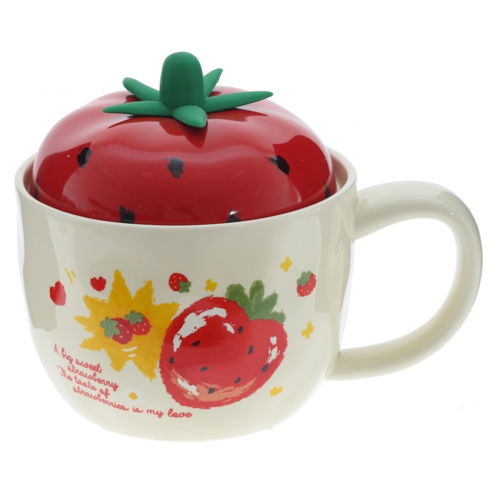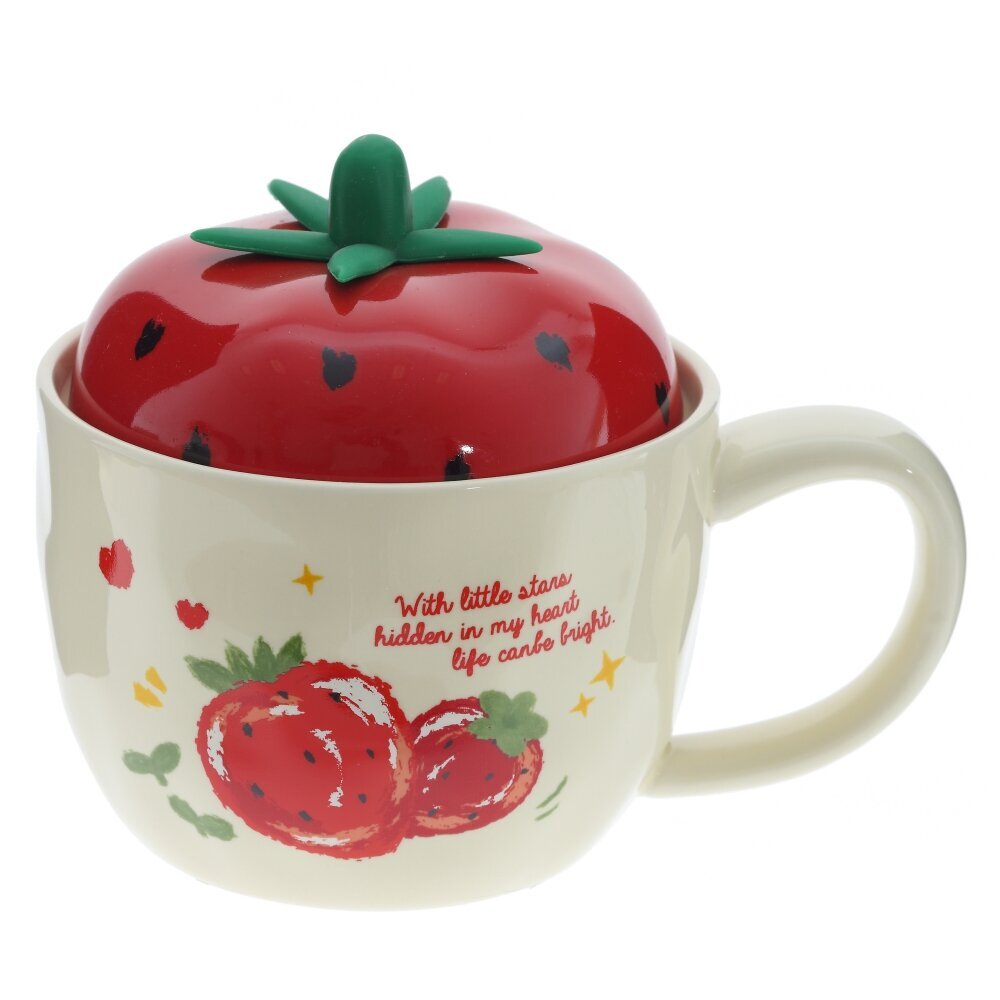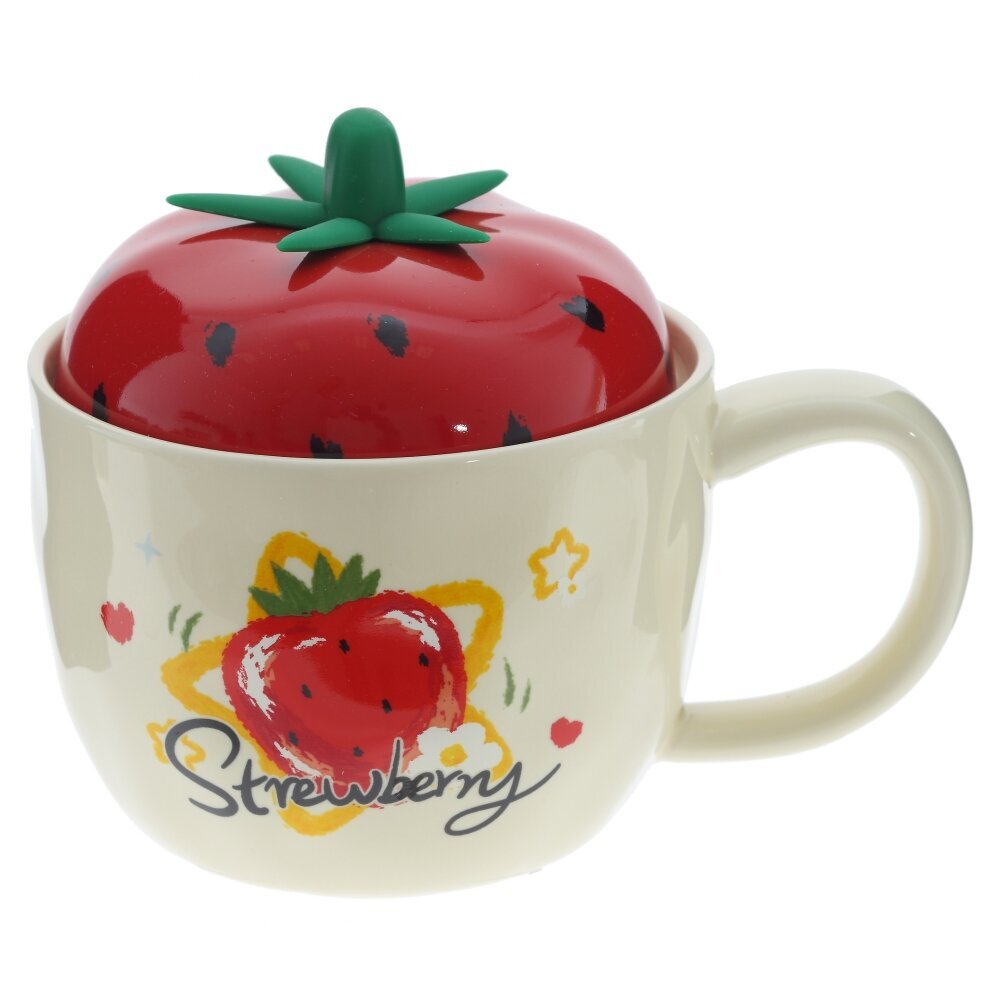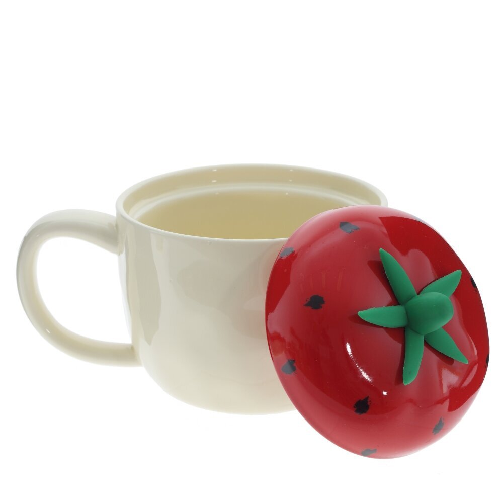 Очаровательная керамическая кружка с крышкой объёмом 300 мл. Корпус молочно?кремового оттенка украшен рисунком спелой клубники и надписью Strawberry, вокруг — маленькие звездочки и сердечки. Крышка выполнена в виде яркой ягоды: глянцево?красная «клубничка» с зелёным чашелистиком служит удобной ручкой, плотно прилегает и помогает дольше сохранять тепло напитка, защищая его от пыли и случайных брызг. Широкая округлая ручка комфортно лежит в руке. Кружка подходит для чая, кофе, какао и травяных настоев, уместна дома и в офисе. Прочная керамика сохраняет вкус, легко моется и делает изделие приятным на ощупь. Отличный вариант для подарка любителям милой и необычной посуды. Представлено в трех вариантах.