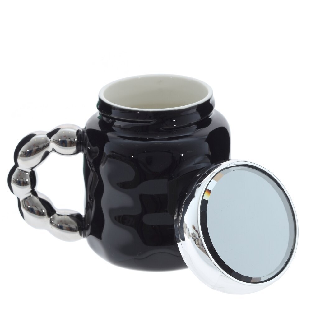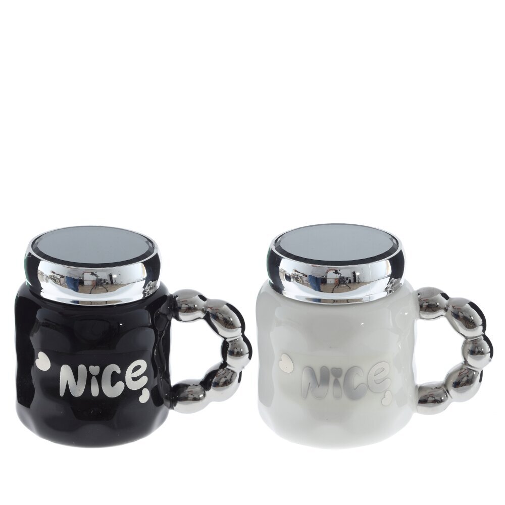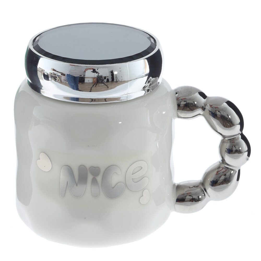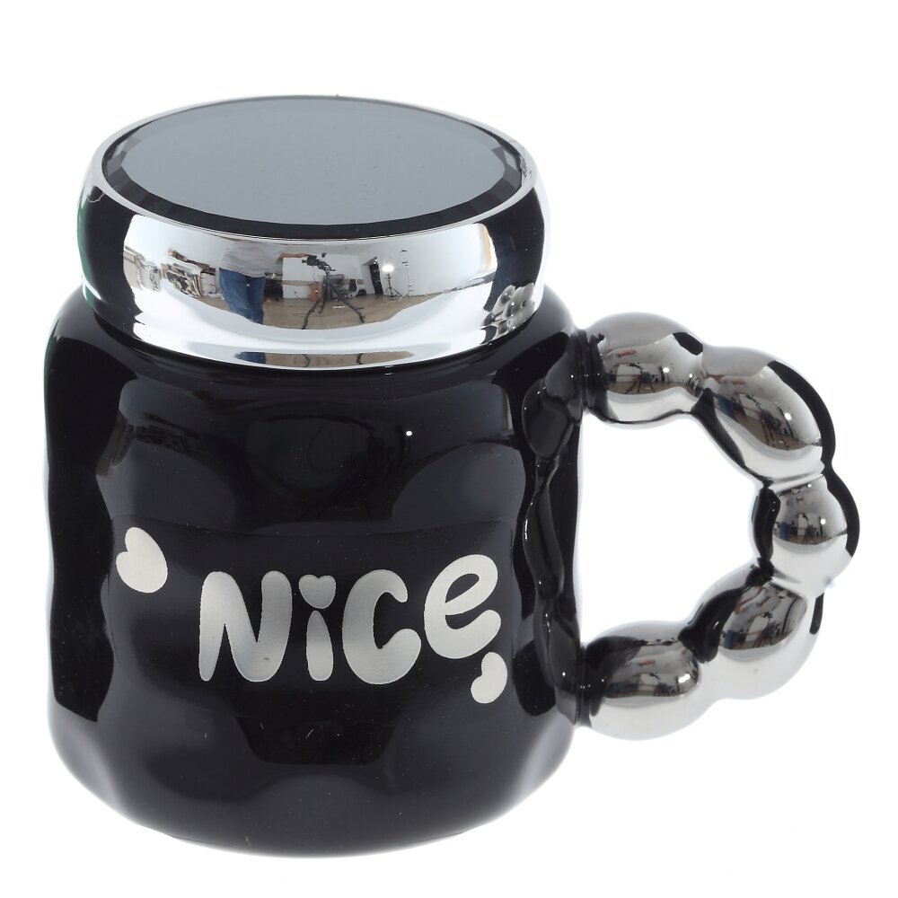 Стильная кружка с крышкой объемом 400 мл для чая, кофе и других горячих напитков. Корпус выполнен из прочного фарфора с мягкими волнистыми гранями, удобная фигурная ручка с хромированным эффектом надежно лежит в руке. Крышка оснащена зеркальной стеклянной верхней частью и полимерным уплотнением, что помогает дольше сохранять температуру и защищает напиток от пыли. Представлено в двух вариантах — черном и белом — с лаконичной надписью NICE на корпусе. Глянцевая поверхность легко очищается, подходит для дома и офиса, станет приятным подарком.