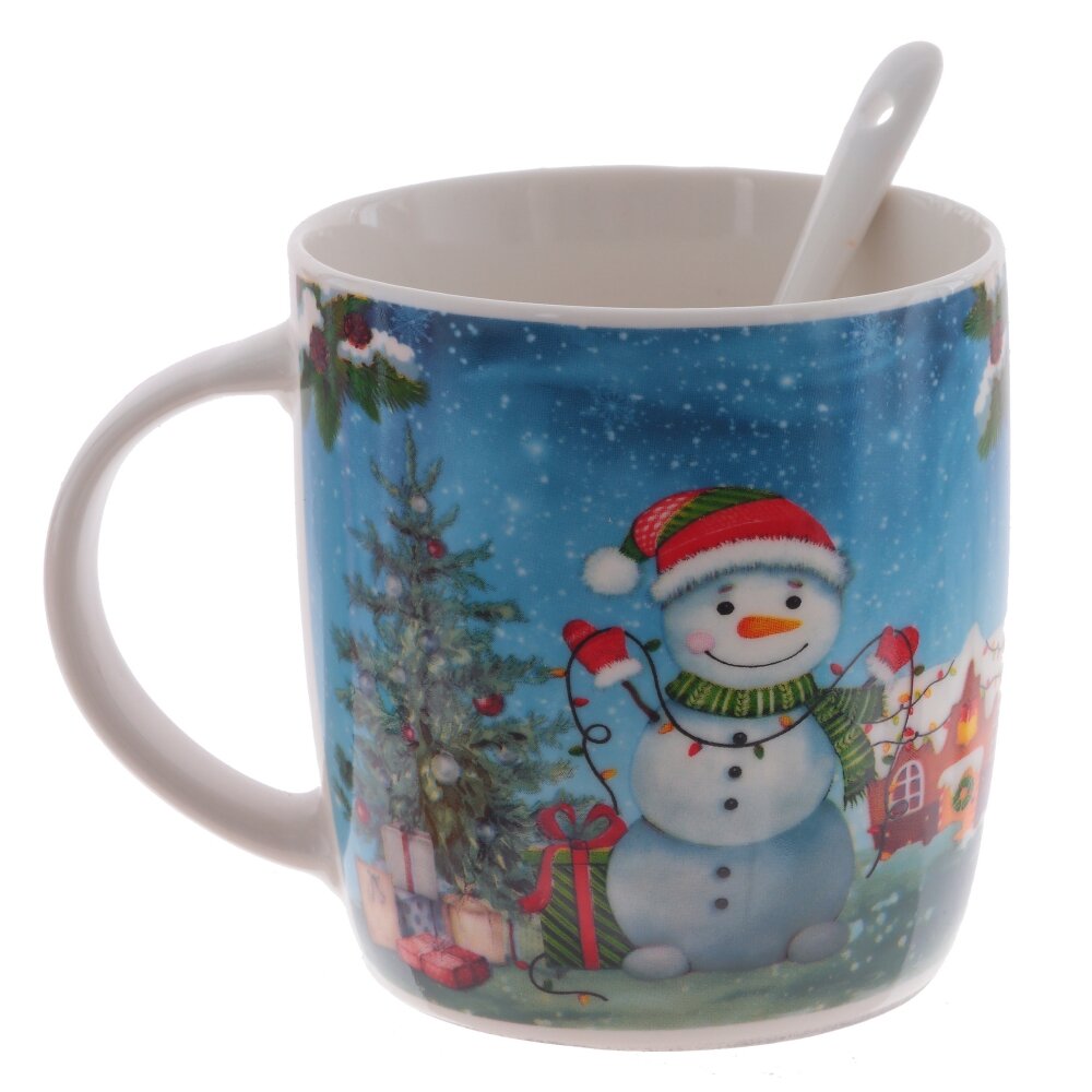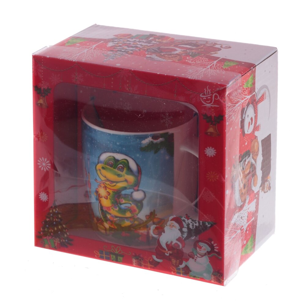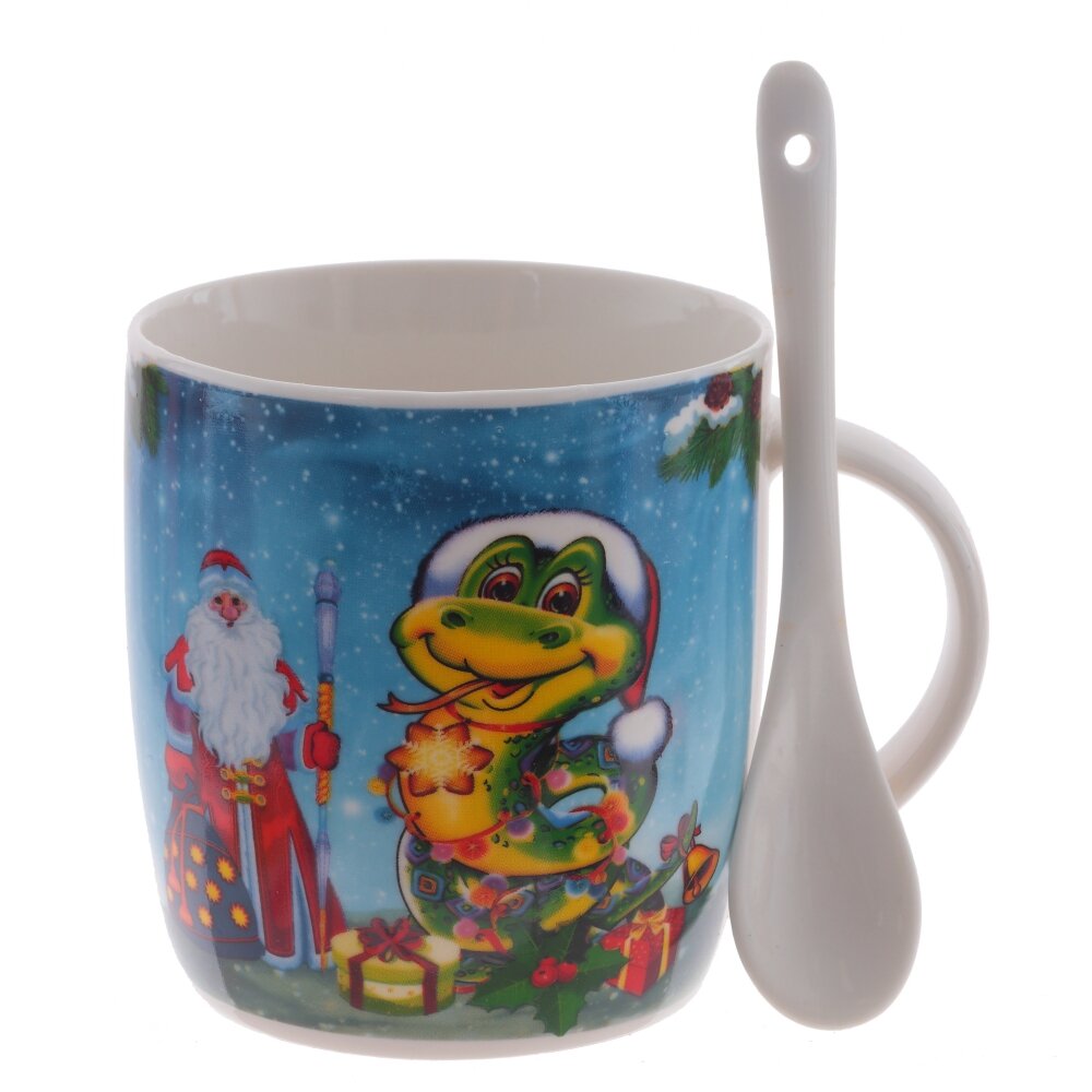 Кружка с ложкой из высококачественного фарфора с удобной ручкой и уникальным дизайном. Яркий новогодний сюжет на кружке изображает деда Мороза, снеговика и веселую зеленую змейку - символ 2025 года. Яркая красочная коробка с прозрачной крышкой, делает эту кружку идеальным подарком для любителя чая или кофе.