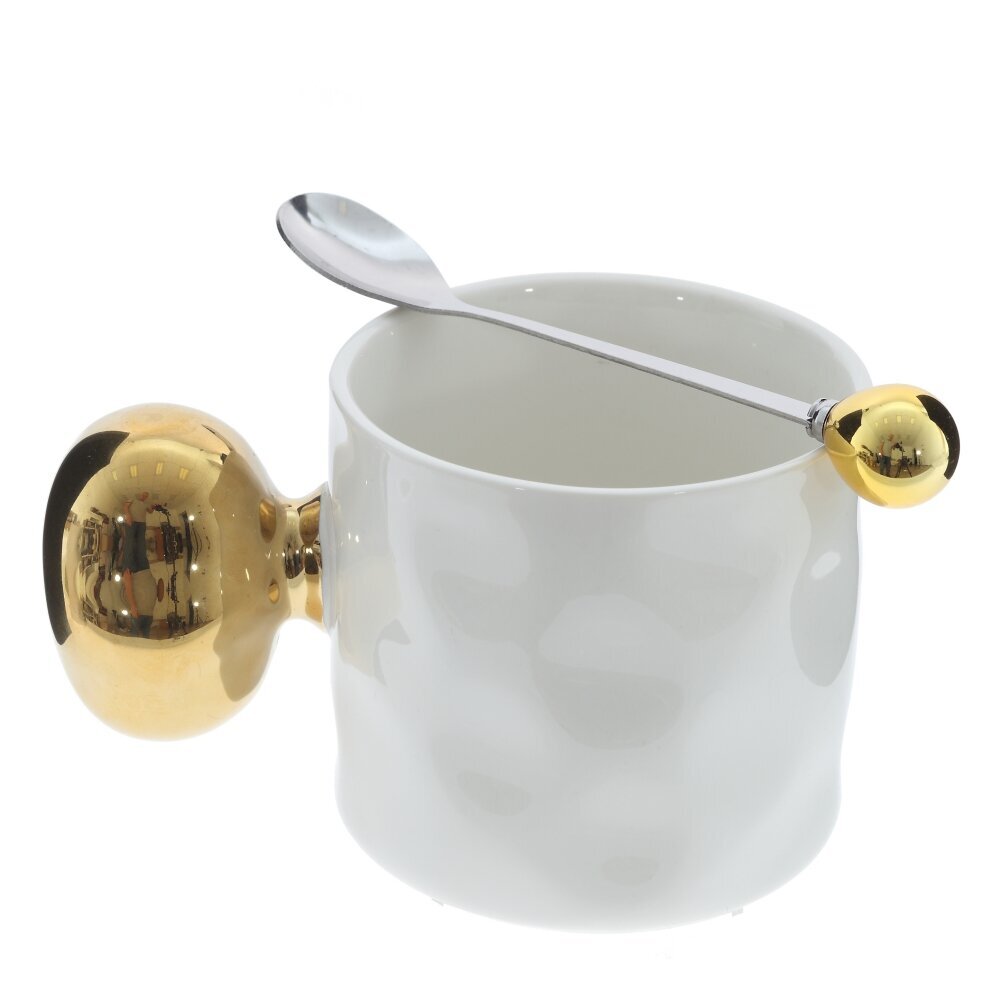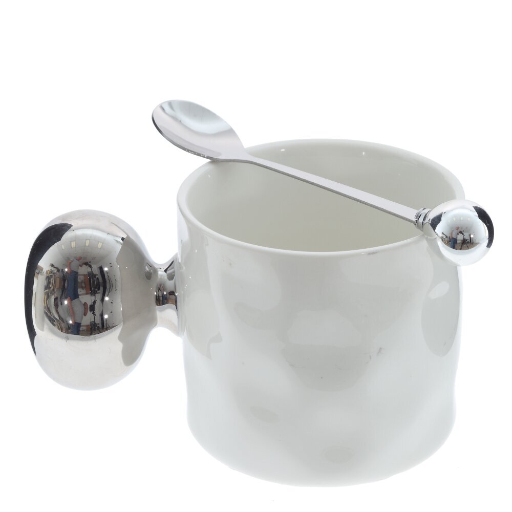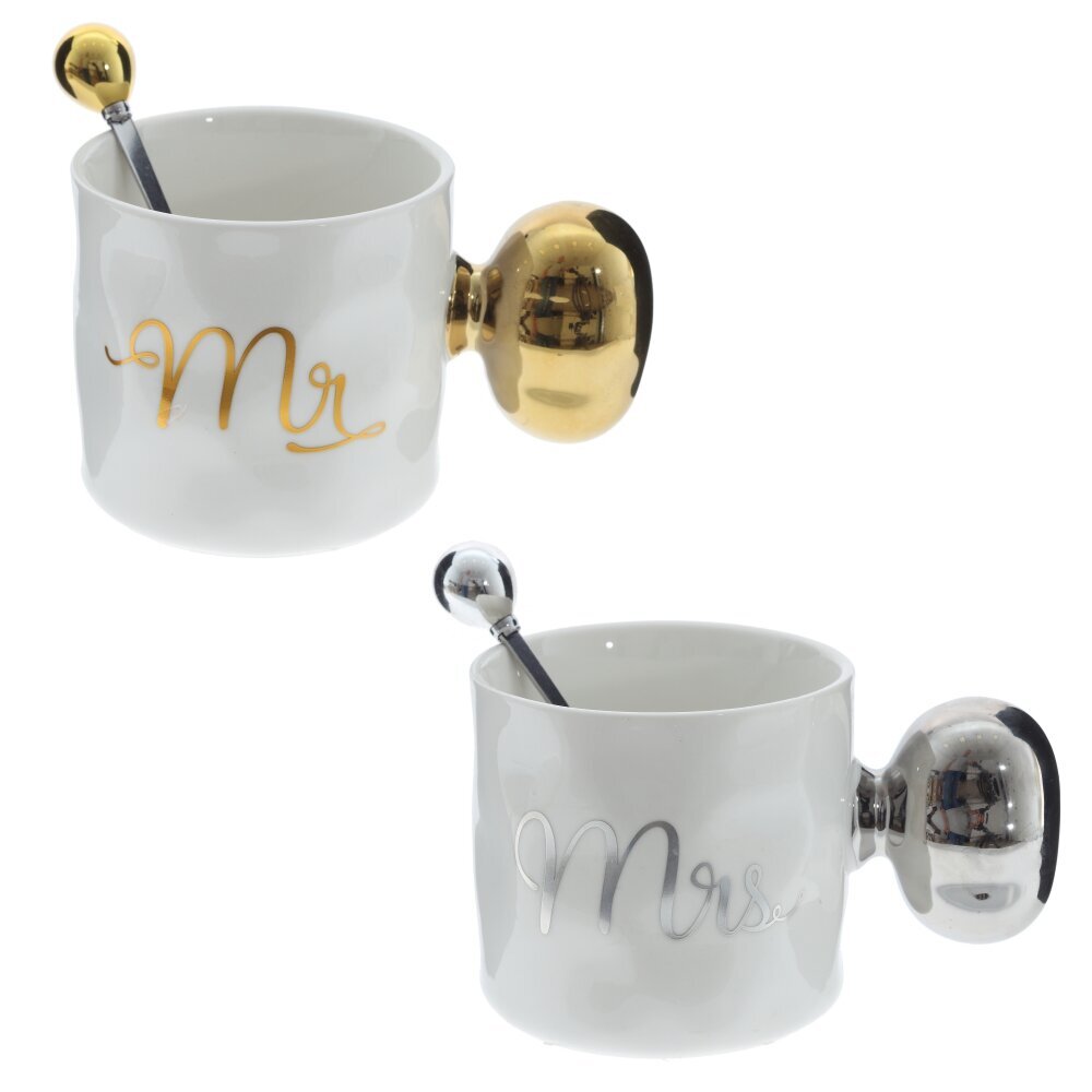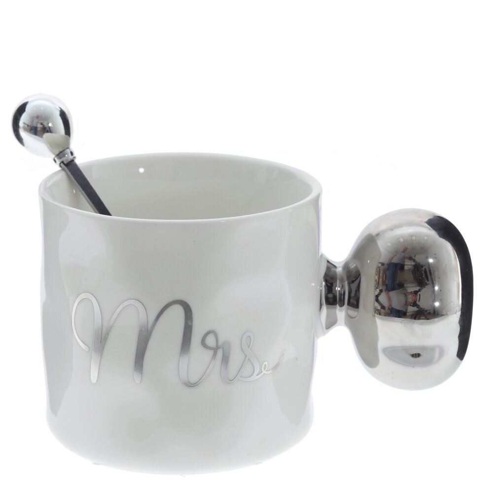Стильная кружка с ложкой объёмом 300 мл — эффектный акцент для утреннего кофе и вечернего чая. Корпус молочно-белого цвета с глянцевой фактурой, на боковой стороне изящная каллиграфическая надпись: вариант Mr с золотистыми акцентами и вариант Mrs с серебристыми. Фирменная деталь — крупная округлая ручка с зеркальным покрытием в тон, а в комплекте — ложечка с шариком на конце. Два цветовых решения позволяют собрать гармоничную парную комбинацию для него и для неё. Идея подарка на свадьбу, помолвку или новоселье; вместимость и современный дизайн подойдут для ежедневного использования. Представлено в двух вариантах.