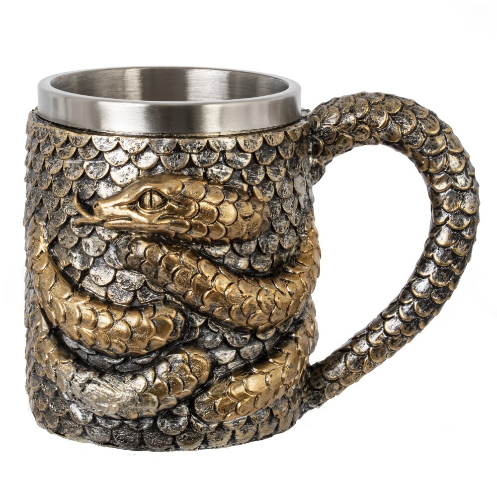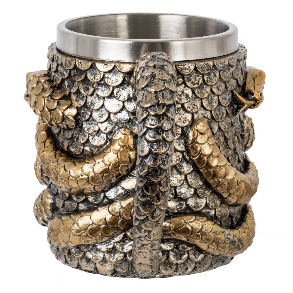 Эта кружка, изготовленная из нержавеющей стали и акриловой смолы, станет настоящей находкой для любителей пива и стильных предметов интерьера. Она идеально подходит для комфортного удержания в руке. Объем 450 мл позволяет налить в нее достаточное количество любимого напитка, обеспечивая приятные моменты расслабления и наслаждения. Одной из самых привлекательных черт данной кружки является ее внешний декор: объемная змея, плавно перетекающая в ручку. Эта деталь придает изделию оригинальность. Кружка устойчива к повреждениям и легко очищается, что делает ее идеальным выбором для ежедневного использования. Благодаря использованию нержавеющей стали, напитки сохраняют свою температуру дольше. Дизайн и функциональность делают эту кружку обязательным атрибутом для баров и веселых вечеринок, а также стильным дополнением к вашей коллекции посуды.