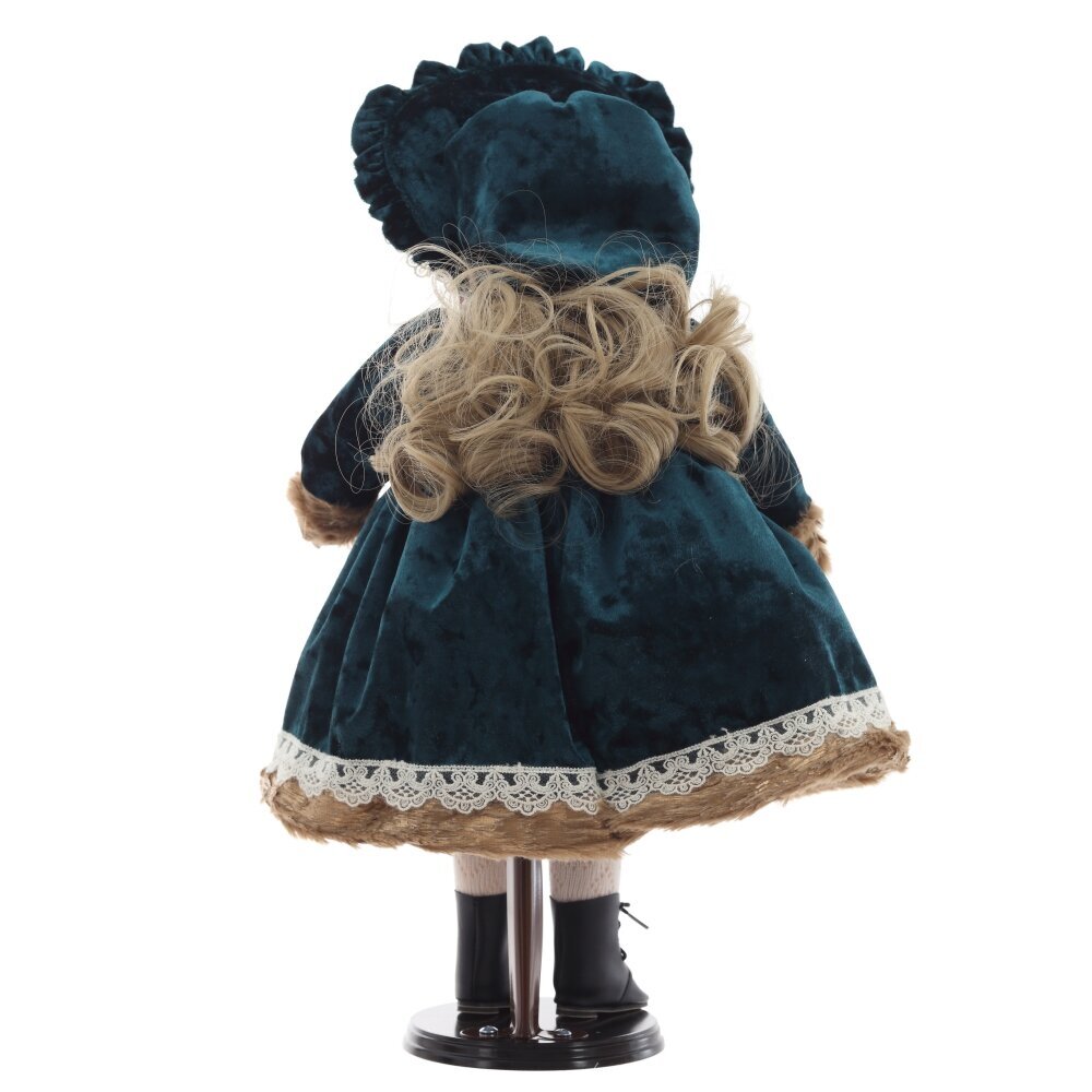 Элегантная фарфоровая кукла в винтажном стиле станет прекрасным дополнением любой коллекции или изысканным подарком. Она одета в роскошное платье из тёмно-зелёного бархата с ажурными кружевами и меховой отделкой. Наряд дополняет шляпка с бантом и маленькая сумочка в тон платью. Детально проработанное лицо придаёт кукле живой и нежный вид. Обута в стильные чёрные ботинки, что делает её образ завершённым. Эта кукла – не просто игрушка, а настоящее произведение искусства, которое украсит интерьер и порадует ценителей изысканных вещей.