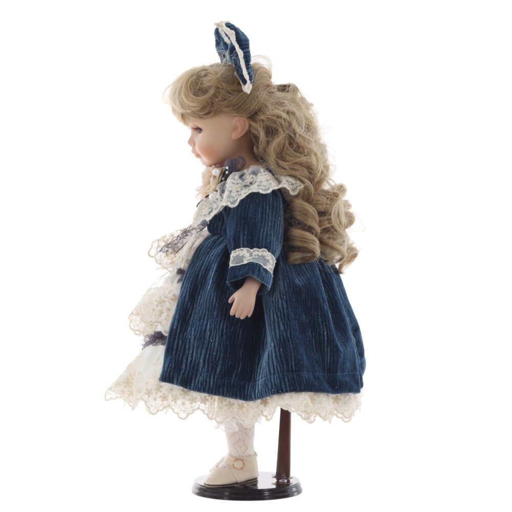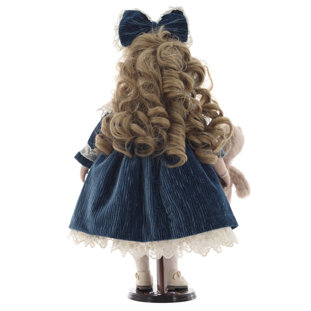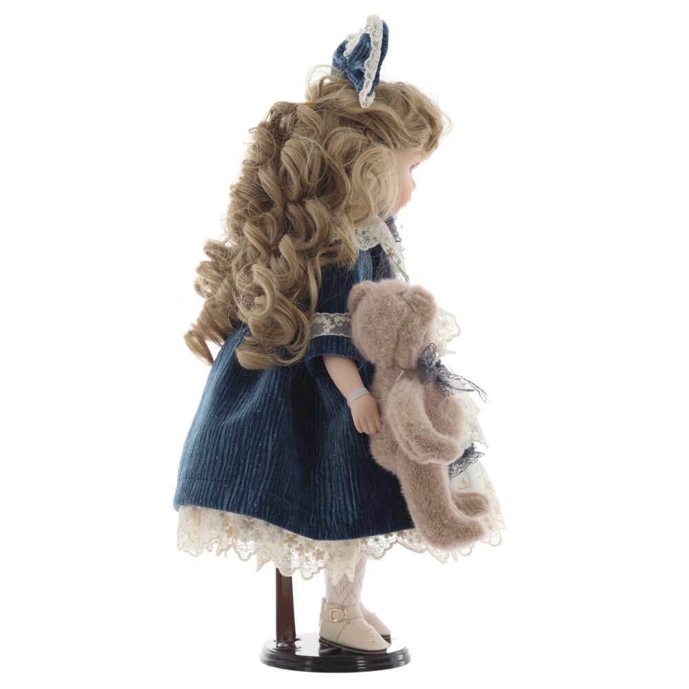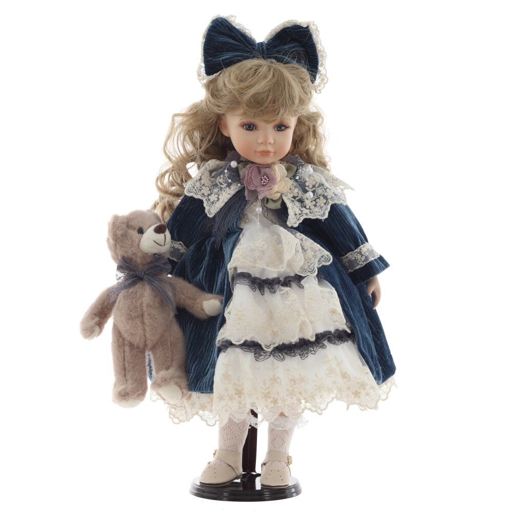 Кукла, созданная с любовью и вниманием к деталям. Она очаровывает своим нежным взглядом, милой улыбкой и трогательной простотой. У нее нежное фарфоровое лицо с реалистичной росписью, голубые глаза и волнистые светлые волосы, украшенные большим бархатным бантом. Кукла облачена в изысканное платье с кружевными вставками и вышивкой, дополненное бархатным синим пальто. В руках она держит милого плюшевого мишку, который подчеркивает ее очаровательный и трогательный образ. Деревянная подставка, на которой стоит кукла, добавляет ей устойчивости и завершает образ. Кукла станет чудесным подарком для девочки, а также для коллекционеров кукол. Она украсит любой интерьер и подарит своим обладателям тепло и душевную радость.