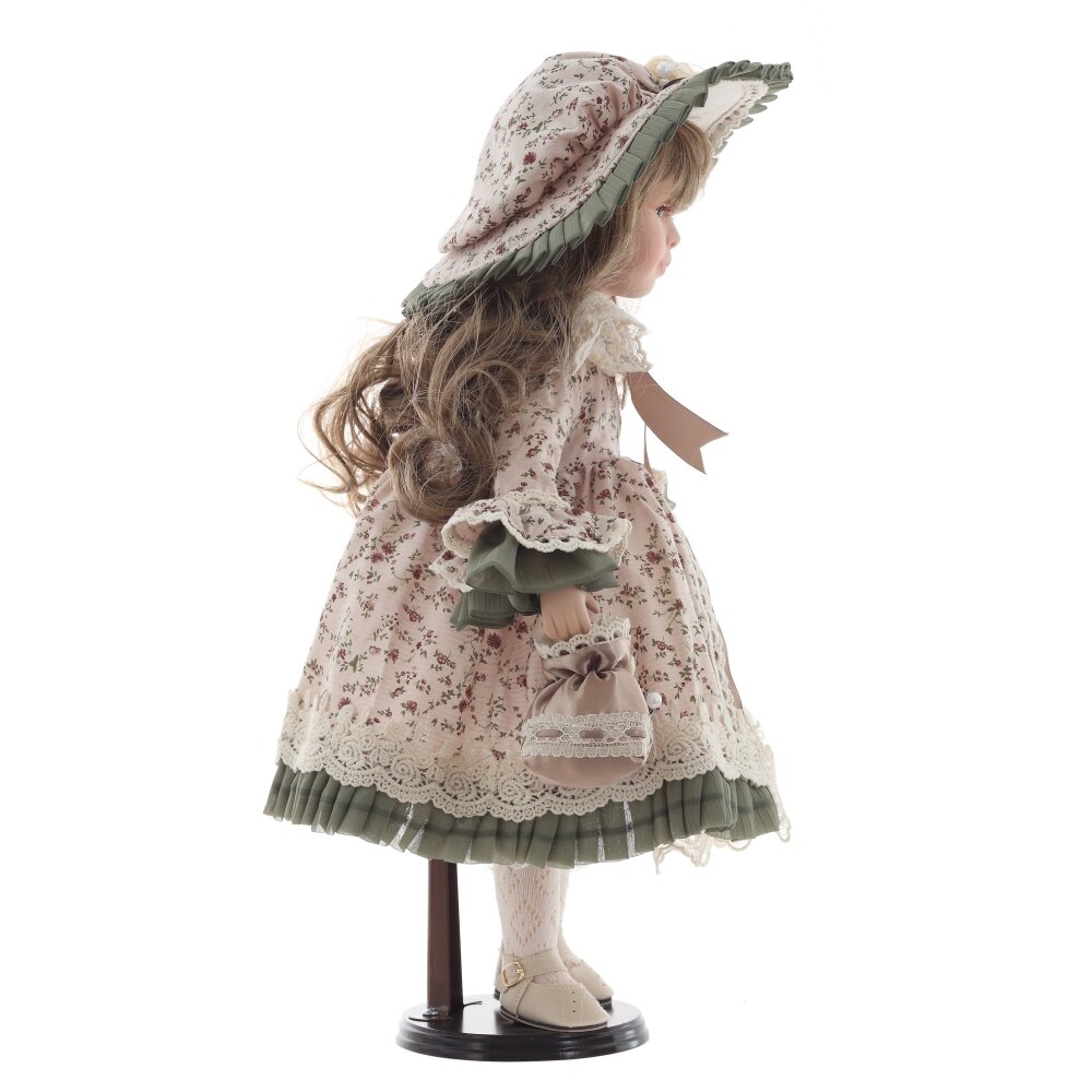 Элегантная коллекционная кукла в винтажном стиле станет прекрасным украшением интерьера и отличным подарком для ценителей изысканных вещей. У нее нежное фарфоровое лицо с аккуратно прорисованными чертами, длинные волнистые волосы и выразительный взгляд. Кукла одета в нарядное платье с цветочным узором, украшенное кружевом и лентами, а также носит изысканную шляпку с рюшами. В руках она держит маленькую корзинку с цветами, дополняющую утонченный образ. Изящные ботиночки и вязаные носочки завершают антураж настоящей аристократической дамы. Такая кукла станет отличным дополнением коллекции или изысканным подарком для любителей винтажных аксессуаров.