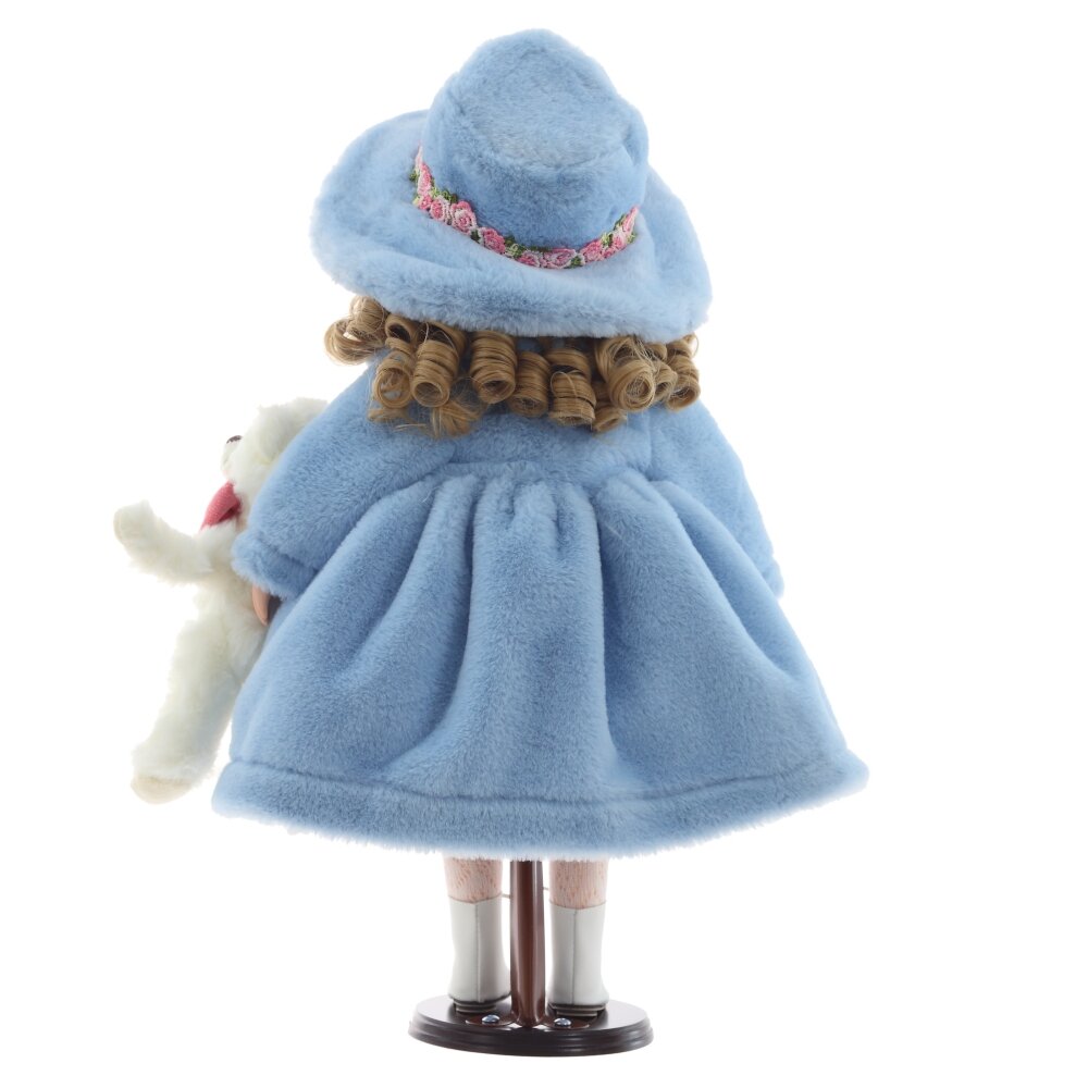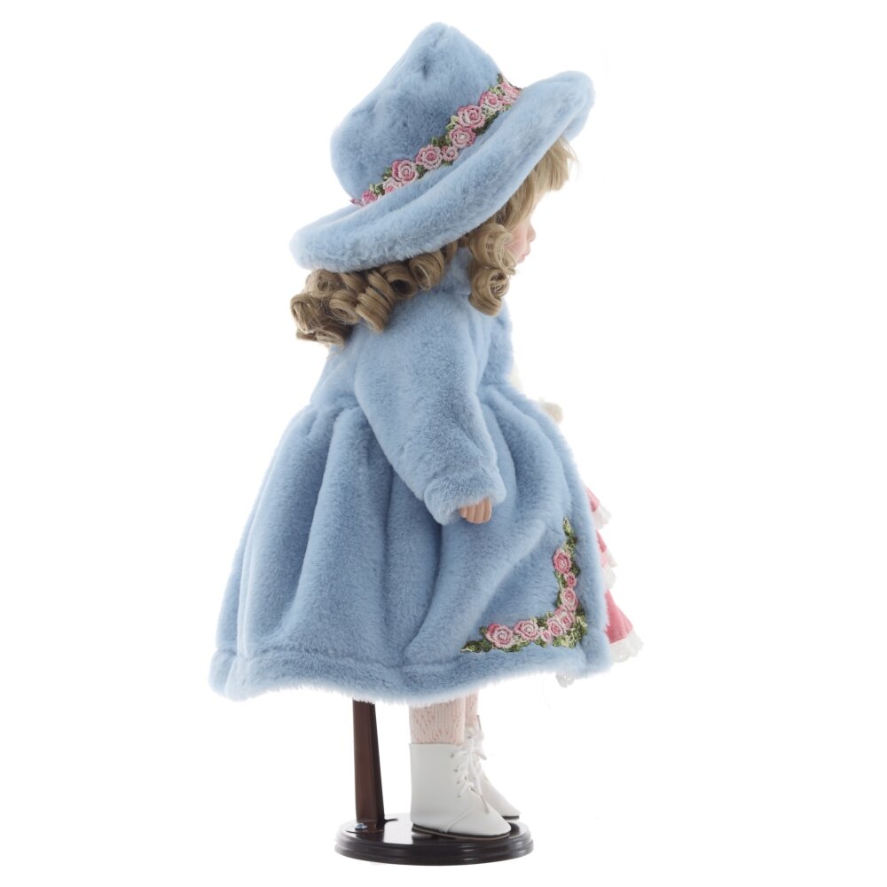 Элегантная кукла в красивом наряде — это идеальный подарок для коллекционеров и детей. У неё нежные черты лица, выразительные голубые глаза и вьющиеся светлые волосы. Кукла одета в изысканное розовое платье с кружевной отделкой, а сверху на ней роскошное голубое пальто с капюшоном, украшенное вышивкой. В руках она держит мягкого белого медвежонка с розовым бантом. Детализированные сапожки и чулочки дополняют образ, делая его по-настоящему изысканным. Она украсит любой интерьер и подарит своим обладателям тепло и душевную радость.