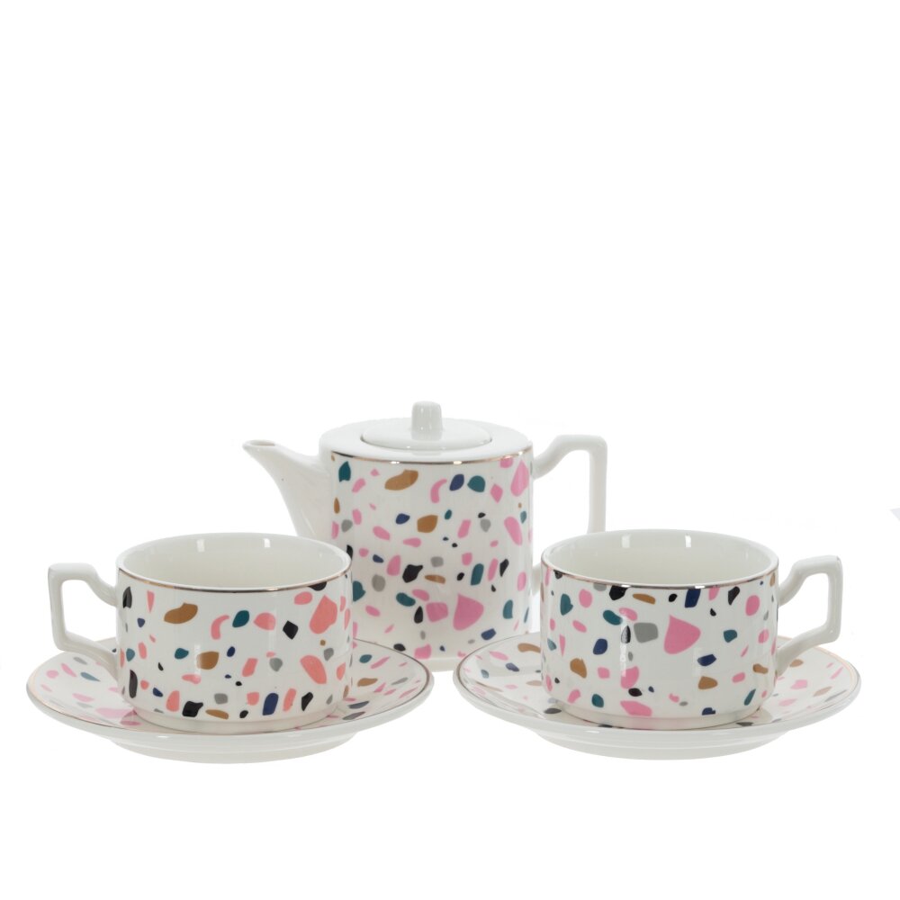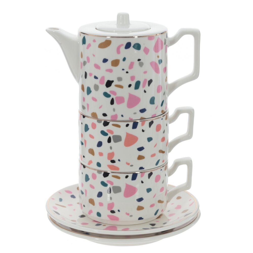 Набор чайный на 2 персоны включает в себя 5 предметов, что делает его идеальным для уютного чаепития вдвоем. Он состоит из двух чашек объемом 250 мл, двух блюдец и чайника, который вмещает 450 мл напитка. Все предметы выполнены из высококачественного фарфора, что придает им не только эстетическую привлекательность, но и долговечность. Особенностью данного набора является его уникальная возможность компактного хранения: все элементы удобно ставятся друг на друга, что экономит место и придает интерьерам интересный акцент. Этот набор станет отличным подарком для молодоженов, друзей или для себя, добавляя нотку уюта и стиля в каждый чаепитие. Такой чайный набор не только практичный, но и может служить элементом декора.