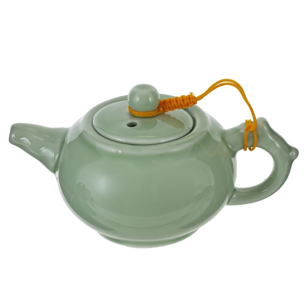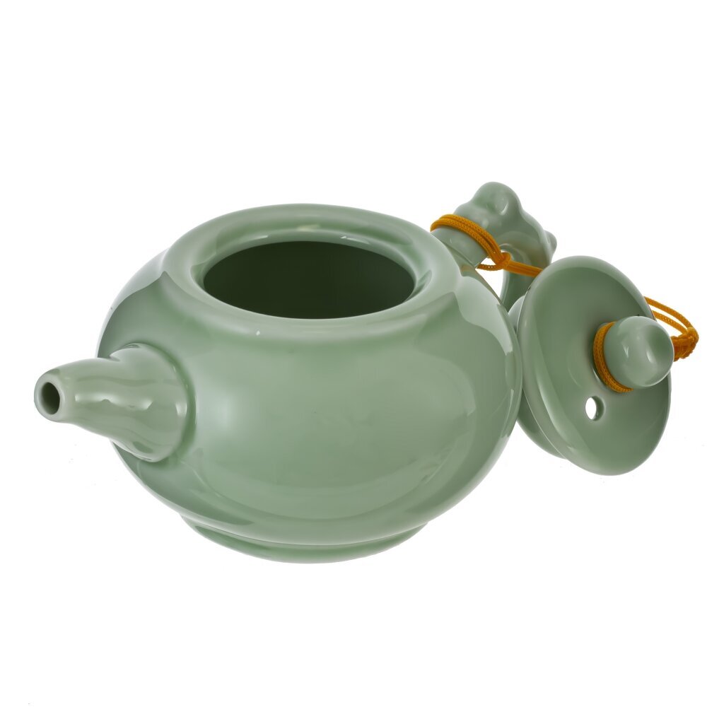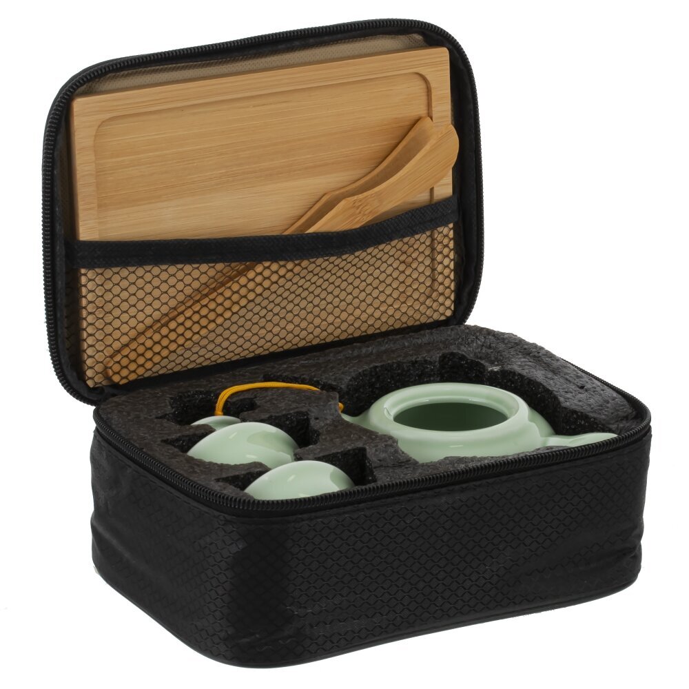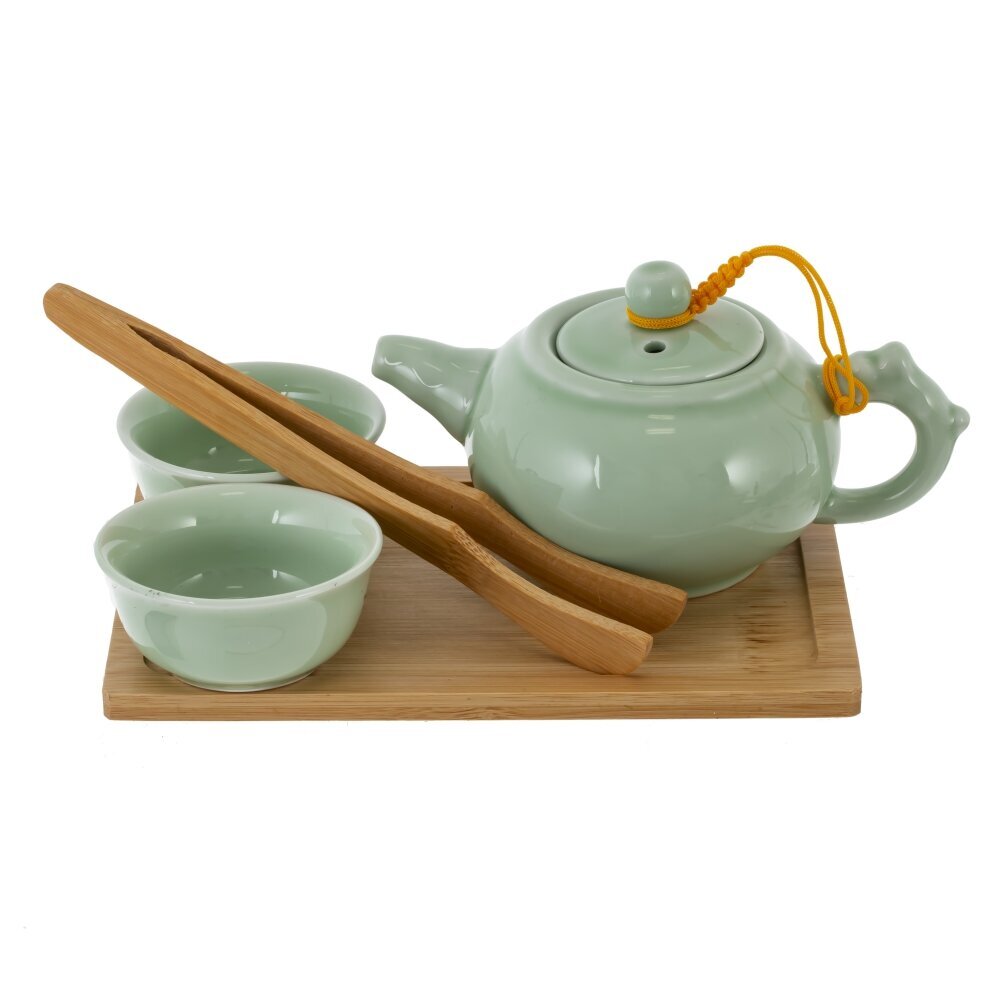 Набор для чайной церемонии на 2 персоны, выполненный из керамики и дерева. Компактный керамический чайник нежно?зеленого оттенка с удобным носиком и круглой крышкой, закрепленной декоративным шнурком. Две пиалы в том же цвете образуют гармоничный комплект. Бамбуковый поднос обеспечивает аккуратную подачу и защищает поверхность стола, а деревянные щипцы помогают бережно обращаться с горячими пиалами, соблюдая традиции гунфу?ча. Набор создает атмосферу спокойствия, подчеркивает вкус и аромат чая, уместен как для повседневного ритуала, так и в качестве стильного подарка. Рекомендуется ручная мойка и деликатный уход за деревянными элементами.