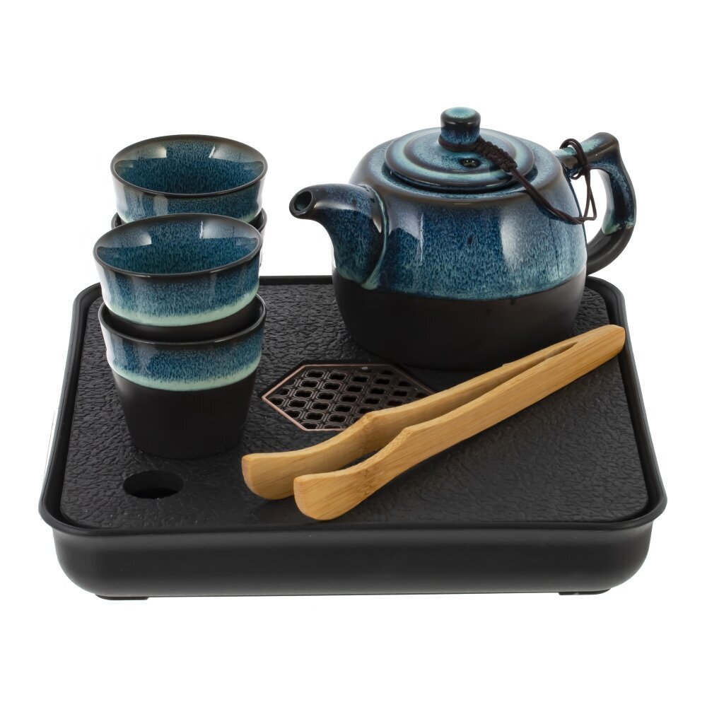 Элегантный набор для чайной церемонии на 4 персоны, сочетающий керамику, дерево и современные полимерные материалы. Компактная чабань из прочного полимера с фактурной поверхностью и дренажной решёткой аккуратно собирает проливы и защищает стол. Керамический заварочный чайник с плавным переходом синей глазури удерживает тепло и раскрывает аромат листа, крышка зафиксирована шнурком для удобства. Четыре керамические пиалы с той же выразительной глазурью образуют гармоничный комплект и приятны на ощупь. Деревянные (бамбуковые) щипцы помогают бережно работать с горячими элементами и поддерживать чистоту сервировки. Набор практичен в уходе, устойчив и подходит для домашних чаепитий, офиса или в качестве подарка ценителям ритуала.