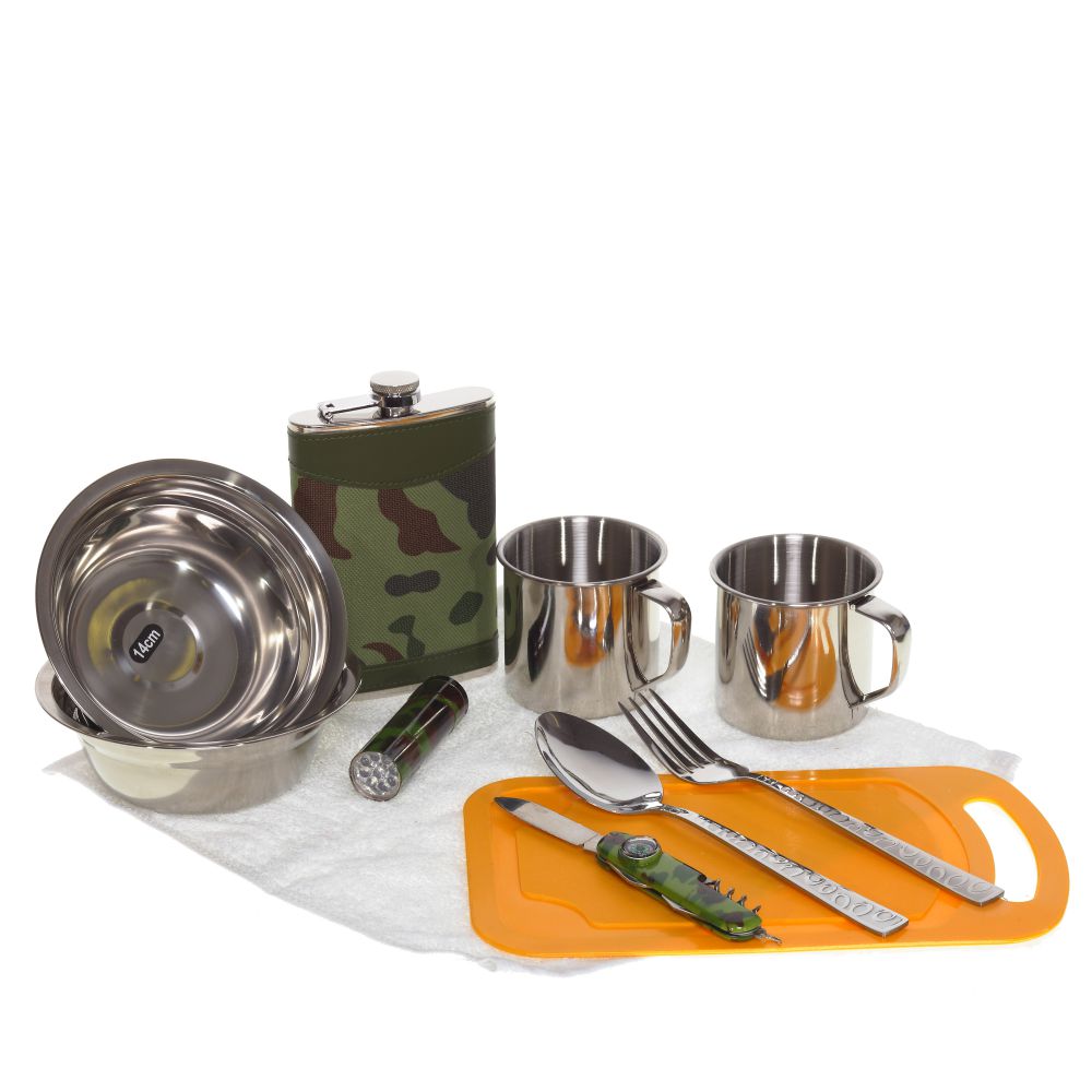 Набор дорожный из 11-ти предметов: фляжка 270 мл, 2 кружки 250 мл, 2 миски 400 мл, ложка, вилка, МФУ нож, разделочная доска, полотенце 30х30 см, фонарик. Изготовлен из коррозионностойкой стали, полимерных и текстильных материалов. Размер: L27 W10 H20 см. Упаковка-коробка.