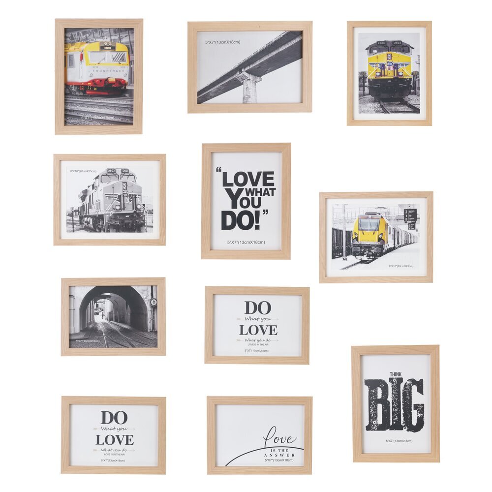 Набор из 11 фоторамок в едином светло-деревянном оттенке — готовое решение для создания домашней фотогалереи. Лаконичный тонкий профиль подчеркивает изображение и подходит к современным и сканди-интерьерам. В комплект входят рамки разных форматов, среди них 13*18 и 20*25 см, что позволяет чередовать снимки и постеры, комбинируя вертикальную и горизонтальную ориентации. Прозрачная защитная вставка сохраняет четкость фотографий, а нейтральный цвет обрамления гармонирует как с черно?белыми, так и с цветными кадрами. Демонстрационные листы с графикой и изображениями поездов подсказывают идеи раскладки, но легко заменяются на ваши фотографии, детские рисунки или небольшие принты. Такой комплект удобно размещать на одной стене или распределять по комнатам, создавая цельный стиль интерьера. Отличный выбор для гостиной, спальни, коридора и в подарок.