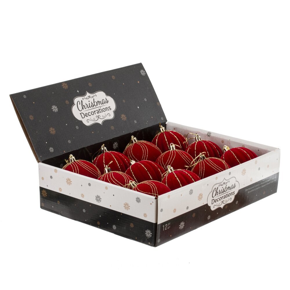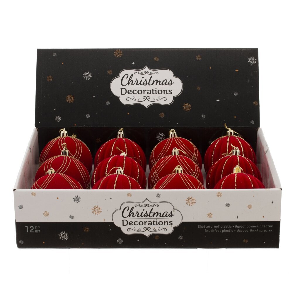 Набор состоит из 12 изысканных новогодних шаров насыщенного красного цвета, каждый из которых покрыт мягким бархатистым напылением, создающим эффект глубины и роскоши. Элегантный золотой декор придаёт игрушкам праздничный блеск и утонченность. Эти шары станут великолепным украшением для новогодней ели, добавив в интерьер атмосферу уюта, тепла и классической праздничной элегантности. Их можно использовать как для традиционного, так и для современного оформления.