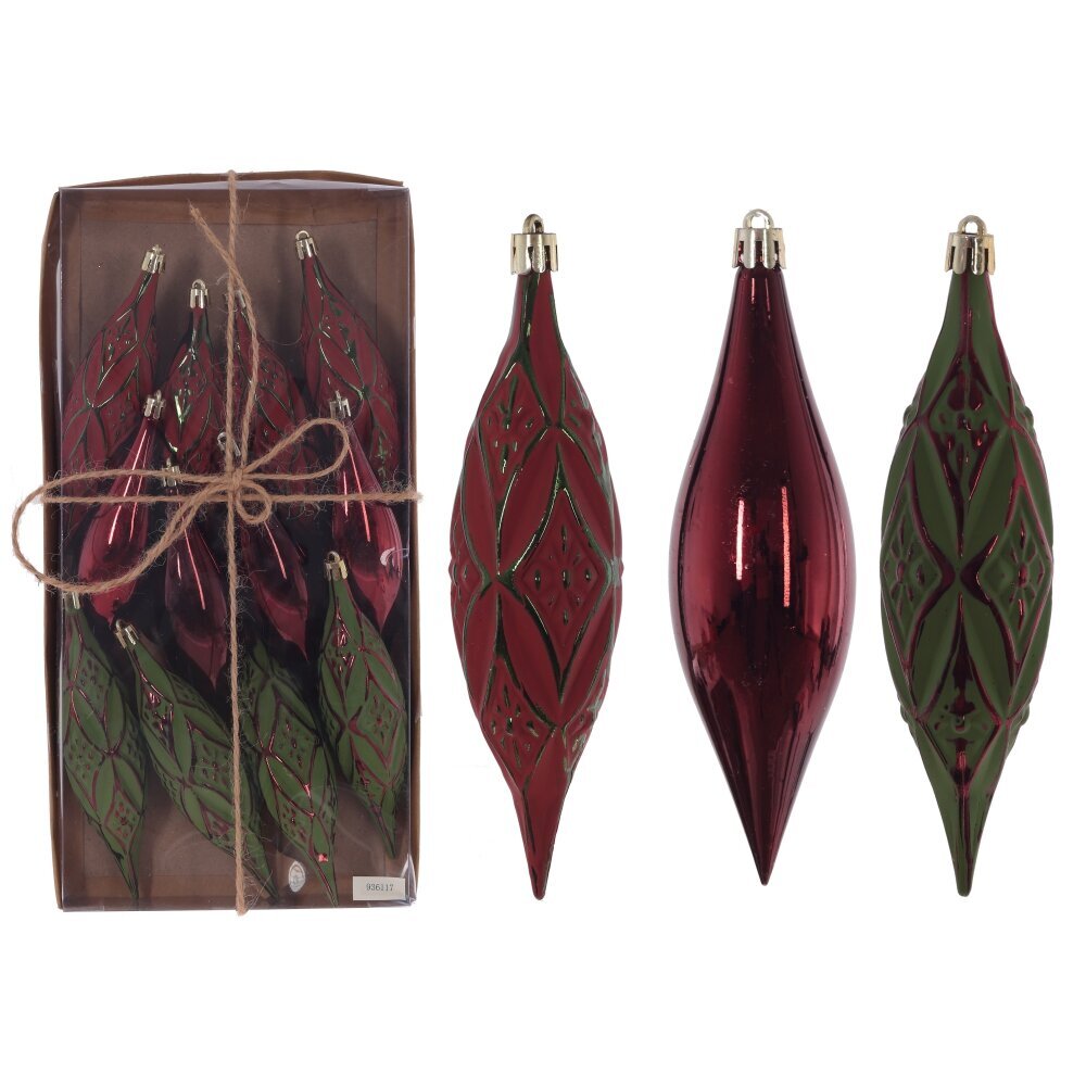 Украшение новогоднее "Капля" - это потрясающий набор из 12 штук, который придаст вашей елке изысканный и стильный облик. В наборе представлены капли высотой 16 см, окрашенные в красные и зеленые оттенки. Четыре глянцевые капли в ярком красном цвете, отражающие свет как зеркало, и восемь матовых капель в красной и зеленой гамме с изящным ромбовидным узором. Все эти элементы великолепно сочетаются, создавая уникальный и элегантный дизайн, который подарит вашей новогодней елке великолепный вид.