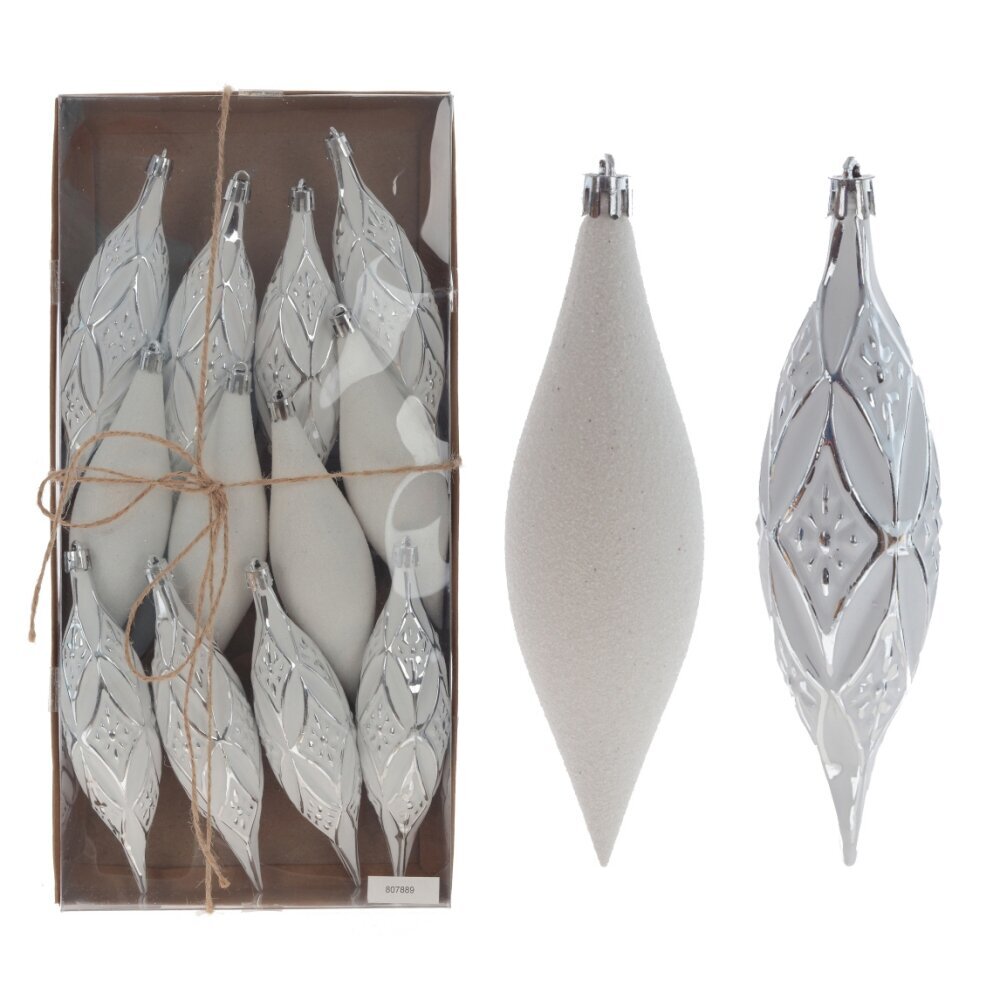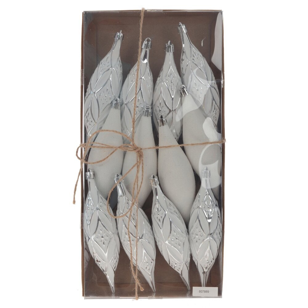 Украшение новогоднее "Капля" - это изысканный набор из 12 штук, который станет ярким акцентом на вашей елке. В наборе представлены изящные белые капли высотой 16 см, из которых четыре покрыты снежным глиттером , а восемь имеют матовую поверхность с ромбовидным серебрянным орнаментом. Эти утонченные декорации отлично сочетаются между собой, создавая элегантный образ для вашей елки. Роскошные белые капли придадут праздничного настроения и добавят изысканности вашему интерьеру.